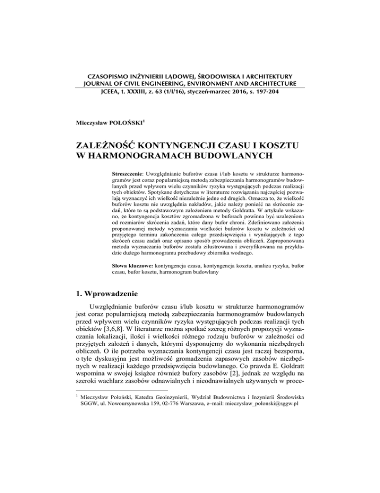 Mieczysław POŁO SKI1 ZALE NO KONTYNGENCJI CZASU I KOSZTU W HARMONOGRAMACH BUDOWLANYCH Streszczenie: Uwzgl dnianie buforów czasu i/lub kosztu w strukturze harmonogramów jest coraz popularniejsz metod zabezpieczania harmonogramów budowlanych przed wpływem wielu czynników ryzyka wyst puj cych podczas realizacji tych obiektów. Spotykane dotychczas w literaturze rozwi zania najcz ciej pozwalaj wyznaczy ich wielko niezale nie jedne od drugich. Oznacza to, e wielko buforów kosztu nie uwzgl dnia nakładów, jakie nale y ponie na skrócenie zada , które to s podstawowym zało eniem metody Goldratta. W artykule wskazano, e kontyngencja kosztów zgromadzona w buforach powinna by uzale niona od rozmiarów skrócenia zada , które dany bufor chroni. Zdefiniowano zało enia proponowanej metody wyznaczania wielko ci buforów kosztu w zale no ci od przyj tego terminu zako czenia całego przedsi wzi cia i wynikaj cych z tego skróce czasu zada oraz opisano sposób prowadzenia oblicze . Zaproponowana metoda wyznaczania buforów została zilustrowana i zweryfikowana na przykładzie du ego harmonogramu przebudowy zbiornika wodnego. Słowa kluczowe: kontyngencja czasu, kontyngencja kosztu, analiza ryzyka, bufor czasu, bufor kosztu, harmonogram budowlany 1. Wprowadzenie Uwzgl dnianie buforów czasu i/lub kosztu w strukturze harmonogramów jest coraz popularniejsz metod zabezpieczania harmonogramów budowlanych przed wpływem wielu czynników ryzyka wyst puj cych podczas realizacji tych obiektów [3,6,8]. W literaturze mo na spotka szereg ró nych propozycji wyznaczania lokalizacji, ilo ci i wielko ci ró nego rodzaju buforów w zale no ci od przyj tych zało e i danych, którymi dysponujemy do wykonania niezb dnych oblicze . O ile potrzeba wyznaczania kontyngencji czasu jest raczej bezsporna, o tyle dyskusyjna jest mo liwo gromadzenia zapasowych zasobów niezb dnych w realizacji ka dego przedsi wzi cia budowlanego. Co prawda E. Goldratt wspomina w swojej ksi ce równie bufory zasobów [2], jednak ze wzgl du na szeroki wachlarz zasobów odnawialnych i nieodnawialnych u ywanych w proce1 Mieczysław Poło ski, Katedra Geoin ynierii, Wydział Budownictwa i In ynierii rodowiska SGGW, ul. Nowoursynowska 159, 02-776 Warszawa, e–mail: [email protected] 198 M. Poło ski sie budowlanym, praktyczne wyznaczenie parametrów takich buforów jest bardzo trudne. Trudna i kosztowna wydaje si równie techniczna strona utrzymania w gotowo ci takich zasobów, zwłaszcza w odniesieniu do zasobów odnawialnych. Wspomniane trudno ci z kontyngencj zasobów skłoniły wielu badaczy do wniosku, e drugim elementem, którego kontyngencj powinno si bra pod uwag s rodki finansowe [1,5]. W literaturze mo na spotka metody wyznaczania rezerwowych wielko ci kosztów lokowanych w buforach, jednak zazwyczaj parametry buforów czasu i buforów kosztu wyznaczane s niezale nie jedne od drugich. A przecie od dawna rozpoznane jest istnienie zwi zku pomi dzy czasem realizacji ka dego zadania i całego przedsi wzi cia budowlanego i kosztem ich realizacji. Skoro stworzenie buforów czasu ł czy si najcz ciej ze skróceniem wst pnie planowanych czasów poszczególnych zada , a koszt wykonania zada w harmonogramie zale y od ich czasu, wielko ci buforów kosztu chroni ce te zadania powinny równie zale e od przyj tych czasów zada . W artykule wskazano na konieczno uzale nienia kontyngencji kosztu od terminu realizacji harmonogramu i wielko ci skrócenia wst pnie planowanych czasów zada . Podano najwa niejsze zało enia proponowanego rozwi zania, a opisany sposób wyznaczania buforów czasu i kosztu został zilustrowany i zweryfikowany na przykładzie du ego harmonogramu przebudowy zbiornika wodnego. 2. Zało enia proponowanej metody Zaproponowany w artykule sposób wyznaczania współzale nych wielko ci kontyngencji czasu i kosztów oparty jest na nast puj cych zało eniach: podstaw wyznaczenia warto ci kontyngencji czasu i kosztu jest harmonogram sieciowy przedsi wzi cia ze zdefiniowanymi, wyj ciowymi czasami i kosztami wszystkich zada , kontyngencja czasu i kosztu wyznaczana jest dla wspólnych buforów zlokalizowanych w strukturze sieci zale no ci harmonogramu, skrócenie czasu zada cz ciowo chronione jest rezerw czasu zgromadzon w buforach, a cz ciowo słu y przyspieszeniu realizacji przedsi wzi cia, skrócenie czasu ka dego zadania poni ej czasu wyj ciowego generuje dodatkowy koszt, zale ny od wielko ci skrócenia, koszt skrócenia zada cz ciowo zostanie przypisany bezpo rednio do skracanych zada , a cz ciowo do chroni cych ich buforów, maksymalne skrócenie ka dego zadania uwarunkowane jest mo liwo ciami technologicznymi i organizacyjnymi analizowanego przedsi wzi cia, obliczane koszty przedsi wzi cia powinny obejmowa zarówno koszty bezporednie zada , jak i koszty po rednie dla całego przedsi wzi cia, na wielko buforów kosztu składaj si dwa składniki: zabezpieczenie kosztów wykonania zada wyj ciowych (bez skrócenia) i kontyngencja kosztów wynikaj ca z zało onego skrócenia czasu zadania i zwi zanych z tym kosztów. Zale no kontyngencji czasu i kosztu w harmonogramach budowlanych 199 3. Przykład obliczeniowy Sposób obliczenia wielko ci buforów czasu i kosztów na podstawie zaproponowanych zało e zostanie przedstawiony na przykładzie jednopunktowego harmonogramu przebudowy zbiornika małej retencji w Małomicach wraz z infrastruktur towarzysz c [7]. Poniewa cały szczegółowy harmonogram liczył 298 zada , w artykule przestawiono jego bardzo uproszczon wersj , zachowuj c jednak podstawowe etapy robót i ich powi zania. Struktura uproszczonego harmonogramu powstała na podstawie struktury SPP harmonogramu szczegółowego, a czasy i koszty poszczególnych skomasowanych zada zostały wyznaczone jako czasy i koszty poszczególnych zada sumarycznych w pierwotnym harmonogramie. Dzi ki temu zachowano przebieg cie ki krytycznej i podstawowe parametry harmonogramu wyj ciowego: wst pny czas realizacji 264 dni robocze i koszt 8 935 