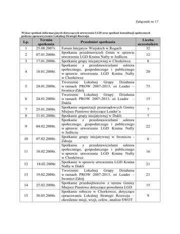 Załącznik nr 17 Wykaz spotkań informacyjnych dotyczących utworzenia LGD oraz spotkań konsultacji społecznych podczas opracowywania Lokalnej Strategii Rozwoju 1 Termin spotkania 25.08.2007r. 2 07.01.2008r. 3 17.01.2008r. 4 18.01.2008r. 5 24.01.2008r. 6 24.01.2008r. 7 25.01.2008r. 8 31.01.2008r. 9 04.02.2008r. 10 07.02.2008r. 11 18.02.2008r. 12 18.02.2008r 13 19.02.2008r. 14 25.02.2008r. 15 30.05.2008r. Lp. Przedmiot spotkania Forum Inicjatyw Wiejskich w Rogach Spotkanie przedstawicieli Gmin w sprawie utworzenia LGD Kraina Nafty w Jedliczu Spotkanie grupy inicjatywnej w Chorkówce Spotkanie z przedstawicielami sektora społecznego, gospodarczego i publicznego w sprawie utworzenia LGD Kraina Nafty w Chorkówce Tworzenie Lokalnej Grupy Działania w ramach PROW 2007-2013, oś Leader – Iwonicz-Zdrój Tworzenie Lokalnej Grupy Działania w ramach PROW 2007-2013, oś Leader – Dukla Spotkanie organizacji pozarządowych Gminy Miejsce Piastowe dotyczące Leader’a Spotkanie grupy inicjatywnej w Dukli Spotkanie z przedstawicielami sektora społecznego, gospodarczego i publicznego w sprawie utworzenia LGD Kraina Nafty w Jedliczu Spotkanie grupy inicjatywnej w Iwoniczu Zdroju Spotkanie z przedstawicielami sektora społecznego, gospodarczego i publicznego w sprawie utworzenia LGD Kraina Nafty w Chorkówce Spotkanie w sprawie utworzenia LGD Kraina Nafty w Dukli Tworzenie Lokalnej Grupy Działania w ramach PROW 2007-2013, oś Leader – Iwonicz-Zdrój Spotkanie przedsiębiorców z terenu Gminy Miejsce Piastowe dotyczące powołania LGD Spotkanie robocze w Chorkówce, dotyczące opracowania Lokalnej Strategii Rozwoju – określenie misji, wizji, celów, analiza SWOT Liczba uczestników 32 12 8 20 73 15 7 7 22 6 16 21 21 15 9