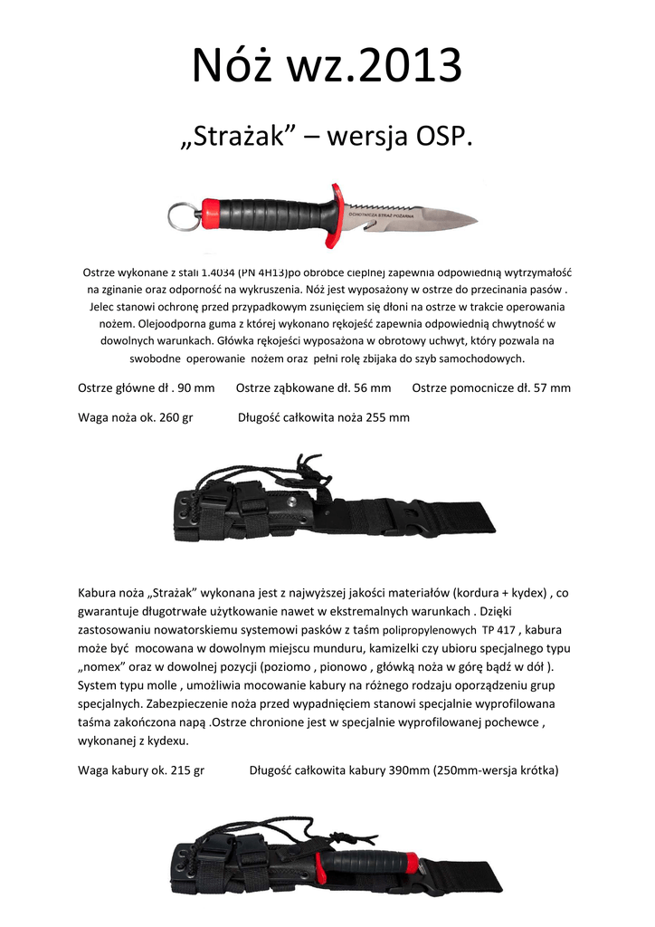 Nóż wz.2013 „Strażak” – wersja OSP. Ostrze wykonane z stali 1.4034 (PN 4H13)po obróbce cieplnej zapewnia odpowiednią wytrzymałość na zginanie oraz odporność na wykruszenia. Nóż jest wyposażony w ostrze do przecinania pasów . Jelec stanowi ochronę przed przypadkowym zsunięciem się dłoni na ostrze w trakcie operowania nożem. Olejoodporna guma z której wykonano rękojeść zapewnia odpowiednią chwytność w dowolnych warunkach. Główka rękojeści wyposażona w obrotowy uchwyt, który pozwala na swobodne operowanie nożem oraz pełni rolę zbijaka do szyb samochodowych. Ostrze główne dł . 90 mm Ostrze ząbkowane dł. 56 mm Waga noża ok. 260 gr Długość całkowita noża 255 mm Ostrze pomocnicze dł. 57 mm Kabura noża „Strażak” wykonana jest z najwyższej jakości materiałów (kordura + kydex) , co gwarantuje długotrwałe użytkowanie nawet w ekstremalnych warunkach . Dzięki zastosowaniu nowatorskiemu systemowi pasków z taśm polipropylenowych TP 417 , kabura może być mocowana w dowolnym miejscu munduru, kamizelki czy ubioru specjalnego typu „nomex” oraz w dowolnej pozycji (poziomo , pionowo , główką noża w górę bądź w dół ). System typu molle , umożliwia mocowanie kabury na różnego rodzaju oporządzeniu grup specjalnych. Zabezpieczenie noża przed wypadnięciem stanowi specjalnie wyprofilowana taśma zakończona napą .Ostrze chronione jest w specjalnie wyprofilowanej pochewce , wykonanej z kydexu. Waga kabury ok. 215 gr Długość całkowita kabury 390mm (250mm-wersja krótka) Przykładowe mocowanie kabury wraz z nożem