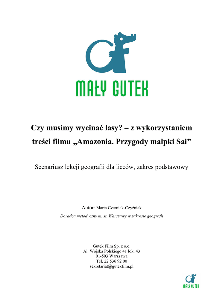 Czy musimy wycinać lasy? – z wykorzystaniem treści filmu „Amazonia. Przygody małpki Sai” Scenariusz lekcji geografii dla liceów, zakres podstawowy Autor: Marta Czerniak-Czyżniak Doradca metodyczny m. st. Warszawy w zakresie geografii Gutek Film Sp. z o.o. Al. Wojska Polskiego 41 lok. 43 01-503 Warszawa Tel. 22 536 92 00 [email protected] Scenariusz lekcji Przedmiot: Geografia Czas trwania: Temat lekcji: 1 godzina lekcyjna Czy musimy wycinać lasy? – z wykorzystaniem treści filmu „Amazonia. Przygody małpki Sai” charakterystyka regionu Amazonii: jego położenie, gatunki flory i fauny; rozumienie problemu wycinania lasów; rozwijanie umiejętności samodzielnego myślenia i korzystania z różnych źródeł wiedzy; rozwijanie wrażliwości uczniów poprzez kontakt ze sztuką filmową; rozwijanie wyobraźni uczniów. Uczeń: wskazuje na mapie region Amazonii i opisuje jego położenie, posługując się właściwą terminologią; rozpoznaje gatunki flory i fauny występujące w Amazonii; analizuje mapy klimatyczne i umie scharakteryzować warunki klimatyczne wilgotnych lasów równikowych na podstawie regionu Amazonii, wnioskuje, jak zmienią się warunki klimatyczne na całej kuli ziemskiej w przypadku postępującego wycinania lasów; wskazuje przyczyny masowego wycinania lasów w Amazonii; ocenia skutki masowego wycinania lasów w Amazonii, samodzielnie formułuje wnioski; sprawnie posługuje się właściwą dla tematu terminologią. Uczeń: 2. Zróżnicowanie gospodarcze świata. 6) charakteryzuje kierunki zmian w powierzchni lasów na świecie (w wyniku procesów wylesiania i zalesiania) i podaje przykłady gospodarowania zasobami leśnymi (pozytywne i negatywne); 3. Relacja człowiek-środowisko przyrodnicze a zrównoważony rozwój. 2) charakteryzuje obszary niedoboru i nadmiaru wody na świecie i określa przyczyny tego zróżnicowania (w tym zanieczyszczenia wód); przedstawia projekty rozwiązań stosowanych w sytuacjach braku lub niedoborów wody w różnych strefach klimatycznych; Cele ogólne lekcji: Cele szczegółowe lekcji: (wie, rozumie, potrafi) Treści podstawy programowej: Formy i metody pracy: Pomoce dydaktyczne: Etap edukacyjny IV, zakres podstawowy pogadanka, mapa mentalna, praca z atlasem, praca w grupach, rozsypanka, analiza SWOT, analiza tekstu źródłowego. film: „Amazonia. Przygody małpki Sai”; Przebieg lekcji: atlas geograficzny; podręcznik; materiały dotyczące Amazonii przygotowane przez nauczyciela; artykuł: http://ziemianarozdrozu.pl/encyklopedia/49/niszczenielasow-tropikalnych 1. Czynności organizacyjne; 2. Wprowadzenie do tematu – stworzenie mapy mentalnej z hasłem: Amazonia; 3. Analiza map ogólnogeograficznych i tematycznych w atlasie, na podstawie których określone zostają położenie i warunki klimatyczne Amazonii; 4. Praca w grupach: uczniowie porządkują ilustracje przygotowane przez nauczyciela przedstawiające wybrane gatunki flory i fauny ze świata, wskazując te które są charakterystyczne dla Amazonii; 5. Podsumowanie pracy uczniów: wskazanie, że lasy tropikalne to dom dla wielu gatunków roślin i zwierząt; 6. Każdy uczeń otrzymuje tekst źródłowy dotyczący wycinania lasów tropikalnych uzyskany ze strony: http://ziemianarozdrozu.pl/encyklopedia/49/niszczenielasow-tropikalnych , zapoznaje się z jego treścią, następnie na podstawie zamieszczonych w artykule ilustracji przedstawiających zasięg lasu tropikalnego oblicza jaki % jego powierzchni zostanie wycięty na przestrzeni 20 lat. (Można klasę podzielić na dwa zespoły, jeden zajmie się prognoza optymistyczna, drugi pesymistyczną); Wprowadzenie terminu: lesistość; 7. Uczniowie podzieleni na cztery zespoły dokonują analizy SWOT problemu: wycinanie lasów (każdy z zespołów ma jeden z elementów tej analizy); Analiza SWOT: Mocne strony: Słabe strony: Szanse: Zagrożenia: 8. Nauczyciel dokonuje podsumowania tematu lekcji, ewentualnie dokonuje oceny pracy uczniów; 9. Zadanie pracy domowej: Informacje dodatkowe: Na podstawie przedstawionych na lekcji informacji oraz innych, dowolnie wybranych źródeł odpowiedz na pytanie zawarte w temacie. Postaraj się, aby Twoja wypowiedź miała formę rozprawki. Temat powinien być zrealizowany po wcześniejszym obejrzeniu filmu „Amazonia. Przygody małpki Sai”, a to z kolei po właściwym dla tematu wprowadzeniu. Powinniśmy też zwrócić uwagę na sposób przekazywanych w filmie treści, gdyż jest on niecodzienny dla współczesnej młodzieży, a dzięki wcześniejszemu przygotowaniu osiągniemy wszystkie z założonych celów lekcji. Temat możemy również realizować jako interdyscyplinarny wraz z nauczycielem np.: wiedzy o kulturze, języka polskiego czy matematyki. Wiedza o kulturze – zastanawiamy się nad wizualnym przekazem treści oraz nad oryginalnością dźwięków. Język polski – rozwijamy twórcze myślenie młodzieży i prosimy np.: o zapisanie ewentualnych dialogów do filmu, zadane też praca domowa zawiera elementy charakterystyczne dla tego przedmiotu. Matematyka – przypomnienie podstawowych elementów związanych z obliczeniem powierzchni, czy procentowego udziału.