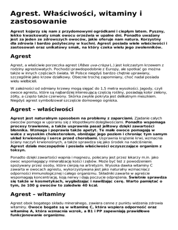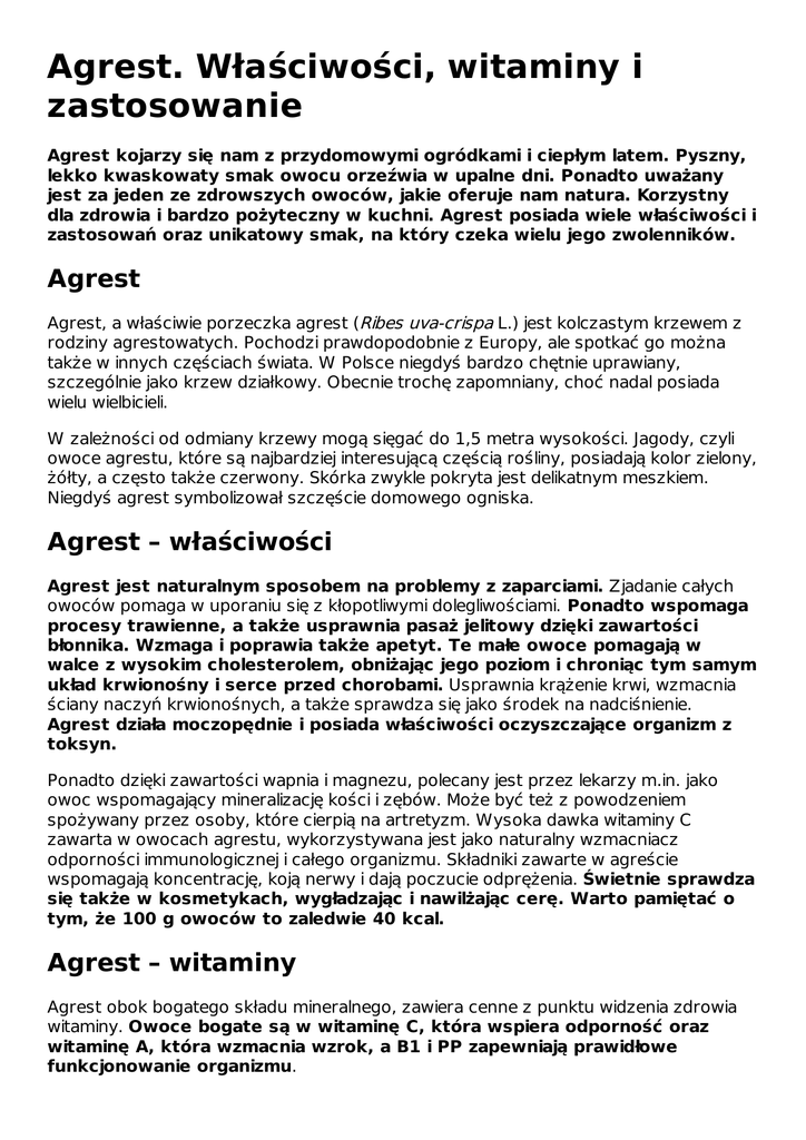 Agrest. Właściwości, witaminy i zastosowanie Agrest kojarzy się nam z przydomowymi ogródkami i ciepłym latem. Pyszny, lekko kwaskowaty smak owocu orzeźwia w upalne dni. Ponadto uważany jest za jeden ze zdrowszych owoców, jakie oferuje nam natura. Korzystny dla zdrowia i bardzo pożyteczny w kuchni. Agrest posiada wiele właściwości i zastosowań oraz unikatowy smak, na który czeka wielu jego zwolenników. Agrest Agrest, a właściwie porzeczka agrest (Ribes uva-crispa L.) jest kolczastym krzewem z rodziny agrestowatych. Pochodzi prawdopodobnie z Europy, ale spotkać go można także w innych częściach świata. W Polsce niegdyś bardzo chętnie uprawiany, szczególnie jako krzew działkowy. Obecnie trochę zapomniany, choć nadal posiada wielu wielbicieli. W zależności od odmiany krzewy mogą sięgać do 1,5 metra wysokości. Jagody, czyli owoce agrestu, które są najbardziej interesującą częścią rośliny, posiadają kolor zielony, żółty, a często także czerwony. Skórka zwykle pokryta jest delikatnym meszkiem. Niegdyś agrest symbolizował szczęście domowego ogniska. Agrest – właściwości Agrest jest naturalnym sposobem na problemy z zaparciami. Zjadanie całych owoców pomaga w uporaniu się z kłopotliwymi dolegliwościami. Ponadto wspomaga procesy trawienne, a także usprawnia pasaż jelitowy dzięki zawartości błonnika. Wzmaga i poprawia także apetyt. Te małe owoce pomagają w walce z wysokim cholesterolem, obniżając jego poziom i chroniąc tym samym układ krwionośny i serce przed chorobami. Usprawnia krążenie krwi, wzmacnia ściany naczyń krwionośnych, a także sprawdza się jako środek na nadciśnienie. Agrest działa moczopędnie i posiada właściwości oczyszczające organizm z toksyn. Ponadto dzięki zawartości wapnia i magnezu, polecany jest przez lekarzy m.in. jako owoc wspomagający mineralizację kości i zębów. Może być też z powodzeniem spożywany przez osoby, które cierpią na artretyzm. Wysoka dawka witaminy C zawarta w owocach agrestu, wykorzystywana jest jako naturalny wzmacniacz odporności immunologicznej i całego organizmu. Składniki zawarte w agreście wspomagają koncentrację, koją nerwy i dają poczucie odprężenia. Świetnie sprawdza się także w kosmetykach, wygładzając i nawilżając cerę. Warto pamiętać o tym, że 100 g owoców to zaledwie 40 kcal. Agrest – witaminy Agrest obok bogatego składu mineralnego, zawiera cenne z punktu widzenia zdrowia witaminy. Owoce bogate są w witaminę C, która wspiera odporność oraz witaminę A, która wzmacnia wzrok, a B1 i PP zapewniają prawidłowe funkcjonowanie organizmu. Agrest – zastosowanie Owoce agrestu bardzo dobrze smakują na surowo, prosto z krzaczka. Zielone są nieco bardziej kwaśne, a czerwone słodkie i delikatne. Z agrestu można przyrządzić wiele przetworów. Sok z agrestu posiada wiele właściwości dietetycznych i sprawdza się w dolegliwościach z przemianą materii. Ponadto agrest można z powodzeniem mrozić, a ze świeżych owoców robić przepyszne dżemy, konfitury, kompoty, powidła, ciasta, babeczki, a nawet nalewki. Agrest może służyć również jako smakowy dodatek do win, a poddany procesowi suszenia czy kandyzowania stanowi idealną przekąskę. Znajduje również zastosowanie w kosmetyce, w kremach przeciwzmarszczkowych, maseczkach czy jako dodatek do toników, które upiększają i oczyszczają cerę. Agrest, choć na pierwszy rzut oka mały i niepozorny, kryje w sobie wiele prozdrowotnych właściwości. Sprawdza się jako środek na „leniwe jelita”, wzmacnia odporność i chroni nasze serce oraz układ krwionośny. Ponadto bardzo dobrze smakuje, a w kuchni (i nie tylko) znajduje wiele zastosowań. Kup produkty z agrestu z rabatem 3% już teraz ! (wpisz bonavita w polu „kod specjalny” w koszyku) Author: Aleksandra Musiał Link do artykułu: http://bonavita.pl/agrest-wlasciwosci-witaminy-i-zastosowanie