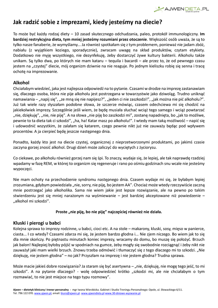 Jak radzić sobie z imprezami, kiedy jesteśmy na diecie? To może być każdy rodzaj diety – 10 zasad skutecznego odchudzania, paleo, protokół immunologiczny. Im bardziej restrykcyjna dieta, tym mniej jesteśmy rozumiani przez otoczenie. Większość osób uważa, że są to tylko nasze fanaberie, że wymyślamy... Ja również spotkałam się z tym problemem, ponieważ nie jadam zbóż, nabiału (z wyjątkiem koziego, sporadycznie), zwracam uwagę na skład produktów, czytam etykiety. Dodatkowo nie myję wszystkiego, nie dezynfekuję, żeby dostarczyć żywe kultury bakterii. Alkoholu także unikam. Są tylko dwa, po których nie mam kataru – tequila i bacardi – ale przez to, że od pewnego czasu jestem na „czystej” diecie, mój organizm dziwnie na nie reaguje. Po jednym kieliszku robię się senna i tracę ochotę na imprezowanie. Alkohol Chciałabym wiedzieć, jaka jest najlepsza odpowiedź na to pytanie. Czasami w drodze na imprezę zastanawiam się, dlaczego osoba, która nie pije alkoholu jest postrzegana w towarzystwie jako dziwoląg. Trudno uniknąć namawiania – „napij się”, „ze mną się nie napijesz?”, „jeden ci nie zaszkodzi!”, „jak można nie pić alkoholu?”. Już tak wiele razy słyszałam podobne słowa, że szczerze mówiąc, czasem odechciewa mi się chodzić na jakiekolwiek imprezy. Szczególnie jeśli wiem, że będę musiała słuchać wciąż tego samego i wciąż powtarzać „nie, dziękuję”, „nie, nie piję”. A na słowa „nie piję bo zaszkodzi mi”, zostanę napadnięta, bo „jak to możliwe, pewnie to ta dieta tak ci szkodzi”, „ha, ha! Katar masz po alkoholu!”. I wtedy mam taką możliwość – napić się i udowodnić wszystkim, że zalałam się katarem, czego pewnie nikt już nie zauważy będąc pod wpływem procentów. A ja cierpieć będę jeszcze następnego dnia. Ponadto, każdy kto jest na diecie czystej, organicznej z nieprzetworzonymi produktami, po jakimś czasie zaczyna gorzej znosić alkohol. Drugi dzień może zaliczyć do wyciętych z życiorysu. Co ciekawe, po alkoholu również gorzej nam się śpi. To znaczy, wydaje się, że lepiej, ale tak naprawdę rzadziej wpadamy w fazę REM, w której to organizm się regeneruje i rano po ośmiu godzinach snu wcale nie jesteśmy wypoczęci. Nie mam ochoty na przechodzenie syndromu następnego dnia. Czasem wydaje mi się, że byłabym lepiej zrozumiana, gdybym powiedziała „nie, sorry, nie piję, bo jestem AA”. Chociaż może wtedy rzeczywiście zaczną mnie postrzegać jako alkoholika. Sama nie wiem jakie jest lepsze rozwiązanie, ale na pewno po takim stwierdzeniu jest się mniej narażonym na wyśmiewanie – jest bardziej akceptowane niż powiedzenie – „alkohol mi szkodzi”. Proste „nie piję, bo nie piję” najczęściej również nie działa. Kluski i pierogi u babci Kolejna sprawa to imprezy rodzinne, u babci, cioci etc. A na stole – makarony, kluski, sosy, mięso w panierce, ciasta... I co wtedy? Czasami zdarza mi się, że jestem bardzo głodna i... Nie zjem niczego. Bo wiem jak to się dla mnie skończy. Po piętnastu minutach koniec imprezy, wracamy do domu, bo muszę się położyć. Brzuch jak balon! Najlepiej byłoby pójść w spodniach na gumce, żeby mogły się swobodnie rozciągnąć i żeby nikt nie zauważył jaki mam wielki brzuch. Znowu trzeba odmówić i tłumaczyć się z tego dlaczego mi to szkodzi. „Nie dziękuję, nie jestem głodna” – no jak? Przyszłam na imprezę i nie jestem głodna? Trudna sprawa. Może macie jakieś dobre rozwiązania? Ja staram się być asertywna – „nie, dziękuję, nie mogę tego jeść, to mi szkodzi”. A na pytanie dlaczego? - wolę odpowiedzieć krótko „szkodzi mi, ale nie chciałabym o tym rozmawiać, to nie jest miejsce na tego typu rozmowy”. Ajwen – dietetyk kliniczny i trener personalny - mgr Iwona Wierzbicka. Gabinet i Studio Treningu Personalnego: Opole, ul. Słowackiego 6/11. Tel. 796 122 070. www.ajwen.pl, email: [email protected]. www.ajwendieta.pl www.30-dniowe-wyzwanie.pl Lokal – spotkanie towarzyskie Inna sytuacja – zostajemy zaproszeni do lokalu, w większej grupie i wszyscy coś zamawiają. Patrzą co ja zamawiam, a ja obserwuję co oni jedzą. Oczywiście staram się nikogo nie pouczać, to są ich wybory. Ale jako, że jestem dietetykiem, to ludzie w moim towarzystwie mają tendencję do tłumaczenia się z tego co jedzą. I podejrzewam, że jeśli idziesz na imprezę, spotkanie, na którym wszyscy wiedzą, że stosujesz określoną dietę, to albo będą mówić „nie odchudzaj się, w ten jeden wieczór możesz sobie pozwolić”. Albo będą tłumaczyć się z tego co mają na talerzu, tak jakby czuli się winni z powodu jego zawartości. Czytam też etykiety, co często przy stole spotyka się z niezrozumieniem. Na przykład, gdy ktoś stosuje sos sojowy i pyta czy jest zdrowy. Patrzę na etykietę, widzę, że jest w nim pszenica i odpowiadam, że ze względu na nią nie jest zdrowy. Pszenica jest modyfikowana genetycznie. Co słyszę? – „Ty znowu wymyślasz!, ty i te twoje teorie!”. Zatem nauczona doświadczeniem staram się czytać etykiety dyskretnie, albo nie sięgam po produkty, które mogą być newralgiczne. Ostatnimi czasy również przestałam wdawać się w dyskusje, kwituję pytania stwierdzeniem – „nie jestem w pracy i nie chciałabym rozmawiać na tematy związane z dietą”, „zmieńmy temat, porozmawiajmy o pogodzie, sporcie...” Lepiej uciąć dyskusję, bo im dalej w las, tym ciemniej. (albo: im dalej w las tym więcej drzew… :). Na każdą twoją odpowiedź na temat diety uzyskasz więcej pytań. I jeśli wśród sześciu osób przy stole, ty jesteś jedyną stosującą dietę, możesz mieć pewność, że nie zostaniesz zrozumiany cokolwiek nie odpowiesz. Jeśli macie sprawdzone sposoby jak radzić sobie w powyższych sytuacjach to chętnie dowiem się jakie. Zapraszam do komentowania pod podcastem. Iwona Wie