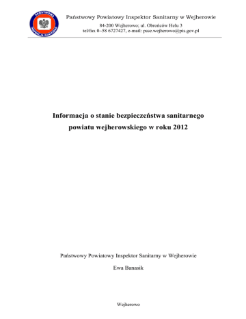 Państwowy Powiatowy Inspektor Sanitarny w Wejherowie 84-200 Wejherowo; ul. Obrońców Helu 3 tel/fax 0~58 6727427, e-mail: [email protected] Informacja o stanie bezpieczeństwa sanitarnego powiatu wejherowskiego w roku 2012 Państwowy Powiatowy Inspektor Sanitarny w Wejherowie Ewa Banasik Wejherowo Informacja o stanie bezpieczeństwa sanitarnego powiatu wejherowskiego za 2012r Spis treści Spis treści ........................................................................................................................................... 2 Spis tabel ............................................................................................................................................ 3 Spis rysunków .................................................................................................................................... 3 Wstęp ................................................................................................................................................. 4 Ocena zagrożeń sanitarnych na podstawie działalności kontrolnej. .................................................. 5 Sytuacja epidemiologiczna chorób zakaźnych na terenie powiatu. ............................................... 5 Inwazyjna choroba meningokokowa. ........................................................................................ 6 Krztusiec ( dawna nazwa koklusz) ............................................................................................ 6 Grypa.......................................................................................................................................... 7 Borelioza z Lyme ....................................................................................................................... 7 Wąglik ........................................................................................................................................ 7 Tężec .......................................................................................................................................... 8 Zakażenia wewnątrzszpitalne. ................................................................................................... 8 Analiza szczepień ochronnych ................................................................................................... 8 Ocena stanu sanitarno-technicznego i funkcjonalności placówek służby zdrowia. ...................... 9 Nadzór sanitarny nad obiektami komunalnymi ........................................................................... 10 Ocena stanu sanitarnego obiektów użyteczności publicznej w kontekście przygotowań do EURO 2012. ............................................................................................................................. 10 Ocena stanu sanitarnego domów opieki. ................................................................................. 10 Ocena stanu sanitarnego kąpielisk. .......................................................................................... 11 Ocena stanu sanitarnego basenów ........................................................................................... 11 Ocena stanu sanitarnego wodociągów ..................................................................................... 12 Działania prowadzone w roku 2012 w ramach nadzoru sanitarnego nad jakością wody przeznaczonej do spożycia przez ludzi: ................................................................................... 12 Ocena higienizacji procesu nauczania i stanu sanitarnego placówek oświatowych. .................. 13 Higienizacja procesu nauczania. .............................................................................................. 15 Ocena dożywiania w szkołach ................................................................................................. 15 Wypoczynek letni i zimowy dzieci i młodzieży w 2012 roku. ................................................ 15 Rozbudowa i modernizacja obiektów szkolnych. .................................................................... 15 Placówki przedszkolne i żłobki ............................................................................................... 16 Ocena poprawy bezpieczeństwa i jakości zdrowotnej żywności. ................................................ 16 Działania w Systemie Wczesnego Ostrzegania o Niebezpiecznych Produktach Żywnościowych i Środkach Żywienia Zwierząt (RASFF) ................................................................................. 16 Graniczna kontrola żywności oraz materiałów i wyrobów przeznaczonych do kontaktu z żywnością ................................................................................................................................. 17 Działania akcyjne ..................................................................................................................... 17 Badania próbek żywności ........................................................................................................ 18 Ocena higienicznych warunków pracy ........................................................................................ 18 Choroby zawodowe ..................................................................................................................... 20 Działalność oświatowo - zdrowotna i promocja zdrowia. .......................................................... 21 Zapobiegawczy nadzór sanitarny ................................................................................................. 22 Sytuacja kadrowa Stacji. .................................................................................................................. 23 Działalność Laboratorium PSSE w Wejherowie ......................................................................... 23 Podsumowanie działalności kontrolno-represyjnej PPIS w Wejherowie w roku 2012 .................. 24 Planowane przedsięwzięci