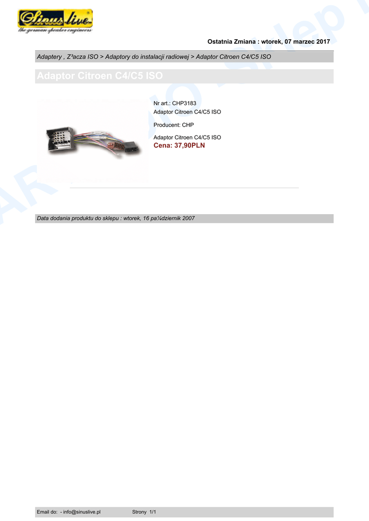 e l k -S i p Ostatnia Zmiana : wtorek, 07 marzec 2017 Adaptery , Z³acza ISO > Adaptory do instalacji radiowej > Adaptor Citroen C4/C5 ISO Adaptor Citroen C4/C5 ISO O I D Nr art.: CHP3183 Adaptor Citroen C4/C5 ISO Producent: CHP A U A R Adaptor Citroen C4/C5 ISO Cena: 37,90PLN Data dodania produktu do sklepu : wtorek, 16 pa¼dziernik 2007 Email do: - [email protected] Strony 1/1