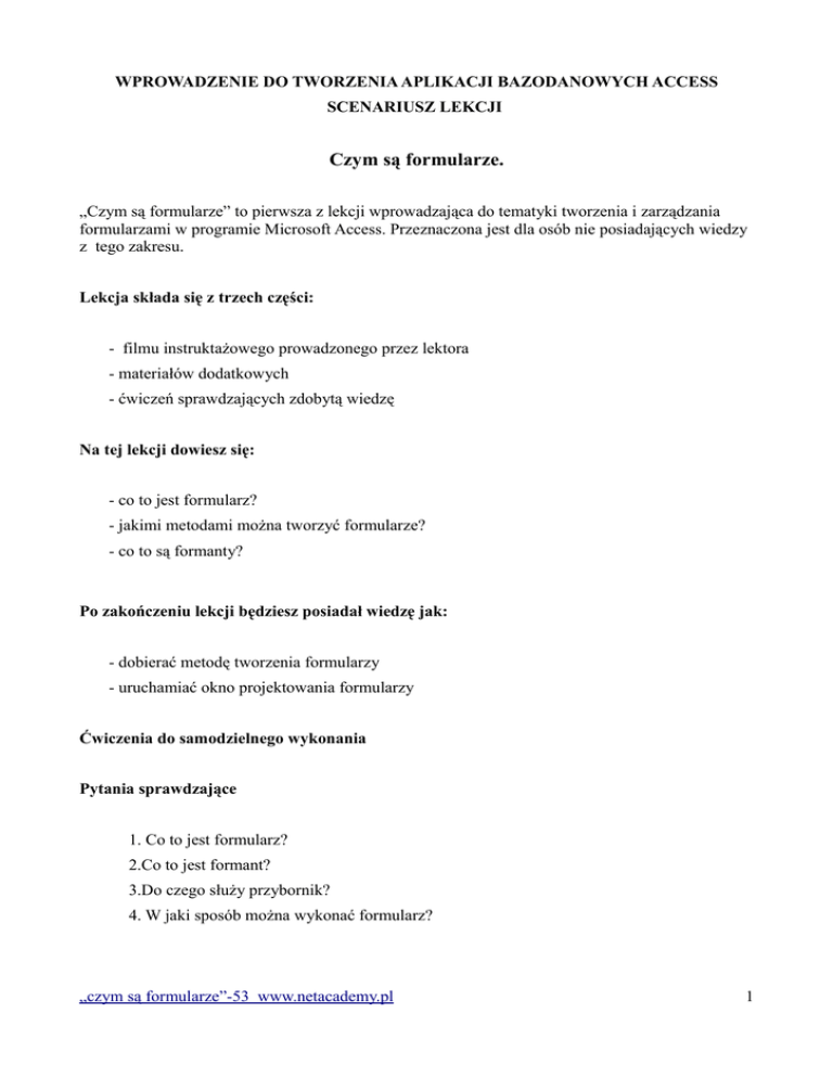 WPROWADZENIE DO TWORZENIA APLIKACJI BAZODANOWYCH ACCESS SCENARIUSZ LEKCJI Czym są formularze. „Czym są formularze” to pierwsza z lekcji wprowadzająca do tematyki tworzenia i zarządzania formularzami w programie Microsoft Access. Przeznaczona jest dla osób nie posiadających wiedzy z tego zakresu. Lekcja składa się z trzech części: - filmu instruktażowego prowadzonego przez lektora - materiałów dodatkowych - ćwiczeń sprawdzających zdobytą wiedzę Na tej lekcji dowiesz się: - co to jest formularz? - jakimi metodami można tworzyć formularze? - co to są formanty? Po zakończeniu lekcji będziesz posiadał wiedzę jak: - dobierać metodę tworzenia formularzy - uruchamiać okno projektowania formularzy Ćwiczenia do samodzielnego wykonania Pytania sprawdzające 1. Co to jest formularz? 2.Co to jest formant? 3.Do czego służy przybornik? 4. W jaki sposób można wykonać formularz? „czym są formularze”-53 www.netacademy.pl 1