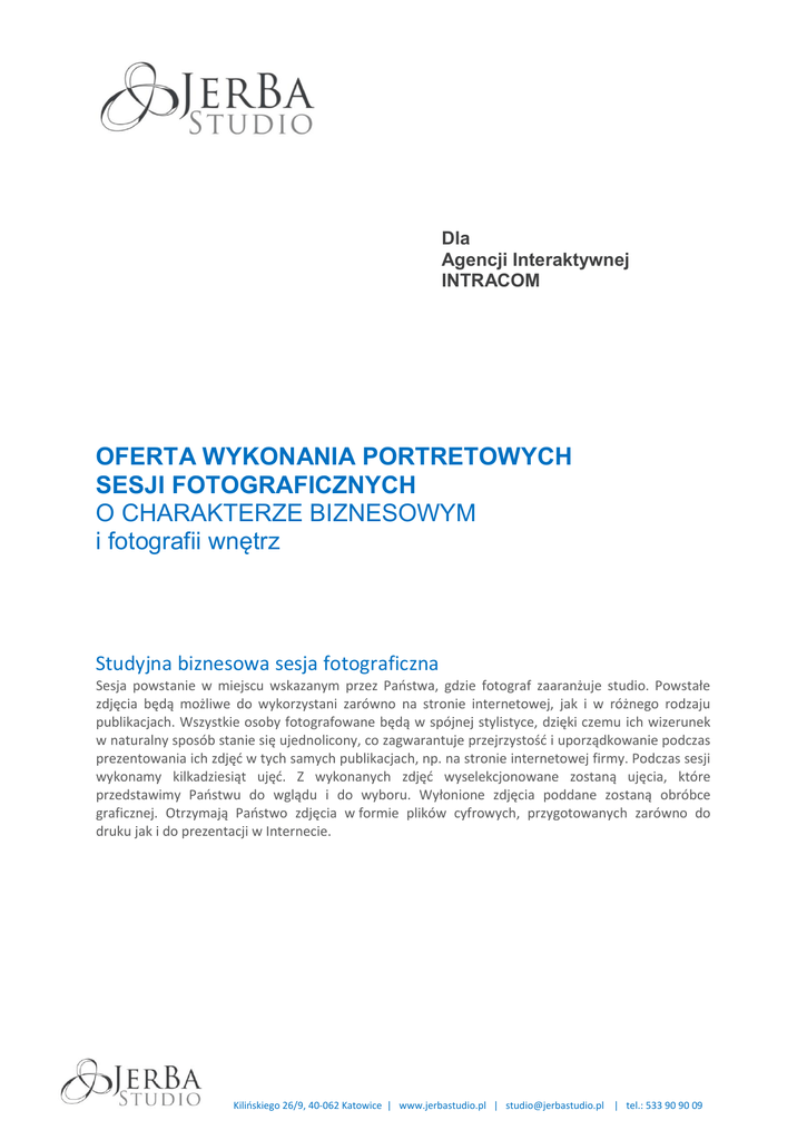Dla Agencji Interaktywnej INTRACOM OFERTA WYKONANIA PORTRETOWYCH SESJI FOTOGRAFICZNYCH O CHARAKTERZE BIZNESOWYM i fotografii wnętrz Studyjna biznesowa sesja fotograficzna Sesja powstanie w miejscu wskazanym przez Państwa, gdzie fotograf zaaranżuje studio. Powstałe zdjęcia będą możliwe do wykorzystani zarówno na stronie internetowej, jak i w różnego rodzaju publikacjach. Wszystkie osoby fotografowane będą w spójnej stylistyce, dzięki czemu ich wizerunek w naturalny sposób stanie się ujednolicony, co zagwarantuje przejrzystość i uporządkowanie podczas prezentowania ich zdjęć w tych samych publikacjach, np. na stronie internetowej firmy. Podczas sesji wykonamy kilkadziesiąt ujęć. Z wykonanych zdjęć wyselekcjonowane zostaną ujęcia, które przedstawimy Państwu do wglądu i do wyboru. Wyłonione zdjęcia poddane zostaną obróbce graficznej. Otrzymają Państwo zdjęcia w formie plików cyfrowych, przygotowanych zarówno do druku jak i do prezentacji w Internecie. Kilińskiego 26/9, 40-062 Katowice | www.jerbastudio.pl | [email protected] | tel.: 533 90 90 09 1. Zakres objęty ofertą: SESJA PORTRETOWA Sesja realizowana w lokalizacji wskazanej przez Klienta na terenie Katowic (+20 km), w ciągu jednego dnia; Termin realizacji: październik – listopad 2016; Sportretowanie 6 osób według wcześniej omówionej stylistyki; Zdjęcie grupowe (20 osób) Każdej osobie wykonywana zostanie indywidualna seria ujęć, z których do dalszej postprodukcji Klient wskazuje ustaloną ilość zdjęć każdej z osób; Dojazd na sesję obsługi i transport sprzętu w umówione miejscu na terenie Katowic; Zastosowanie profesjonalnego sprzętu fotograficzno-oświetleniowego; Dwu, trzy lub czteroosobowa obsługa (fotograf, asystent, wizażystka, stylistka). Obróbka graficzną wybranych ujęć każdej fotografowanej osoby (kadrowanie, kontrast, jasność, wyretuszowanie niedoskonałości skóry) Przygotowanie zdjęć w dwóch wersjach: pliki do druku: JPG 300 dpi, pliki do internetu JPG 72 dpi Wizażysta: przygotowuje osobę fotografowaną poprzez nałożenie odpowiedniego make'upu na skórę (zniwelowanie świecenia, nierówności, przebarwień). SESJA WNĘTRZ sesja realizowana w lokalizacji wskazanej przez Klienta na terenie Katowic (+20 km) termin realizacji: październik – listopad 2016 wykonanie serii kilkunastu – kilkudziesięciu zdjęć we wskazanych przez Klienta pomieszczeniach (znajdujących się w jednej lokalizacji), z których Klient wskaże wybierze 10 finalnych ujęć. Obróbka graficzna wybranych ujęć każdej fotografowanej osoby (kadrowanie, kontrast, jasność, wyretuszowanie niedoskonałości skóry) Przygotowanie zdjęć w dwóch wersjach: pliki do druku: JPG 300 dpi, pliki do internetu JPG 72 dpi 2. Wartość: SESJA PORTRETOWA – 6 osób: - Zdjęcia wykonane na jednolitym białym tle (tzw. popiersie). - Zdjęcia jednej z sześciu osób dodatkowo na białym tle – cała sylwetka. - Zdjęcia wykonane we wnętrzach biurowych wskazanych przez Klienta lub na zewnątrz (jeżeli fotograf oceni, że w miejscu wskazanym przez Klienta panują złe warunki oświetleniowe lub inne, które będą niekorzystne, Klient wskaże alternatywne miejsce do zrealizowania zdjęć). - Finalnie Klient wybiera 4 ujęcia każdej fotografowanej osoby. SESJA PORTRETOWA – grupowa: - Zdjęcia grupowe zespołu ok. 20 osób na zewnątrz (w świetle zastanym). - Klient wybiera jedno ujęcie. 3500 zł (Cena zawiera wizażystę). Każde następne zdjęcie powyżej ustalonej ilości w cenie 100 zł / sztuka. Kilińskiego 26/9, 40-062 Katowice | www.jerbastudio.pl | [email protected] | tel.: 533 90 90 09 SESJA WNĘTRZ / BUDYNKU NA ZEWNĄTRZ: 1000 zł / 10 finalnych ujęć. Każde następne zdjęcie powyżej ustalonej ilości w cenie 100 zł / sztuka. STYLISTKA: Możliwa jest konsultacja z naszą stylistką przed zrealizowaniem sesji zdjęciowej. Pomoże ona Państwu dobrać najbardziej korzystny ubiór oraz dopasować wszystkie jego elementy tak aby były one spójne z Państwa wizerunkiem. Konsultacja odbywa się bezpośrednio przed sesją, wówczas prosimy osoby fotografowane aby przyniosły na sesję określoną wcześniej gamę strojów, które posiadają i na miejscu ze stylistką dobierana jest najbardziej korzystna opcja. Stylistka jest również obecna podczas sesji zdjęciowej, trzymając pieczę nad wszystkimi detalami stroju i wyglądem osoby fotografowanej. Cena: 150 zł / osoba. Informujemy, że JerBa Studio nie jest płatnikiem VAT, więc do podanych kwot nie zostanie doliczony podatek. Mamy nadzieję, że nasza oferta wzbudzi Państwa zainteresowanie. W przypadku dodatkowych pytań pozostajemy do Państwa dyspozycji i czekamy na podjęcie współpracy z Państwa firmą! Zespół JerBa Studio Kilińskiego 26/9, 40-062 Katowice | www.jerbastudio.pl | [email protected] | tel.: 533 90 90 09