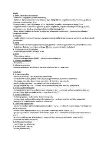 Lokale 1. Ściany konstrukcyjne i działowe: - szczytowe – cegła pełna, bloczek komorowy, - frontowe – konstrukcja drewniana obłożona płytą OSB gr 22 mm. wypełniona wełną mineralną gr. 15 cm, ocieplone styropianem gr. 10 cm. - działowe – kartonowo – gipsowe gr. 10 cm. 2 x płyta GK, wypełnione wełną mineralną gr. 5 cm. - międzylokalowe – kartonowo – gipsowe gr. 22 cm 4 x płyta GK, wypełnione wełną mineralną gr. 10 cm., spełniające normy akustyczne i wytrzymałościowe ścian z cegły pełnej, - ściany pokryte tynkami mechanicznymi gipsowymi lub płytami kartonowo – gipsowymi pomalowane dwukrotnie na biało. 2. Posadzki: - między belkami stropowymi warstwa styropianu pokryta siatką zbrojeniową oraz wierzchnia warstwa wylewki cementowej. 3. Sufity: - podwieszane, wykończone ognioodporną płytą gipsowo – kartonową, pomalowane jednokrotnie na biało, - dodatkowo docieplone wełną mineralną gr. 20 cm w przestrzeni między krokwiami. 4. Drzwi wewnętrzne do mieszkań: - drzwi antywłamaniowe o akustyce 36 dB. 5. Okna: - PCV w kolorze białym, - drewniane okna połaciowe FAKRO z kołnierzem uszczelniającym. 6. Parapety wewnętrzne: - drewniane, 7. Schody wewnętrzne: - drewniane wewnętrzne schody na antresole szerokości 80 cm z poręczami Instalacje 1. Instalacja wodna: - zasilanie w wodę z sieci wodociągu miejskiego, - woda zimna i ciepła, podejścia z rur polipropylenowych, zakończone korkiem, - lokalizacja liczników do pomiaru zużycia wody zimnej w łazienkach, - woda ciepła użytkowa z gazowego kotła dwufunkcyjnego, - przyjęte materiały: rury i kształtki polipropylenowe łączone metodą zgrzewania. 2. Instalacja kanalizacyjna: - instalacja kanalizacyjna podłączona do istniejącej sieci kanalizacji sanitarnej ogólnospławnej, - materiały do wykonania kanalizacji: rury i kształtki PCV, 3. Instalacja gazowa: - instalacja gazowa podłączona do sieci miejskiej, - materiały do wykonania instalacji: bezszwowe rury stalowe łączone techniką spawania, - gazomierze zlokalizowane na klatce schodowej, 4. Centralne ogrzewanie: - zasilanie instalacji centralnego ogrzewania (oraz c.w.u.) w lokalach za pomocą dwufunkcyjnego kotła gazowego, - materiały do wykonania instalacji: rury i kształtki w systemie PEX/AL/PEX, - grzejniki panelowe z zaworami termostatycznymi oraz z zaworami do odpowietrzenia i spustu wody, - grzejniki drabinkowe w łazienkach z zaworami termostatycznymi oraz z zaworami do odpowietrzenia i spustu wody. 5. Instalacja wentylacji: - wentylacja grawitacyjna. 6. Instalacja elektryczna: - licznik jednofazowy, - możliwość opcji trójfazowej po indywidualnej zmianie warunków z zakładem energetycznym, - umiejscowienie liczników poboru energii w tablicach zlokalizowanych w częściach wspólnych, - wypusty oświetleniowe zakończone kostką, - komplet gniazd i włączników, - tablica mieszkaniowa z zabezpieczeniami obwodów. 7. Instalacja teletechniczna: - instalacja internetowa, - instalacja domofonowa zakończona unifonem, - instalacja RTV, - dzwonek. Budynek 1. Konstrukcja budynku: - istniejąca o konstrukcji tradycyjnej murowanej z cegły pełnej. 2. Stropy: - istniejące stropy międzypiętrowe – drewniane, - nad piwnicami stropy Kleina. 3. Elewacja: - istniejąca – poddana renowacji, - poziom poddasza - ocieplona styropianem gr 10 cm. i otynkowana. 4. Dach: - nowa konstrukcja dachu, poszycie z płyty OSB gr 22 mm, pokryte papą termozgrzewalną, ocieplony wełną mineralną gr. 20 cm. - nowe obróbki blacharskie z blachy ocynkowanej, - nowe orynnowanie z blachy ocynkowanej/ PCV. Części wspólne 1. Ściany: - tynki gipsowe maszynowe, 2. Posadzki: - w korytarzach gres. 3. Balustrady klatki schodowej: - kute. 4. Drzwi wejściowe do budynku: - stalowe 7. Śmietnik: - Osobne wydzielone miejsce na zewnątrz budynku. 8. Okna klatki schodowej - nowe PCV, częściowo uchylne Podwórze - teren zielony, - chodnik wyłożony płytą chodnikową, - nasadzenia, - oświetlenie podwórza, - monitoring.