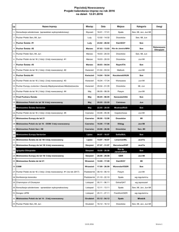 Pięciobój Nowoczesny Projekt kalendarza imprez na rok 2016 na dzień 12.01.2016 Miesiąc Data Miejsce Kategoria Styczeń 16.01 - 17.01 Spała Sen, Mł, Jun, Jun Mł 2 Puchar Polski Sen, Mł, Jun Luty 12.02 - 14.02 Drzonków Sen, Mł, Jun 3 Puchar Świata #1 Luty 23.02 - 28.02 Kair/EGY Sen 4 Puchar Świata #2 Marzec 07.03 - 13.03 Rio de Janeiro/BRA Sen 5 Puchar Polski Sen, Mł, Jun Marzec 18.03 - 20.03 Drzonków Sen, Mł, Jun 6 Puchar Polski do lat 16 ( 3-bój i 2-bój nowoczesny) #1 Marzec 18.03 - 20.03 Drzonków Jun Mł 7 Puchar Świata #3 Marzec 30.03 - 04.04 Rzym/ITA Sen 8 Puchar Polski do lat 16 ( 3-bój i 2-bój nowoczesny) #2 Kwiecień 01.04 - 03.04 Malbork Jun Mł 9 Puchar Świata #4 Kwiecień 14.04 - 18.04 Kecskemét/HUN Sen 10 Puchar Polski do lat 16 ( 3-bój i 2-bój nowoczesny) #3 Kwiecień 16.04 - 17.04 Warszawa Jun Mł 11 Puchar Europy Juniorów i Zawody Międzynarodowe Młodzieżowców Kwiecień 29.04 - 01.05 Drzonków Mł, Jun 12 Puchar Polski do lat 16 ( 3-bój i 2-bój nowoczesny) #4 Maj 06.05 - 08.05 Pasym Jun Mł 13 Finał Pucharu Świata Maj 06.05 - 08.05 Sarasota/USA Sen 14 Mistrzostwa Polski do lat 18/ 4-bój nowoczesny Maj 20.05 - 22.05 Cetniewo Jun 15 Mistrzostwa Świata Seniorów Maj 22.05 - 29.05 Moskwa/RUS Sen 16 Puchar Polski do lat 16 ( 3-bój i 2-bój nowoczesny) #5 Czerwiec 03.06 - 05.06 Częstochowa Jun Mł 17 Mistrzostwa Europy do lat 21 Czerwiec 06.06 - 12.06 Drzonków Mł 18 Mistrzostwa Polski do lat 16 - OOM/ 3-bój nowoczesny Czerwiec 16.06 - 17.06 Elbląg Jun Mł 19 Mistrzostwa Polski Sen i Mł Czerwiec 24.06 - 26.06 Drzonków Sen, Mł 20 Mistrzostwa Europy Seniorów Lipiec 04.07 - 10.07 Sofia/BUL Sen 21 Mistrzostwa Świata do lat 18/ 4-bój nowoczesny Lipiec 14.07 - 18.07 Limerick/IRL Jun/Ya 22 Mistrzostwa Europy do lat 18/ 4-bój nowoczesny Sierpień 27.07 - 31.07 Barcelona/ESP Jun/Ya 23 Igrzyska Olimpiskie Sierpień 18.08 - 20.08 Rio de Janeiro/BRA Sen 24 Mistrzostwa Europy do lat 16/ 3-bój nowoczesny Sierpień 26.08 - 29.08 GBR Jun Mł 25 Mistrzostwa Świata do lat 21 Wrzesień 12.09 - 17.09 Kair/EGY Mł 26 CISM Wrzesień 17.09 - 26.09 Warendorf/GER Sen 27 Puchar Polski do lat 16 ( 3-bój i 2-bój nowoczesny) #1 (na rok 2017) Październik 08.10 - 09.10 Pasym Jun Mł 28 Konferencja trenerska Październik 21.10 - 22.10 Spała wg regulaminu 29 Chammpion of Champion Listopad 05.11 - 06.11 Doha/QAT wg zaproszeń 30 Konsultacje szkoleniowe - sprawdzian wytrzymałosciowy Listopad 12.11 - 13.11 Spała Sen, Mł, Jun, Jun Mł 31 Konges UIPM Listopad 25.11 - 27.11 Franhfurt/GER wg regulaminu 32 Mistrzostwa Polski do lat 14 - 2-bój nowoczesny Grudzień 03.12 - 04.12 Spała Młodzik 33 Puchar Polski Sen, Mł, Jun Grudzień 16.12 - 18.12 Drzonków Sen, Mł, Jun, Jun Mł Lp Nazwa imprezy 1 Konsultacje szkoleniowe (sprawdzian wytrzymałościowy) 13.01.2016 Uwagi Rekonesans Olimpijski Strona 1