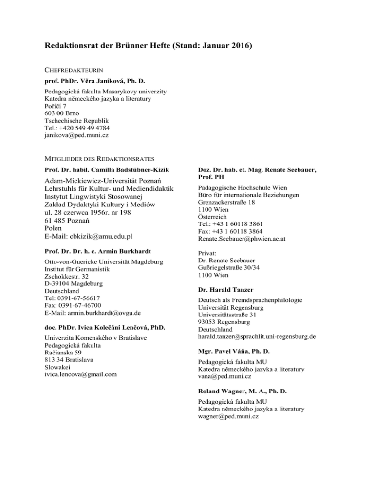 Redaktionsrat der Brünner Hefte (Stand: Januar 2016)