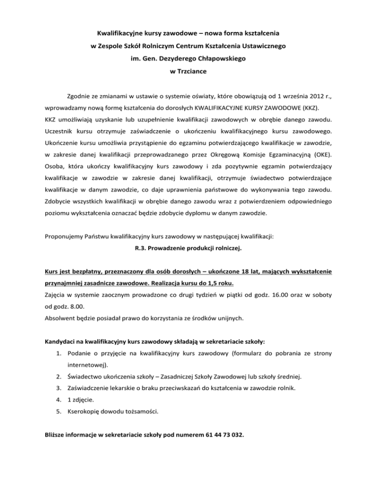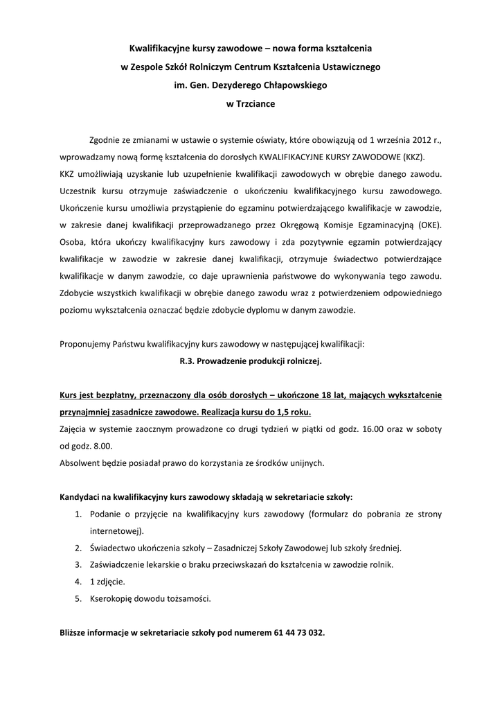 Kwalifikacyjne kursy zawodowe – nowa forma kształcenia w Zespole Szkół Rolniczym Centrum Kształcenia Ustawicznego im. Gen. Dezyderego Chłapowskiego w Trzciance Zgodnie ze zmianami w ustawie o systemie oświaty, które obowiązują od 1 września 2012 r., wprowadzamy nową formę kształcenia do dorosłych KWALIFIKACYJNE KURSY ZAWODOWE (KKZ). KKZ umożliwiają uzyskanie lub uzupełnienie kwalifikacji zawodowych w obrębie danego zawodu. Uczestnik kursu otrzymuje zaświadczenie o ukończeniu kwalifikacyjnego kursu zawodowego. Ukończenie kursu umożliwia przystąpienie do egzaminu potwierdzającego kwalifikacje w zawodzie, w zakresie danej kwalifikacji przeprowadzanego przez Okręgową Komisje Egzaminacyjną (OKE). Osoba, która ukończy kwalifikacyjny kurs zawodowy i zda pozytywnie egzamin potwierdzający kwalifikacje w zawodzie w zakresie danej kwalifikacji, otrzymuje świadectwo potwierdzające kwalifikacje w danym zawodzie, co daje uprawnienia państwowe do wykonywania tego zawodu. Zdobycie wszystkich kwalifikacji w obrębie danego zawodu wraz z potwierdzeniem odpowiedniego poziomu wykształcenia oznaczać będzie zdobycie dyplomu w danym zawodzie. Proponujemy Państwu kwalifikacyjny kurs zawodowy w następującej kwalifikacji: R.3. Prowadzenie produkcji rolniczej. Kurs jest bezpłatny, przeznaczony dla osób dorosłych – ukończone 18 lat, mających wykształcenie przynajmniej zasadnicze zawodowe. Realizacja kursu do 1,5 roku. Zajęcia w systemie zaocznym prowadzone co drugi tydzień w piątki od godz. 16.00 oraz w soboty od godz. 8.00. Absolwent będzie posiadał prawo do korzystania ze środków unijnych. Kandydaci na kwalifikacyjny kurs zawodowy składają w sekretariacie szkoły: 1. Podanie o przyjęcie na kwalifikacyjny kurs zawodowy (formularz do pobrania ze strony internetowej). 2. Świadectwo ukończenia szkoły – Zasadniczej Szkoły Zawodowej lub szkoły średniej. 3. Zaświadczenie lekarskie o braku przeciwskazań do kształcenia w zawodzie rolnik. 4. 1 zdjęcie. 5. Kserokopię dowodu tożsamości. Bliższe informacje w sekretariacie szkoły pod numerem 61 44 73 032.