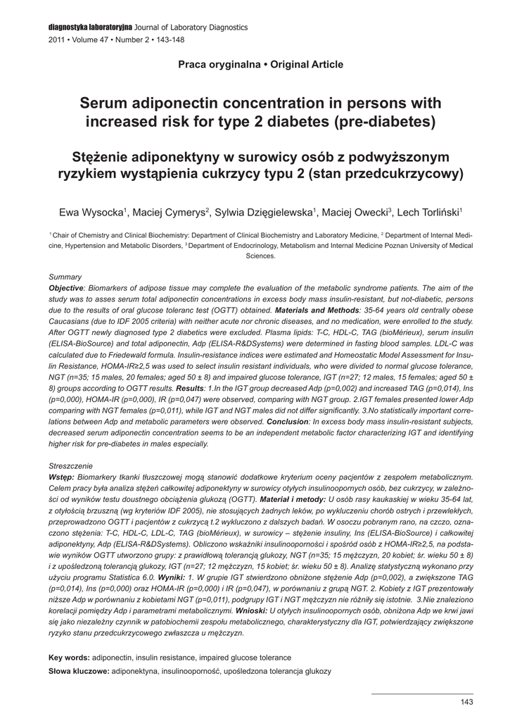 diagnostyka laboratoryjna Journal of Laboratory Diagnostics 2011 • Volume 47 • Number 2 • 143-148 Praca oryginalna • Original Article Serum adiponectin concentration in persons with increased risk for type 2 diabetes (pre-diabetes) Stężenie adiponektyny w surowicy osób z podwyższonym ryzykiem wystąpienia cukrzycy typu 2 (stan przedcukrzycowy) Ewa Wysocka1, Maciej Cymerys2, Sylwia Dzięgielewska1, Maciej Owecki3, Lech Torliński1 Chair of Chemistry and Clinical Biochemistry: Department of Clinical Biochemistry and Laboratory Medicine, 2 Department of Internal Medicine, Hypertension and Metabolic Disorders, 3 Department of Endocrinology, Metabolism and Internal Medicine Poznan University of Medical Sciences. 1 Summary Objective: Biomarkers of adipose tissue may complete the evaluation of the metabolic syndrome patients. The aim of the study was to asses serum total adiponectin concentrations in excess body mass insulin-resistant, but not-diabetic, persons due to the results of oral glucose toleranc test (OGTT) obtained. Materials and Methods: 35-64 years old centrally obese Caucasians (due to IDF 2005 criteria) with neither acute nor chronic diseases, and no medication, were enrolled to the study. After OGTT newly diagnosed type 2 diabetics were excluded. Plasma lipids: T-C, HDL-C, TAG (bioMérieux), serum insulin (ELISA-BioSource) and total adiponectin, Adp (ELISA-R&DSystems) were determined in fasting blood samples. LDL-C was calculated due to Friedewald formula. Insulin-resistance indices were estimated and Homeostatic Model Assessment for Insulin Resistance, HOMA-IR≥2,5 was used to select insulin resistant individuals, who were divided to normal glucose tolerance, NGT (n=35; 15 males, 20 females; aged 50 ± 8) and impaired glucose tolerance, IGT (n=27; 12 males, 15 females; aged 50 ± 8) groups according to OGTT results. Results: 1.In the IGT group decreased Adp (p=0,002) and increased TAG (p=0,014), Ins (p=0,000), HOMA-IR (p=0,000), IR (p=0,047) were observed, comparing with NGT group. 2.IGT females presented lower Adp comparing with NGT females (p=0,011), while IGT and NGT males did not differ significantly. 3.No statistically important correlations between Adp and metabolic parameters were observed. Conclusion: In excess body mass insulin-resistant subjects, decreased serum adiponectin concentration seems to be an independent metabolic factor characterizing IGT and identifying higher risk for pre-diabetes in males especially. Streszczenie Wstęp: Biomarkery tkanki tłuszczowej mogą stanowić dodatkowe kryterium oceny pacjentów z zespołem metabolicznym. Celem pracy była analiza stężeń całkowitej adiponektyny w surowicy otyłych insulinoopornych osób, bez cukrzycy, w zależności od wyników testu doustnego obciążenia glukozą (OGTT). Materiał i metody: U osób rasy kaukaskiej w wieku 35-64 lat, z otyłością brzuszną (wg kryteriów IDF 2005), nie stosujących żadnych leków, po wykluczeniu chorób ostrych i przewlekłych, przeprowadzono OGTT i pacjentów z cukrzycą t.2 wykluczono z dalszych badań. W osoczu pobranym rano, na czczo, oznaczono stężenia: T-C, HDL-C, LDL-C, TAG (bioMérieux), w surowicy – stężenie insuliny, Ins (ELISA-BioSource) i całkowitej adiponektyny, Adp (ELISA-R&DSystems). Obliczono wskaźniki insulinooporności i spośród osób z HOMA-IR≥2,5, na podstawie wyników OGTT utworzono grupy: z prawidłową tolerancją glukozy, NGT (n=35; 15 mężczyzn, 20 kobiet; śr. wieku 50 ± 8) i z upośledzoną tolerancją glukozy, IGT (n=27; 12 mężczyzn, 15 kobiet; śr. wieku 50 ± 8). Analizę statystyczną wykonano przy użyciu programu Statistica 6.0. Wyniki: 1. W grupie IGT stwierdzono obniżone stężenie Adp (p=0,002), a zwiększone TAG (p=0,014), Ins (p=0,000) oraz HOMA-IR (p=0,000) i IR (p=0,047), w porównaniu z grupą NGT. 2. Kobiety z IGT prezentowały niższe Adp w porównaniu z kobietami NGT (p=0,011), podgrupy IGT i NGT mężczyzn nie różniły się istotnie. 3.Nie znaleziono korelacji pomiędzy Adp i parametrami metabolicznymi. Wnioski: U otyłych insulinoopornych osób, obniżona Adp we krwi jawi się jako niezależny czynnik w patobiochemii zespołu metabolicznego, charakterystyczny dla IGT, potwierdzający zwiększone ryzyko stanu przedcukrzycowego zwłaszcza u mężczyzn. Key words:adiponectin, insulin resistance, impaired glucose tolerance Słowa kluczowe:adiponektyna, insulinooporność, upośledzona tolerancja glukozy 143