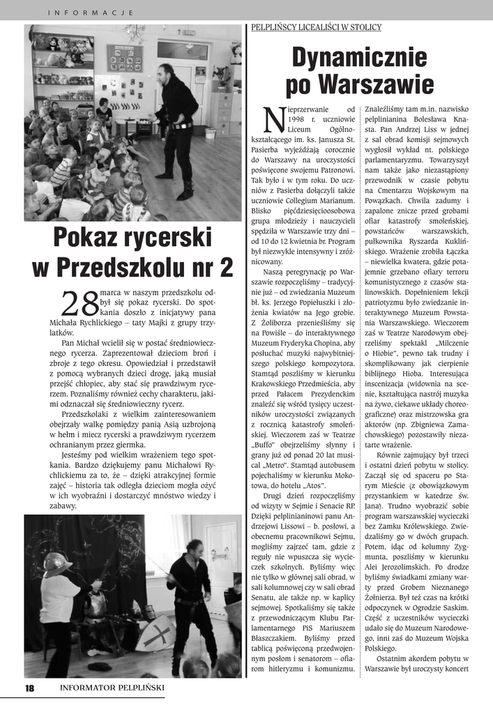 I N F O R M A C J E PELPLIŃSCY LICEALIŚCI W STOLICY Dynamicznie po Warszawie N Pokaz rycerski w Przedszkolu nr 2 28 marca w naszym przedszkolu odbył się pokaz rycerski. Do spotkania doszło z inicjatywy pana Michała Rychlickiego – taty Majki z grupy trzylatków. Pan Michał wcielił się w postać średniowiecznego rycerza. Zaprezentował dzieciom broń i zbroje z tego okresu. Opowiedział i przedstawił z pomocą wybranych dzieci drogę, jaką musiał przejść chłopiec, aby stać się prawdziwym rycerzem. Poznaliśmy również cechy charakteru, jakimi odznaczał się średniowieczny rycerz. Przedszkolaki z wielkim zainteresowaniem obejrzały walkę pomiędzy panią Asią uzbrojoną w hełm i miecz rycerski a prawdziwym rycerzem ochranianym przez giermka. Jesteśmy pod wielkim wrażeniem tego spotkania. Bardzo dziękujemy panu Michałowi Rychlickiemu za to, że – dzięki atrakcyjnej formie zajęć – historia tak odległa dzieciom mogła ożyć w ich wyobraźni i dostarczyć mnóstwo wiedzy i zabawy. 18 INFORMATOR PELPLIŃSKI ieprzerwanie od 1998 r. uczniowie Liceum Ogólnokształcącego im. ks. Janusza St. Pasierba wyjeżdżają corocznie do Warszawy na uroczystości poświęcone swojemu Patronowi. Tak było i w tym roku. Do uczniów z Pasierba dołączyli także uczniowie Collegium Marianum. Blisko pięćdziesięcioosobowa grupa młodzieży i nauczycieli spędziła w Warszawie trzy dni – od 10 do 12 kwietnia br. Program był niezwykle intensywny i zróżnicowany. Naszą peregrynację po Warszawie rozpoczęliśmy – tradycyjnie już – od zwiedzania Muzeum bł. ks. Jerzego Popiełuszki i złożenia kwiatów na Jego grobie. Z Żoliborza przenieśliśmy się na Powiśle – do interaktywnego Muzeum Fryderyka Chopina, aby posłuchać muzyki najwybitniejszego polskiego kompozytora. Stamtąd poszliśmy w kierunku Krakowskiego Przedmieścia, aby przed Pałacem Prezydenckim znaleźć się wśród tysięcy uczestników uroczystości związanych z rocznicą katastrofy smoleńskiej. Wieczorem zaś w Teatrze „Buffo” obejrzeliśmy słynny i grany już od ponad 20 lat musical „Metro”. Stamtąd autobusem pojechaliśmy w kierunku Mokotowa, do hotelu „Atos”. Drugi dzień rozpoczęliśmy od wizyty w Sejmie i Senacie RP. Dzięki pelplinianinowi panu Andrzejowi Lissowi – b. posłowi, a obecnemu pracownikowi Sejmu, mogliśmy zajrzeć tam, gdzie z reguły nie wpuszcza się wycieczek szkolnych. Byliśmy więc nie tylko w głównej sali obrad, w sali kolumnowej czy w sali obrad Senatu, ale także np. w kaplicy sejmowej. Spotkaliśmy się także z przewodniczącym Klubu Parlamentarnego PiS Mariuszem Błaszczakiem. Byliśmy przed tablicą poświęconą przedwojennym posłom i senatorom – ofiarom hitleryzmu i komunizmu. Znaleźliśmy tam m.in. nazwisko pelplinianina Bolesława Knasta. Pan Andrzej Liss w jednej z sal obrad komisji sejmowych wygłosił wykład nt. polskiego parlamentaryzmu. Towarzyszył nam także jako niezastąpiony przewodnik w czasie pobytu na Cmentarzu Wojskowym na Powązkach. Chwila zadumy i zapalone znicze przed grobami ofiar katastrofy smoleńskiej, powstańców warszawskich, pułkownika Ryszarda Kuklińskiego. Wrażenie zrobiła Łączka – niewielka kwatera, gdzie potajemnie grzebano ofiary terroru komunistycznego z czasów stalinowskich. Dopełnieniem lekcji patriotyzmu było zwiedzanie interaktywnego Muzeum Powstania Warszawskiego. Wieczorem zaś w Teatrze Narodowym obejrzeliśmy spektakl „Milczenie o Hiobie”, pewno tak trudny i skomplikowany jak cierpienie biblijnego Hioba. Interesująca inscenizacja (widownia na scenie, kształtująca nastrój muzyka na żywo, ciekawe układy choreograficzne) oraz mistrzowska gra aktorów (np. Zbigniewa Zamachowskiego) pozostawiły niezatarte wrażenie. Równie zajmujący był trzeci i ostatni dzień pobytu w stolicy. Zaczął się od spaceru po Starym Mieście (z obowiązkowym przystankiem w katedrze św. Jana). Trudno wyobrazić sobie program warszawskiej wycieczki bez Zamku Królewskiego. Zwiedzaliśmy go w dwóch grupach. Potem, idąc od kolumny Zygmunta, poszliśmy w kierunku Alei Jerozolimskich. Po drodze byliśmy świadkami zmiany warty przed Grobem Nieznanego Żołnierza. Był też czas na krótki odpoczynek w Ogrodzie Saskim. Część z uczestników wycieczki udało się do Muzeum Narodowego, inni zaś do Muzeum Wojska Polskiego. Ostatnim akordem pobytu w Warszawie był uroczysty koncert