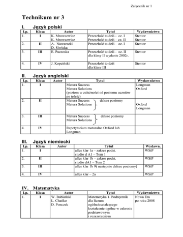Załącznik nr 1 Technikum nr 3 I. Lp. 1. Język polski 2. II 3. III Autor K. Mrowcewicz K. Mrowcewicz A. Nawarecki D. Siwicka E. Paczoska 4. IV J. Kopciński II. Lp. 1. 2. Klasa I Tytuł Przeszłość to dziś - cz. I Przeszłość to dziś – cz. II Przeszłość to dziś - cz. I Wydawnictwo Stentor Stentor Stentor Przeszłość to dziś - cz. II dla klasy II wydanie 2002r. Stentor Przeszłość to dziś dla klasy III Stentor Język angielski Klasa I Autor Tytuł Matura Success Matura Solutions (poziom w zależności od poziomu uczniów po teście) Matura Success dalsze poziomy Matura Solutions II 3. III Matura Success Matura Solutions 4. IV Repetytorium maturalne Oxford lub Longman III. Lp. 1. Wydawnictwo Longman Oxford Oxford Longman dalsze poziomy Język niemiecki Klasa I Autor 2. II 3. III Tytuł alles klar 1a – zakres podst. studio d A1 – Tom 1 alles klar 1b – zakres podst. studio dA1 – Tom 2 alles klar 1b 9( następnie dalsze poziomy) 4. IV alles klar – 2a Wydawn. WSiP WSiP WSiP WSiP IV. Matematyka Lp. 1. Klasa I Autor W. Babiański L. Chańko D. Ponczek Tytuł Wydawnictwo Matematyka 1. Podręcznik Nowa Era dla liceum po roku 2008 ogólnokształcącego kształcenie ogólne w zakresie podstawowym i rozszerzonym 2. II W. Babiański L. Chańko D. Ponczek 3. III W. Babiański L. Chańko D. Ponczek 4. IV W. Babiański L. Chańko D. Ponczek V. Lp. 1. 2. VI. Lp. 1. c.d. Matematyka 3 Nowa Era Podręcznik dla liceum ogólnokształcącego kształcenie ogólne w zakresie podstawowym i rozszerzonym Geografia Klasa I Autor II Tytuł Wydawnictwo Geografia na czasiePWN Geografia fizyczna świata i Polski. Podręcznik dla szkół ponadgimnazjalnych – zakres podstawowy Geografia na czasie – PWN Geografia społeczno – ekonomiczna Świata i Polski. Podręcznik dla szkół ponadgimnazjalnych – zakres podstawowy Chemia Klasa I Autor KM. Pazdro W. Danikiewicz K.M. Pazdro 2. 2 c.d. Matematyka 1, Nowa Era Matematyka 2 po roku 2008 Podręcznik dla liceum ogólnokształcącego kształcenie ogólne w zakresie podstawowym i rozszerzonym c.d. Matematyka 2, Nowa Era Matematyka 3 Podręcznik dla liceum ogólnokształcącego kształcenie ogólne w zakresie podstawowym i rozszerzonym II KM. Pazdro W. Danikiewicz K.M. Pazdro Tytuł Chemia – podręcznik do kształcenia podstawowego w liceach i technikach Zbiór zadań z chemii – zakres rozszerzony Kontynuacja Chemia – podręcznik do kształcenia podstawowego w liceach i technikach Zbiór zadań – zakres rozszerzony Wydawnictwo Oficyna Edukacyjna Oficyna Edukacyjna Oficyna Edukacyjna Oficyna Edukacyjna 3 VII. Biologia Lp. 1. 2. Klasa I II Autor W. Lewiński J. Prokop D. Skirmuntt J. Balerstet E. Bartnik i inni Tytuł Biologia 1 – zakres podstawowy Wydawnictwo Operon Biologia 2 – zakres podstawowy Operon VIII. Historia Lp. 1. 2. 3. Klasa I Autor B. Burda B. Halczak R. Józefiak M. Szymczak II B. Burda B. Halczak R. Józefiak M. Szymczak III IX. WOS Lp. 1. Klasa III 2. X. Lp. 2. IV B. Burda B. Halczak R. Józefiak M. Szymczak Autor L. Moryksiewicz M. Pacholska L. Moryksiewicz M. Pacholska Tytuł Wydawnictwo Historia 1. Zakres Operon podstawowy podręcznik dla LO i technikum i liceum Cz. 1 –Od czasów najdawniejszych do schyłku starożytności. Cz. 2 – Średniowiecze Historia 2. Czasy nowożytne. Operon Zakres podstawowy Podręcznik dla LO, LP i Technikum Historia 3. Historia najnowsza. Zakres podstawowy Podręcznik dla LO, LP i Technikum Operon Tytuł Wiedza o społeczeństwie. Wydawnictwo Nowa Era Kontynuacja Wiedza o społeczeństwie. Nowa Era Tytuł Wiedza o kulturze Wydawnictwo Operon Wiedza o kulturze Klasa IV Autor S. Ojak, A. Kisielewska, A. Kisielewski 4 XI. Lp. 1. Fizyka i astronomia Klasa I Autor B. Sagnowska Tytuł Fizyka i astronomia dla każdego. Wydawnictwo ZamKor, Kraków 2007 2. II B. Sagnowska Fizyka i astronomia dla każdego. ZamKor 3. III B. Sagnowska Fizyka i astronomia dla każdego. ZamKor 4. IV B. Sagnowska Fizyka i astronomia dla każdego. ZamKor XII. Przysposobienie obronne Lp. 1. 2. Klasa I II Autor Mariusz Goniewicz Anna W.Nowak Zbigniew Smutek Mariusz Goniewicz Anna W.Nowak Zbigniew Smutek Tytuł Podręcznik dla LO, LP i Technikum . Wydawnictwo OPERON 2007 Podręcznik dla LO, LP i Technikum , Cz. II OPERON 2007 XIII. Informatyka i technologia informacyjna Lp. 1. 2. Klasa I II Autor W. Wrotek W. Wrotek Tytuł Wydawnictwo Technologia informacyjna dla Helion 2005 szkół ponadgimnazjalnych Technologia informacyjna dla Helion 2005 szkół ponadgimnazjalnych XIV. Podstawy przedsiębiorczości Lp. 1. Klasa I Autor M. Belka 2. II M. Belka 3. IV M. Belka Tytuł Ekonomia stosowana. Podręcznik do podstaw przedsiębiorczości Ekonomia stosowana Podręcznik do podstaw przedsiębiorczości Ekonomia stosowana Podręcznik do podstaw przedsiębiorczości Wydawnictwo Fundacja Młodzieżowej Przedsiębiorczości Fundacja Młodzieżowej Przedsiębiorczości Fundacja Młodzieżowej Przedsiębiorczości 5 XV. Przedmioty zawodowe technik mechanik Lp. 1. 2. Klasa I i II I i II Autor J. Zawora T. Lewandowski 3. 4. I, II i III I, II i III B. Kozak B. Kozak 5. 6. III i IV III I IV A. Rutkowski S. Legutko 7. II Smoczyńscy 8. I S. Mac Tytuł Podstawy technologii maszyn Rysunek techniczny dla mechaników. Mechanika techniczna. Mechanika techniczna. Statyka –Testy. Części maszyn Podstawy eksploatacji maszyn. Przepisy ruchu drogowego Wydawnictwo WSiP WSiP Bezpieczeństwo i higiena pracy WSiP WSiP WSiP WSiP WSiP WSiP technik mechatronik - technologie i konstrukcje mechaniczne Lp. 1. 2. Klasa I II Autor T. Lewandowski B. Kozak Tytuł Rysunek techniczny dla mechaników Mechanika techniczna. Wydawnictwo WSiP WSiP Warszawa 2004 technik elektronik Lp. 1. 2. 3. 4. Klasa II III Autor M.B. Pióro J. Parchański IV W. Głocki J. Orzechowski Tytuł Podstawy elektroniki cz. I Miernictwo elektryczne i elektroniczne Układy cyfrowe Podstawy techniki telewizyjnej Wydawnictwo REA WSiP WSiP WSiP technik elektryk Lp. 1. 2. Klasa I, II III 3. 4. II