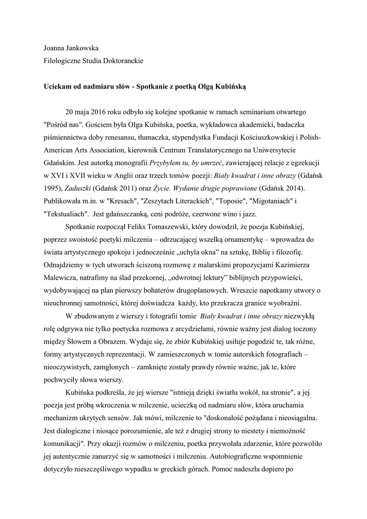 Joanna Jankowska Filologiczne Studia Doktoranckie Uciekam od nadmiaru słów - Spotkanie z poetką Olgą Kubińską 20 maja 2016 roku odbyło się kolejne spotkanie w ramach seminarium otwartego "Pośród nas". Gościem była Olga Kubińska, poetka, wykładowca akademicki, badaczka piśmiennictwa doby renesansu, tłumaczka, stypendystka Fundacji Kościuszkowskiej i PolishAmerican Arts Association, kierownik Centrum Translatorycznego na Uniwersytecie Gdańskim. Jest autorką monografii Przybyłem tu, by umrzeć, zawierającej relacje z egzekucji w XVI i XVII wieku w Anglii oraz trzech tomów poezji: Biały kwadrat i inne obrazy (Gdańsk 1995), Zaduszki (Gdańsk 2011) oraz Życie. Wydanie drugie poprawione (Gdańsk 2014). Publikowała m.in. w "Kresach", "Zeszytach Literackich", "Toposie", "Migotaniach" i "Tekstualiach". Jest gdańszczanką, ceni podróże, czerwone wino i jazz. Spotkanie rozpoczął Feliks Tomaszewski, który dowodził, że poezja Kubińskiej, poprzez swoistość poetyki milczenia – odrzucającej wszelką ornamentykę – wprowadza do świata artystycznego spokoju i jednocześnie „uchyla okna” na sztukę, Biblię i filozofię. Odnajdziemy w tych utworach ściszoną rozmowę z malarskimi propozycjami Kazimierza Malewicza, natrafimy na ślad przekornej, „odwrotnej lektury” biblijnych przypowieści, wydobywającej na plan pierwszy bohaterów drugoplanowych. Wreszcie napotkamy utwory o nieuchronnej samotności, której doświadcza każdy, kto przekracza granice wyobraźni. W zbudowanym z wierszy i fotografii tomie Biały kwadrat i inne obrazy niezwykłą rolę odgrywa nie tylko poetycka rozmowa z arcydziełami, równie ważny jest dialog toczony między Słowem a Obrazem. Wydaje się, że zbiór Kubińskiej usiłuje pogodzić te, tak różne, formy artystycznych reprezentacji. W zamieszczonych w tomie autorskich fotografiach – nieoczywistych, zamglonych – zamknięte zostały prawdy równie ważne, jak te, które pochwyciły słowa wierszy. Kubińska podkreśla, że jej wiersze "istnieją dzięki światłu wokół, na stronie", a jej poezja jest próbą wkroczenia w milczenie, ucieczką od nadmiaru słów, która uruchamia mechanizm ukrytych sensów. Jak mówi, milczenie to "doskonałość pożądana i nieosiągalna. Jest dialogiczne i niosące porozumienie, ale też z drugiej strony to niestety i niemożność komunikacji". Przy okazji rozmów o milczeniu, poetka przywołała zdarzenie, które pozwoliło jej autentycznie zanurzyć się w samotności i milczeniu. Autobiograficzne wspomnienie dotyczyło nieszczęśliwego wypadku w greckich górach. Pomoc nadeszła dopiero po kilkudziesięciu godzinach. „Nie czułam bólu. Dobrze mi było samej ze sobą, w samotności. To milczenie było świetne" – opowiadała z uśmiechem. Pytana o proces twórczy, o ulubione pory pisania, zapewniała, że najchętniej pracuje w nocy, bo wtedy można „pisać własną głową”. Najważniejsze jest redukowanie słów, niekiedy krańcowe: „Uciekam od ich nadmiaru. Jedna linijka. I rzeźbię, likwiduję zbędności, obcinam. To taka „dłubanina” wokół metafory. Słowa są bardzo ważne. Wtedy zagęszczają się sensy. Całe pisanie jest po to, by wycinać naddatki”. Nie mogło się obejść bez pytania o problematykę przekładu i prośby o przekłady własnych utworów. Kubińska uważa, że niektóre wiersze wymykają się przekładom, ale – jej zdaniem – nie ma złych tłumaczeń, bo wszystkie pokazują inne czytanie, inne rozumienie cudzego słowa, a to zawsze wzbogaca. Wiele satysfakcji sprawił jej przekład wierszy Julii Hartwig na język angielski: „Jej lapidarność – podkreślała – jest niezwykła, pod pozorem prostoty jawią się nowe sensy”. Poezja Olgi Kubińskiej to poezja ascetyczna, w której nie ma zbędnych słów, a wiersze kończą się puentą – zaskakującą, nawet szokującą. Konkluzją spotkania niech będą słowa Feliksa Tomaszewskiego: „Jestem szczęśliwy, że istnieje ten typ pisania, który uprawia Kubińska. To przywraca godność słowu. Ta poezja jest czystym poetyckim głosem wobec zalewu internetowego poetyckiego wielosłowia”.