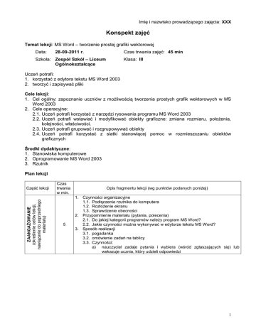 Imię i nazwisko prowadzącego zajęcia: XXX Konspekt zajęć Temat lekcji: MS Word – tworzenie prostej grafiki wektorowej Data: Czas trwania zajęć: 45 min 28-09-2011 r. Szkoła: Zespół Szkół – Liceum Ogólnokształcące Klasa: III Uczeń potrafi: 1. korzystać z edytora tekstu MS Word 2003 2. tworzyć i zapisywać pliki Cele lekcji: 1. Cel ogólny: zapoznanie uczniów z możliwością tworzenia prostych grafik wektorowych w MS Word 2003 2. Cele operacyjne: 2.1. Uczeń potrafi korzystać z narzędzi rysowania programu MS Word 2003 2.2. Uczeń potrafi wstawiać i modyfikować obiekty graficzne: zmiana rozmiaru, położenia, kolejności, właściwości. 2.3. Uczeń potrafi grupować i rozgrupowywać obiekty 2.4. Uczeń potrafi korzystać z siatki stanowiącej pomoc w rozmieszczaniu obiektów graficznych Środki dydaktyczne: 1. Stanowiska komputerowe 2. Oprogramowanie MS Word 2003 3. Rzutnik Plan lekcji ZAANGAŻOWANIE (określenie celów lekcji, nawiązanie do poprzedniego materiału) Część lekcji Czas trwania w min. Opis fragmentu lekcji (wg punktów podanych poniżej) 5 1. Czynności organizacyjne 1.1. Podłączenie rzutnika do komputera 1.2. Rozłożenie ekranu 1.3. Sprawdzenie obecności 2. Przypomnienie materiału (pytania, polecenia) 2.1. Do jakiej kategorii programów należy program MS Word? 2.2. Jakie czynności można wykonywać w edytorze tekstu MS Word? 3. Sposób realizacji 3.1. pogadanka 3.2. omówienie zadań na tablicy 3.3. Czynności: a) nauczyciel zadaje pytania i wybiera (wśród zgłaszających się) lub wskazuje ucznia, który udzieli odpowiedzi 1 POSZUKIWANIE (wprowadzenie nowych treści, poszukiwanie rozwiązania problemu) 15 TRANSFORMACJA (ćwiczenie umiejętności, praca samodzielna) 20 PREZENTACJA REFLEKSJA (podsumowanie lekcji) 5 1. Materiał rzeczowy 1.1. Omówienie możliwości wykonywania prostych grafik wektorowych w MS Word 1.2. Omówienie paska narzędzi Rysowanie 2. Środki dydaktyczne 2.1. stanowisko komputerowe nauczyciela 2.2. rzutnik 3. Sposób realizacji 3.1. wykład 3.2. Czynności: a) nauczyciel prezentuje i omawia przykłady b) uczniowie słuchają 4. Osiągane cele 4.1. Uczeń zapoznaje się z możliwością wykonywania prostej grafiki wektorowej w MS Word 1. Materiał rzeczowy 1.1. Wykonanie strony rysunku stanowiącego załącznik do niniejszego konspektu 2. Sposób realizacji 2.1. samodzielna praca uczniów przy stanowiskach komputerowych 2.2. nadzór nauczyciela i naprowadzanie na właściwy tok (w razie potrzeby) 3. Osiągane cele 3.1. Uczeń potrafi wstawiać i modyfikować obiekty graficzne: zmiana rozmiaru, położenia, kolejności, właściwości. 3.2. Uczeń potrafi grupować i rozgrupowywać obiekty 3.3. Uczeń potrafi korzystać z siatki stanowiącej pomoc w rozmieszczaniu obiektów graficznych 4. Sposób sprawdzania 4.1. doglądanie pracy uczniów 1. Materiał rzeczowy 1.1. Podsumowanie materiału a) Krótkie omówienie poznanych funkcjonalności paska Rysowanie 2. Sposób realizacji 2.1. wykład 2.2. czynności: a) nauczyciel mówi b) uczniowie słuchają 2 Załączniki: Rysunek: Myślę, więc jestem… 3