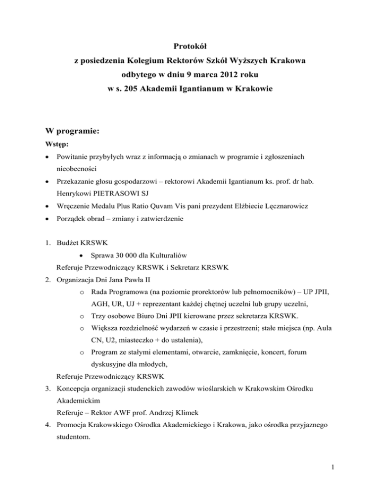 Protokół z posiedzenia Kolegium Rektorów Szkół Wyższych Krakowa odbytego w dniu 9 marca 2012 roku w s. 205 Akademii Igantianum w Krakowie W programie: Wstęp: • Powitanie przybyłych wraz z informacją o zmianach w programie i zgłoszeniach nieobecności • Przekazanie głosu gospodarzowi – rektorowi Akademii Igantianum ks. prof. dr hab. Henrykowi PIETRASOWI SJ • Wręczenie Medalu Plus Ratio Quvam Vis pani prezydent Elżbiecie Lęcznarowicz • Porządek obrad – zmiany i zatwierdzenie 1. Budżet KRSWK • Sprawa 30 000 dla Kulturaliów Referuje Przewodniczący KRSWK i Sekretarz KRSWK 2. Organizacja Dni Jana Pawła II o Rada Programowa (na poziomie prorektorów lub pełnomocników) – UP JPII, AGH, UR, UJ + reprezentant każdej chętnej uczelni lub grupy uczelni, o Trzy osobowe Biuro Dni JPII kierowane przez sekretarza KRSWK. o Większa rozdzielność wydarzeń w czasie i przestrzeni; stałe miejsca (np. Aula CN, U2, miasteczko + do ustalenia), o Program ze stałymi elementami, otwarcie, zamknięcie, koncert, forum dyskusyjne dla młodych, Referuje Przewodniczący KRSWK 3. Koncepcja organizacji studenckich zawodów wioślarskich w Krakowskim Ośrodku Akademickim Referuje – Rektor AWF prof. Andrzej Klimek 4. Promocja Krakowskiego Ośrodka Akademickiego i Krakowa, jako ośrodka przyjaznego studentom. 1 Referują: Kinga Drechny - Mucha Kierownik Biura Promocji UJ i Wiceprezydent Krakowa Magdalena Sroka 5. Informacja o projekcie Study in Kraków – rozwój współpracy na arenie międzynarodowej • Informacja o staraniach o środki z funduszy regionalnych 8.1 Referuje – Rektor UEK prof. Roman Niestrój • Podsumowanie dotychczasowej działalności oraz budżet na 2012 Referuje mgr Agnieszka Nawrocka - Kierownik Dz.Współpracy Międzynarodowej UEK • Plany na przyszłość Referuje. Mirosław Klimkiewicz, Kier. Biura Obsługi Studentów Obcokrajowców UJ 6. Zamiana organizatora Festiwalu Nauki w Krakowie w 2013 roku oraz przyjęcie do grona organizatorów Festiwalu Instytutu Botaniki im. W. Szafera PAN 7. Informacja o EURODOC (Zajazd Sprawozdawczo-Wyborczy Europejskiej Rady Doktorantów i Młodych Naukowców) Referują: Sekretarz PDUK wraz z osobą z AGH. 8. Chór Akademicki Ref. Przewodnicząc KRSWK + prorektor UR 9. Prezentacja planów PSSUK na najbliższy okres – Juwenalia Krakowskie 2012 Referuje: Przewodnicząca PSSUK Agnieszka Sadowska Przewodniczący KRSWK prof. Karol Musioł powitał wszystkich przybyłych na posiedzenie KRSWK, wśród nich szczególnie serdecznie gościa honorowego byłą panią prezydent miasta Krakowa Elżbietę Lęcznarowicz oraz osoby po raz pierwszy uczestniczące w pracach KRSWK: o panie wiceprezydent m. Krakowa Elżbietę Koterbę i Magdalenę Srokę, o dyrektor KS z AZS AWF Kraków Renatę Nierodę, o nową przewodnicząca Porozumienia Samorządów Studenckich Uczelni Krakowa Agnieszkę Sadowską. o Sekretarza PDUK Wojciecha Cichonia wraz z Klaudią Czopek organizatorką Zjazdu EURODOC Poinformował, że usprawiedliwi nieobecność na posiedzeniu: a) rektorzy: o PWSZ w Sanoku prof. Halina Mieczkowska o Uniwersytetu Rolniczego w Krakowie prof. Janusz Żmija 2 o Akademii Muzycznej w Krakowie prof. Stanisław Krawczyński o PWSZ w Tarnowie prof. Stanisław Komornicki o Prorektor UJ ds. Collegium Medicum prof. Wojciech Nowak b) Prezes PAN prof. dr hab. Ryszard Tadeusiewicz c) Dyrektor ACK Cyfronet AGH prof. dr hab. Kazimierz Wiatr Ze względu na zgłoszenie w ostatniej chwili wielu dodatkowych spraw do omówienia zastrzegł, że program posiedzenia będzie realizowany w tradycyjnych ramach czasowych tj. 2 godzin, w związku z czym punkty, które nie zostaną przedyskutowane zostaną przesunięte na następne posiedzenie KRSWK, które zostanie zorganizowane w maju. Przypomniał, że oprócz tego zostanie zorganizowane jeszcze spotkanie wyborcze KRSWK. Jedno z tych posiedzeń KRSWK odbędzie się w ośrodku Uniwersytetu Rolniczego w Krynicy. Poprosił gospodarza posiedzenia ks. rektora Akademii Ignatianum Henryka Pietrasa o krótkie zaprezentowanie jego uczelni. Rektor Akademii Ignatianum ks. prof. Henryk Pietras poinformował, że jego uczelnia w tym roku będzie obchodzić 80-lecie otrzymania praw akademickich. Na początku swego istnienia uczelnia miała prawa do nadawania stopni naukowych w zakresie filozofii. Przez wiele lat uczelnia kształciła nieliczną grupę studentów, w latach 70-tych ubiegłego wieku, gdy studiował ks. rektor, było 22 studentów na całej uczelni. Obecnie kształci 3 tys. studentów. W 2010 roku uzyskała prawo do nadawania stopnia doktora nauk humanistycznych w dyscyplinie pedagogika, a na początku 2012 roku do nadawania stopnia doktora nauk humanistycznych w dyscyplinie kulturoznawstwo. Dzięki funduszom strukturalnym zdołano w ostatnich latach znacząco powiększyć bazę lokalową uczelni. Przewodniczący KRSWK prof. Karol Musioł podziękował za prezentację uczelni, pogratulował dotychczasowych osiągnięć i życzył dalszego skutecznego rozwijania uczelni. Wręczenie Medalu Plus Ratio Quvam Vis pani prezydent Elżbiecie Lęcznarowicz Przewodniczący KRSWK prof. Karol Musioł podziękował pani Elżbiecie Lęcznarowicz za długoletnią owocną współpracę z Kolegium Rektorów Szkół Wyższych Krakowa, początkowo w charakterze Małopolskiego Kuratora Oświaty, a następnie Zastępcy 3 Prezydenta m. Krakowa ds. edukacji. Jako symboliczny dowód uznania dla dorobku Pani Prezydent wręczył jej Medal Plus Ratio Quam Vis. Pani Elżbieta Lęcznarowicz przypomniała, że gdy 9 lat temu po raz pierwszy została zaproszona na obrady KRSWK, z niepokojem udała się na pierwsze posiedzenie. Szybko okazało się, że KRSWK to grono skupione na konstruktywnych działaniach i gwarantujące merytoryczne wsparcie realizacji trudnych zadań. Zaczęło się od dyskusji nad reformą maturalną, która budziła wiele obaw. Później współpraca objęła m.in. wsparcie dla maturzystów realizowane przez AGH, rea