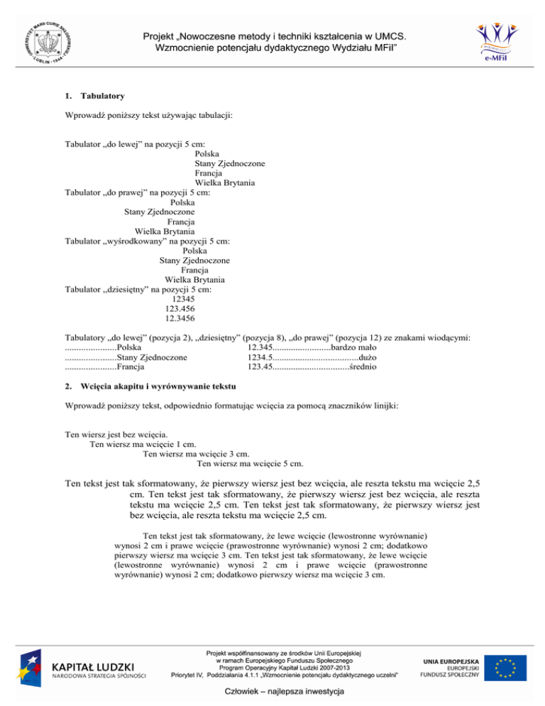 1. Tabulatory Wprowadź poniższy tekst używając tabulacji: Tabulator „do lewej” na pozycji 5 cm: Polska Stany Zjednoczone Francja Wielka Brytania Tabulator „do prawej” na pozycji 5 cm: Polska Stany Zjednoczone Francja Wielka Brytania Tabulator „wyśrodkowany” na pozycji 5 cm: Polska Stany Zjednoczone Francja Wielka Brytania Tabulator ,,dziesiętny” na pozycji 5 cm: 12345 123.456 12.3456 Tabulatory „do lewej” (pozycja 2), „dziesiętny” (pozycja 8), „do prawej” (pozycja 12) ze znakami wiodącymi: ......................Polska 12.345.........................bardzo mało ......................Stany Zjednoczone 1234.5.....................................dużo ......................Francja 123.45.................................średnio 2. Wcięcia akapitu i wyrównywanie tekstu Wprowadź poniższy tekst, odpowiednio formatując wcięcia za pomocą znaczników linijki: Ten wiersz jest bez wcięcia. Ten wiersz ma wcięcie 1 cm. Ten wiersz ma wcięcie 3 cm. Ten wiersz ma wcięcie 5 cm. Ten tekst jest tak sformatowany, że pierwszy wiersz jest bez wcięcia, ale reszta tekstu ma wcięcie 2,5 cm. Ten tekst jest tak sformatowany, że pierwszy wiersz jest bez wcięcia, ale reszta tekstu ma wcięcie 2,5 cm. Ten tekst jest tak sformatowany, że pierwszy wiersz jest bez wcięcia, ale reszta tekstu ma wcięcie 2,5 cm. Ten tekst jest tak sformatowany, że lewe wcięcie (lewostronne wyrównanie) wynosi 2 cm i prawe wcięcie (prawostronne wyrównanie) wynosi 2 cm; dodatkowo pierwszy wiersz ma wcięcie 3 cm. Ten tekst jest tak sformatowany, że lewe wcięcie (lewostronne wyrównanie) wynosi 2 cm i prawe wcięcie (prawostronne wyrównanie) wynosi 2 cm; dodatkowo pierwszy wiersz ma wcięcie 3 cm. 3. Wyliczenia Wprowadź poniższy tekst z odpowiednimi wcięciami i znakami wyliczenia: Atrybuty czcionki: 1. Krój, np. a. Times New Roman b. Arial c. Courier New 2. Rozmiar 3. Styl, np. a. Pogrubienie b. Kursywa c. Podkreślenie 4. Kolor Atrybuty czcionki: • Krój, np. Times New Roman Arial Courier New • Rozmiar • Styl, np. Pogrubienie Kursywa Podkreślenie • Kolor