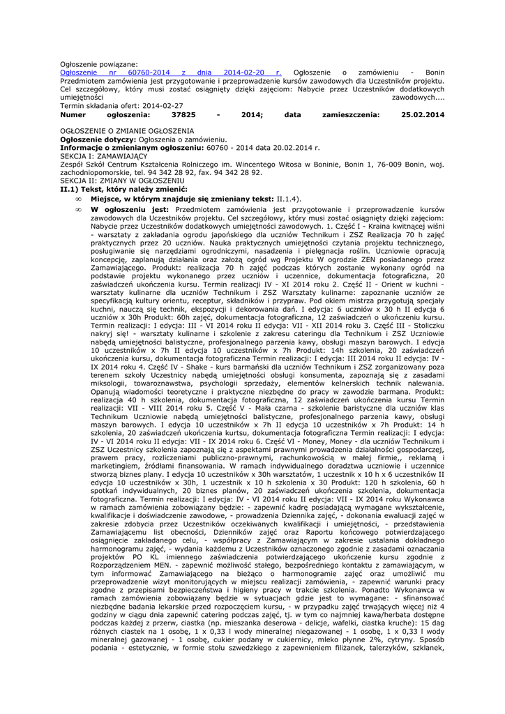 Ogłoszenie powiązane: Ogłoszenie nr 60760-2014 z dnia 2014-02-20 r. Ogłoszenie o zamówieniu Bonin Przedmiotem zamówienia jest przygotowanie i przeprowadzenie kursów zawodowych dla Uczestników projektu. Cel szczegółowy, który musi zostać osiągnięty dzięki zajęciom: Nabycie przez Uczestników dodatkowych umiejętności zawodowych.... Termin składania ofert: 2014-02-27 Numer ogłoszenia: 37825 2014; data zamieszczenia: 25.02.2014 OGŁOSZENIE O ZMIANIE OGŁOSZENIA Ogłoszenie dotyczy: Ogłoszenia o zamówieniu. Informacje o zmienianym ogłoszeniu: 60760 - 2014 data 20.02.2014 r. SEKCJA I: ZAMAWIAJĄCY Zespół Szkół Centrum Kształcenia Rolniczego im. Wincentego Witosa w Boninie, Bonin 1, 76-009 Bonin, woj. zachodniopomorskie, tel. 94 342 28 92, fax. 94 342 28 92. SEKCJA II: ZMIANY W OGŁOSZENIU II.1) Tekst, który należy zmienić: • Miejsce, w którym znajduje się zmieniany tekst: II.1.4). • W ogłoszeniu jest: Przedmiotem zamówienia jest przygotowanie i przeprowadzenie kursów zawodowych dla Uczestników projektu. Cel szczegółowy, który musi zostać osiągnięty dzięki zajęciom: Nabycie przez Uczestników dodatkowych umiejętności zawodowych. 1. Część I - Kraina kwitnącej wiśni - warsztaty z zakładania ogrodu japońskiego dla uczniów Technikum i ZSZ Realizacja 70 h zajęć praktycznych przez 20 uczniów. Nauka praktycznych umiejętności czytania projektu technicznego, posługiwanie się narzędziami ogrodniczymi, nasadzenia i pielęgnacja roślin. Uczniowie opracują koncepcję, zaplanują działania oraz założą ogród wg Projektu W ogrodzie ZEN posiadanego przez Zamawiającego. Produkt: realizacja 70 h zajęć podczas których zostanie wykonany ogród na podstawie projektu wykonanego przez uczniów i uczennice, dokumentacja fotograficzna, 20 zaświadczeń ukończenia kursu. Termin realizacji IV - XI 2014 roku 2. Część II - Orient w kuchni warsztaty kulinarne dla uczniów Technikum i ZSZ Warsztaty kulinarne: zapoznanie uczniów ze specyfikacją kultury orientu, receptur, składników i przypraw. Pod okiem mistrza przygotują specjały kuchni, nauczą się technik, ekspozycji i dekorowania dań. I edycja: 6 uczniów x 30 h II edycja 6 uczniów x 30h Produkt: 60h zajęć, dokumentacja fotograficzna, 12 zaświadczeń o ukończeniu kursu. Termin realizacji: I edycja: III - VI 2014 roku II edycja: VII - XII 2014 roku 3. Część III - Stoliczku nakryj się! - warsztaty kulinarne i szkolenie z zakresu cateringu dla Technikum i ZSZ Uczniowie nabędą umiejętności balistyczne, profesjonalnego parzenia kawy, obsługi maszyn barowych. I edycja 10 uczestników x 7h II edycja 10 uczestników x 7h Produkt: 14h szkolenia, 20 zaświadczeń ukończenia kursu, dokumentacja fotograficzna Termin realizacji: I edycja: III 2014 roku II edycja: IV IX 2014 roku 4. Część IV - Shake - kurs barmański dla uczniów Technikum i ZSZ zorganizowany poza terenem szkoły Uczestnicy nabędą umiejętności obsługi konsumenta, zapoznają się z zasadami miksologii, towaroznawstwa, psychologii sprzedaży, elementów kelnerskich technik nalewania. Opanują wiadomości teoretyczne i praktyczne niezbędne do pracy w zawodzie barmana. Produkt: realizacja 40 h szkolenia, dokumentacja fotograficzna, 12 zaświadczeń ukończenia kursu Termin realizacji: VII - VIII 2014 roku 5. Część V - Mała czarna - szkolenie baristyczne dla uczniów klas Technikum Uczniowie nabędą umiejętności balistyczne, profesjonalnego parzenia kawy, obsługi maszyn barowych. I edycja 10 uczestników x 7h II edycja 10 uczestników x 7h Produkt: 14 h szkolenia, 20 zaświadczeń ukończenia kurtsu, dokumentacja fotograficzna Termin realizacji: I edycja: IV - VI 2014 roku II edycja: VII - IX 2014 roku 6. Część VI - Money, Money - dla uczniów Technikum i ZSZ Uczestnicy szkolenia zapoznają się z aspektami prawnymi prowadzenia działalności gospodarczej, prawem pracy, rozliczeniami publiczno-prawnymi, rachunkowością w małej firmie,, reklamą i marketingiem, źródłami finansowania. W ramach indywidualnego doradztwa uczniowie i uczennice stworzą biznes plany. I edycja 10 uczestników x 30h warsztatów, 1 uczestnik x 10 h x 6 uczestników II edycja 10 uczestników x 30h, 1 uczestnik x 10 h szkolenia x 30 Produkt: 120 h szkolenia, 60 h spotkań indywidualnych, 20 biznes planów, 20 zaświadczeń ukończenia szkolenia, dokumentacja fotograficzna. Termin realizacji: I edycja: IV - VI 2014 roku II edycja: VII - IX 2014 roku Wykonawca w ramach zamówienia zobowiązany będzie: - zapewnić kadrę posiadającą wymagane wykształcenie, kwalifikacje i doświadczenie zawodowe, - prowadzenia Dziennika zajęć, - dokonania ewaluacji zajęć w zakresie zdobycia przez Uczestników oczekiwanych kwalifikacji i umiejętności, - przedstawienia Zamawiającemu list obecności, Dzienników zajęć oraz Raportu końcowego potwierdzającego osiągnięcie zakładanego celu, - współpracy z Zamawiającym w zakresie ustalania dokładnego harmonogramu zajęć, - wydania każdemu z Uczestników oznaczonego zgodnie z zasadami oznaczania projektów PO KL imiennego zaświadczenia potwierdzającego ukończenie kursu zgodnie z Rozporządzeniem MEN. - zapewnić możliwość stałego, bezpośredniego kontaktu z zamawiającym, w tym informować Zamawiającego na bieżąco o harmonogramie zajęć oraz umożliwić mu przeprowadzenie wizyt monitorujących w miejscu realizacji zamówienia, - zapewnić warunki pracy zgodne z przepisami bezpieczeństwa i higieny pracy w trakcie szkolenia. Ponadto Wykonawca w ramach zamówienia zobowiązany będzie w sytuacjach gdzie jest to wymagane: - sfinansować niezbędne badania lekarskie przed rozpoczęciem kursu, - w przypadku zajęć trwających więcej niż 4 godziny w ciągu dnia zapewnić catering podczas zajęć, tj. w tym co najmniej kawa/herbata dostępne podczas każdej z przerw, ciastka (np. mieszanka deserowa - delicje, wafelki, ciastka kruche): 15 dag różnych ciastek na 1 osobę, 1 