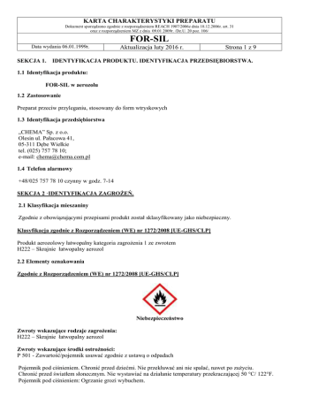 KARTA CHARAKTERYSTYKI PREPARATU Dokument sporządzono zgodnie z rozporządzeniem REACH 1907/2006z dnia 18.12.2006r. art. 31 oraz z rozporządzeniem MZ z dnia 09.01 2009r. /Dz.U. 20 poz. 106/ FOR-SIL Data wydania 06.01.1999r. SEKCJA 1. Aktualizacja luty 2016 r. Strona 1 z 9 IDETYFIKACJA PRODUKTU. IDETYFIKACJA PRZEDSIĘBIORSTWA. 1.1 Identyfikacja produktu: FOR-SIL w aerozolu 1.2 Zastosowanie Preparat przeciw przyleganiu, stosowany do form wtryskowych 1.3 Identyfikacja przedsiębiorstwa „CHEMA” Sp. z o.o. Olesin ul. Pałacowa 41, 05-311 Dębe Wielkie tel. (025) 757 78 10; e-mail: [email protected] 1.4 Telefon alarmowy +48/025 757 78 10 czynny w godz. 7-14 SEKCJA 2 ·IDETYFIKACJA ZAGROŻEŃ. 2.1 Klasyfikacja mieszaniny Zgodnie z obowiązującymi przepisami produkt został sklasyfikowany jako niebezpieczny. Klasyfikacja zgodnie z Rozporządzeniem (WE) nr 1272/2008 [UE-GHS/CLP] Produkt aerozolowy łatwopalny kategoria zagrożenia 1 ze zwrotem H222 – Skrajnie łatwopalny aerozol 2.2 Elementy oznakowania Zgodnie z Rozporządzeniem (WE) nr 1272/2008 [UE-GHS/CLP] iebezpieczeństwo Zwroty wskazujące rodzaje zagrożenia: H222 – Skrajnie łatwopalny aerozol Zwroty wskazujące środki ostrożności: P 501 - Zawartość/pojemnik usuwać zgodnie z ustawą o odpadach Pojemnik pod ciśnieniem. Chronić przed dziećmi. Nie przekłuwać ani nie spalać, nawet po zużyciu. Chronić przed światłem słonecznym. Nie wystawiać na działanie temperatury przekraczającej 50 °C/ 122°F. Pojemnik pod ciśnieniem: Ogrzanie grozi wybuchem. KARTA CHARAKTERYSTYKI PREPARATU Dokument sporządzono zgodnie z rozporządzeniem REACH 1907/2006z dnia 18.12.2006r. art. 31 oraz z rozporządzeniem MZ z dnia 09.01 2009r. /Dz.U. 20 poz. 106/ FOR-SIL Data wydania 06.01.1999r. Aktualizacja luty 2016 r. Strona 2 z 9 2.3 Inne zagrożenia Mieszanina nie spełnia kryteriów klasyfikacji PTB i vPvB Zagrożenia fizykochemiczne:Mieszanina ze względu na zawartość gazów nośnych jest skrajnie łatwopalny i może tworzyć z powietrzem mieszaniny wybuchowe. Zagrożenia dla zdrowia człowieka: Preparat może wchłaniać się przez układ oddechowy i skórę. Rozpylony preparat może działać drażniąco na oczy, błonę śluzową układu oddechowego. Zagrożenie dla środowiska: Brak danych SEKCJA 3. SKŁAD/IFORMACJA O SKŁADIKACH. Nazwa Numery identyfikacyjne substancji Zawartość % Klasyfikacja wg (WE) 1272/2008 . Klas. wg dyrektywy 67/548/EWG Nr rejestracji Nr Cas 75-28-5[1] Izobutan* Nr WE (EINECS)200-857-2[1] < 80 % - F+: R 12 brak Nr indeksowy 601-004-00-0 Dla rozpuszczalników mają zastosowanie: Nota P lub Nota H *produkt zawiera w stężeniu mniejszym niż 0,1% (m/m) 1,3 butadien, który w śladowych ilościach nie jest szkodliwym dla zdrowia składnikiem SEKCJA 4. ŚRODKI PIERWSZEJ POMOCY 4.1 Opis środków pierwszej pomocy Zatrucie inhalacyjne: Wyprowadzić na świeże powietrze. W przypadku pojawienia się trudności w oddychaniu podać tlen. Poszkodowanemu zapewnić spokój i chronić przed utratą ciepła. Jeżeli poszkodowany jest nieprzytomny - należy go przenieść na świeże powietrze i ułożyć w pozycji bocznej ustalonej. Usunąć z jamy ustnej ruchome protezy i inne ciała obce. Podać tlen, a w przypadku zatrzymania oddechu podjąć sztuczne oddychanie. Zapewnić spokój i chronić przed utratą ciepła. Wezwać jak najszybciej lekarza i odwieźć poszkodowanego do szpitala. Zatrucie doustne: Nie powodować wymiotów. Nie podawać mleka, tłuszczów i alkoholu. W przypadku utraty przytomności postępować jak w zatruciu drogą oddechową. Wezwać jak najszybciej lekarza. Skażenie oczu:Przemywać oczy dużą ilością wody, przez co najmniej 15 minut. W trakcie przemywania powieki należy utrzymywać lekko odciągnięte i otwarte. Stosować łagodny strumień wody. Zwrócić się o pomoc lekarską. Skażenie skóry:Zdjąć jak najszybciej skażoną odzież. Przemywać skórę dużą ilością wody z mydłem. Przy utrzymującym się podrażnieniu lub nasileniu się objawów skonsultować z lekarzem. 4.2 ajważniejsze ostre i opóźnione objawy oraz skutki narażenia. Ostre objawy: Kontakt ze skórą wywołuje podrażnienia i zaczerwienienia skóry, możliwe odmrożenia. Kontakt z oczami może powodować lekkie podrażnienie, łzawienie, zaczerwienienie spojówek przy dłuższej ekspozycji. Połknięcie powoduje bóle brzucha. Opóźnione objawy Zaburzenia ze strony układu nerwowego, stany zapalne skóry i oczu. Skutki narażenia: Brak danych KARTA CHARAKTERYSTYKI PREPARATU Dokument sporządzono zgodnie z rozporządzeniem REACH 1907/2006z dnia 18.12.2006r. art. 31 oraz z rozporządzeniem MZ z dnia 09.01 2009r. /Dz.U. 20 poz. 106/ FOR-SIL Data wydania 06.01.1999r. Aktualizacja luty 2016 r. Strona 3 z 9 4.3 Wskazania dotyczące wszelkiej natychmiastowej pomocy lekarskiej i szczególnego postępowania Informacja dla lekarza: stosować leczenie objawowe. SEKCJA 5. POSTĘPOWAIE W PRZYPADKU POŻARU 5.1 Środki gaśnicze: Stosować: Piany gaśnicze odporne na działanie alkoholi, suche środki gaśnicze, dwutlenek węgla, rozpylona woda. Niewielki pożar gasić gaśnicą śniegową lub proszkową. iewłaściwe środki gaśnicze: Woda podawana silnym strumieniem. 5.2 Szczególne zagrożenia Produkt zawiera gazy pod ciśnieniem istnieje możliwość wybuchu. Podczas pożaru w wyniku spalania lub termicznego rozkładu produktu mogą wydzielać się toksyczne gazy i dymy 5.3 Informacje dla straży pożarnej: Stosować aparaty ochrony dróg oddechowych, pełna odzież ochronna – najlepiej ogniotrwała typu Nomex i ubrania żaroodporne. Zalecenia ogólne: Zawiadomić otoczenie o awarii. Usunąć z rejonu zagrożenia wszystkie osoby niebiorące udziału w akcji gaśniczej. Powiadomić Państwową Straż Pożarną, a w razie konieczności władze terenowe i najbliższą jednostkę Ratownictwa Chemicznego. W przypadku zagrożenia wybuchem stosować dodatkowe środki ochronne odporne na działanie promieniowania ciepl