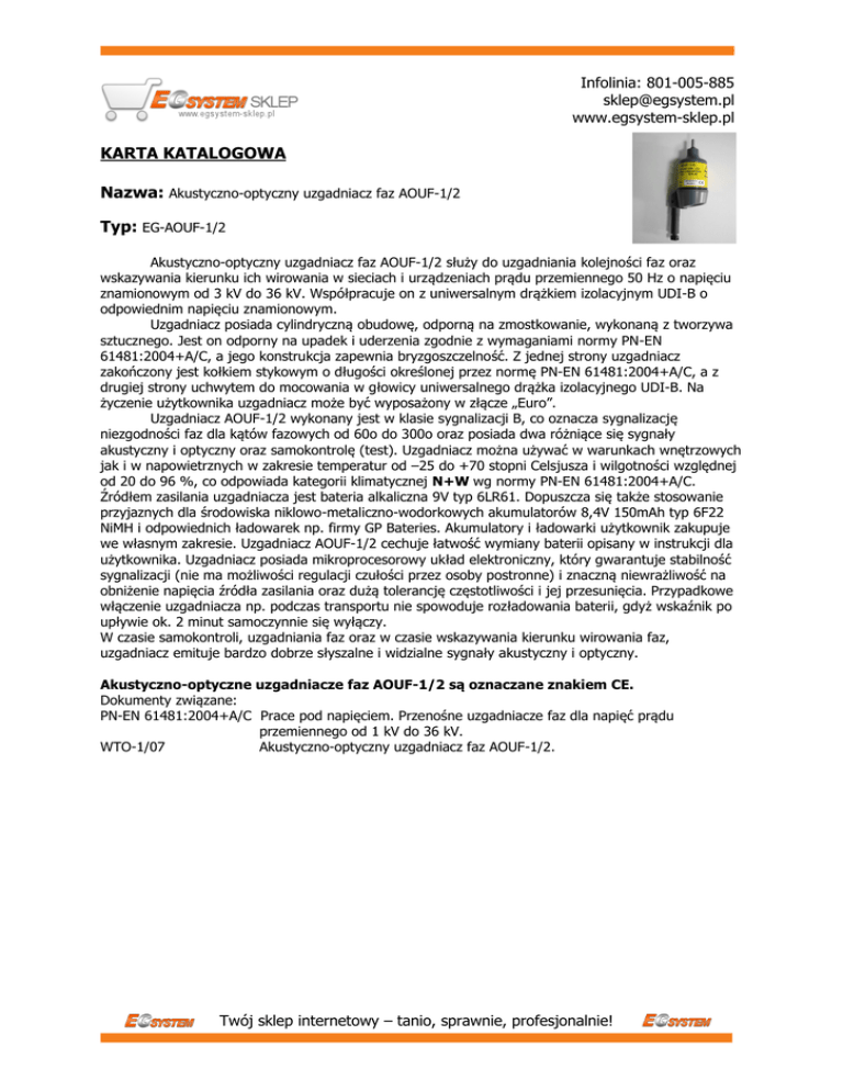 Infolinia: 801-005-885 [email protected] www.egsystem-sklep.pl KARTA KATALOGOWA Nazwa: Akustyczno-optyczny uzgadniacz faz AOUF-1/2 Typ: EG-AOUF-1/2 Akustyczno-optyczny uzgadniacz faz AOUF-1/2 służy do uzgadniania kolejności faz oraz wskazywania kierunku ich wirowania w sieciach i urządzeniach prądu przemiennego 50 Hz o napięciu znamionowym od 3 kV do 36 kV. Współpracuje on z uniwersalnym drążkiem izolacyjnym UDI-B o odpowiednim napięciu znamionowym. Uzgadniacz posiada cylindryczną obudowę, odporną na zmostkowanie, wykonaną z tworzywa sztucznego. Jest on odporny na upadek i uderzenia zgodnie z wymaganiami normy PN-EN 61481:2004+A/C, a jego konstrukcja zapewnia bryzgoszczelność. Z jednej strony uzgadniacz zakończony jest kołkiem stykowym o długości określonej przez normę PN-EN 61481:2004+A/C, a z drugiej strony uchwytem do mocowania w głowicy uniwersalnego drążka izolacyjnego UDI-B. Na życzenie użytkownika uzgadniacz może być wyposażony w złącze „Euro”. Uzgadniacz AOUF-1/2 wykonany jest w klasie sygnalizacji B, co oznacza sygnalizację niezgodności faz dla kątów fazowych od 60o do 300o oraz posiada dwa różniące się sygnały akustyczny i optyczny oraz samokontrolę (test). Uzgadniacz można używać w warunkach wnętrzowych jak i w napowietrznych w zakresie temperatur od –25 do +70 stopni Celsjusza i wilgotności względnej od 20 do 96 %, co odpowiada kategorii klimatycznej N+W wg normy PN-EN 61481:2004+A/C. Źródłem zasilania uzgadniacza jest bateria alkaliczna 9V typ 6LR61. Dopuszcza się także stosowanie przyjaznych dla środowiska niklowo-metaliczno-wodorkowych akumulatorów 8,4V 150mAh typ 6F22 NiMH i odpowiednich ładowarek np. firmy GP Bateries. Akumulatory i ładowarki użytkownik zakupuje we własnym zakresie. Uzgadniacz AOUF-1/2 cechuje łatwość wymiany baterii opisany w instrukcji dla użytkownika. Uzgadniacz posiada mikroprocesorowy układ elektroniczny, który gwarantuje stabilność sygnalizacji (nie ma możliwości regulacji czułości przez osoby postronne) i znaczną niewrażliwość na obniżenie napięcia źródła zasilania oraz dużą tolerancję częstotliwości i jej przesunięcia. Przypadkowe włączenie uzgadniacza np. podczas transportu nie spowoduje rozładowania baterii, gdyż wskaźnik po upływie ok. 2 minut samoczynnie się wyłączy. W czasie samokontroli, uzgadniania faz oraz w czasie wskazywania kierunku wirowania faz, uzgadniacz emituje bardzo dobrze słyszalne i widzialne sygnały akustyczny i optyczny. Akustyczno-optyczne uzgadniacze faz AOUF-1/2 są oznaczane znakiem CE. Dokumenty związane: PN-EN 61481:2004+A/C Prace pod napięciem. Przenośne uzgadniacze faz dla napięć prądu przemiennego od 1 kV do 36 kV. WTO-1/07 Akustyczno-optyczny uzgadniacz faz AOUF-1/2. Twój sklep internetowy – tanio, sprawnie, profesjonalnie! Infolinia: 801-005-885 [email protected] www.egsystem-sklep.pl Twój sklep internetowy – tanio, sprawnie, profesjonalnie!