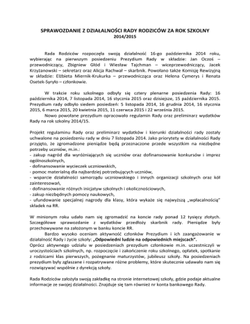 SPRAWOZDANIE Z DZIAŁALNOŚCI RADY RODZICÓW ZA ROK SZKOLNY 2014/2015 Rada Rodziców rozpoczęła swoją działalność 16-go października 2014 roku, wybierając na pierwszym posiedzeniu Prezydium Rady w składzie: Jan Oczoś – przewodniczący, Zbigniew Głód i Wiesław Tajchman – wiceprzewodniczący, Jacek Krzyżanowski – sekretarz oraz Alicja Rachwał – skarbnik. Powołano także Komisję Rewizyjną w składzie: Elżbieta Miernik-Krukurka – przewodnicząca oraz Helena Cymerys i Renata Osetek-Syryło – członkowie. W trakcie roku szkolnego odbyły się cztery plenarne posiedzenia Rady: 16 października 2014, 7 listopada 2014, 16 stycznia 2015 oraz dzisiejsze, 15 października 2015. Prezydium rady odbyło siedem posiedzeń: 5 listopada 2014, 16 grudnia 2014, 16 stycznia 2015, 6 marca 2015, 20 kwietnia 2015, 11 czerwca 2015 i 22 września 2015. Nowo powołane prezydium opracowało regulamin Rady oraz preliminarz wydatków Rady na rok szkolny 2014/15. Projekt regulaminu Rady oraz preliminarz wydatków i kierunki działalności rady zostały uchwalone na posiedzeniu rady w dniu 7 listopada 2014. Jako priorytety w działalności Rady przyjęto, że zgromadzone pieniądze będą przeznaczone przede wszystkim na niezbędne potrzeby uczniów, m.in.: - zakup nagród dla wyróżniających się uczniów oraz dofinansowanie konkursów i imprez ogólnoszkolnych, - dofinansowanie wycieczek uczniowskich, - pomoc materialną dla najbardziej potrzebujących uczniów, - wsparcie działalności samorządu uczniowskiego i innych organizacji szkolnych oraz kół zainteresowań, - dofinansowanie różnych inicjatyw szkolnych i okolicznościowych, - zakup niezbędnych pomocy naukowych, - ufundowanie specjalnej nagrody dla klasy, która wykaże się najwyższą „wpłacalnością” składek na RR. W minionym roku udało nam się zgromadzić na koncie rady ponad 12 tysięcy złotych. Szczegółowe sprawozdanie z wydatków przedłoży skarbnik rady. Pieniądze były przechowywane na założonym w banku koncie RR. Bardzo wysoko oceniam aktywność członków Prezydium i ich zaangażowanie w działalność Rady i życie szkoły: „Odpowiedni ludzie na odpowiednich miejscach”. Oprócz aktywnego udziału w posiedzeniach prezydium członkowie m.in. uczestniczyli w uroczystościach szkolnych, np. rozpoczęcie i zakończenie roku szkolnego, opłatek, spotkanie z rodzicami klas pierwszych, pożegnanie maturzystów, jubileusz szkoły. Na posiedzeniach prezydium były zgłaszane i rozpatrywane różne problemy, które skutecznie udawało nam się rozwiązywać wspólnie z dyrekcją szkoły. Rada Rodziców założyła swoją zakładkę na stronie internetowej szkoły, gdzie podaje aktualne informacje ze swojej działalności. Znajduje się tam również nr konta bankowego Rady. Jako priorytety do dalszej działalności zakładamy: - większe zaangażowanie rodziców na rzecz działalności Rady i w życie szkoły - zwiększenie ściągalności wpłat na RR, - zorganizowanie warsztatów dla rodziców, - uruchomienie internetowego forum dyskusyjnego dla rodziców, - zorganizowanie szafki na dokumentację w szkole. Obecna ustawa o systemie oświaty, a co za tym idzie regulamin rady przewiduje roczną kadencję Rady Rodziców. W celu zapewnienia ciągłości funkcjonowania rady wnoszę o przyjęcie dobrego zwyczaju, by minimum 2/3 prezydium rady zachowywało stanowiska na kolejną kadencję. W zaistniałej sytuacji pragnę poinformować, że niezależnie od uzyskanego absolutorium, nie będę się ubiegał o stanowisko przewodniczącego na następną kadencję. Nowo wybranym władzom rady życzę dużo determinacji i pomysłowości w pracy na rzecz naszych dzieci i Szkoły, której są uczniami. Serdecznie dziękuję wszystkim członkom prezydium, a szczególnie Alicji Rachwał za ogromne zaangażowanie na rzecz naszej sprawy. Wnoszę o przyjęcie sprawozdania i udzielenie absolutorium dla wszystkich członków prezydium. Jan Oczoś – przewodniczący RR Rzeszów, 15.10 2015r