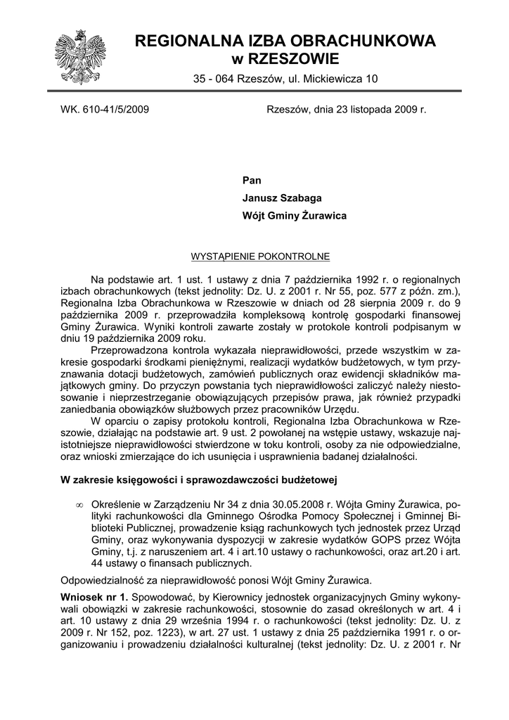REGIONALNA IZBA OBRACHUNKOWA w RZESZOWIE 35 - 064 Rzeszów, ul. Mickiewicza 10 WK. 610-41/5/2009 Rzeszów, dnia 23 listopada 2009 r. Pan Janusz Szabaga Wójt Gminy Żurawica WYSTĄPIENIE POKONTROLNE Na podstawie art. 1 ust. 1 ustawy z dnia 7 października 1992 r. o regionalnych izbach obrachunkowych (tekst jednolity: Dz. U. z 2001 r. Nr 55, poz. 577 z późn. zm.), Regionalna Izba Obrachunkowa w Rzeszowie w dniach od 28 sierpnia 2009 r. do 9 października 2009 r. przeprowadziła kompleksową kontrolę gospodarki finansowej Gminy Żurawica. Wyniki kontroli zawarte zostały w protokole kontroli podpisanym w dniu 19 października 2009 roku. Przeprowadzona kontrola wykazała nieprawidłowości, przede wszystkim w zakresie gospodarki środkami pieniężnymi, realizacji wydatków budżetowych, w tym przyznawania dotacji budżetowych, zamówień publicznych oraz ewidencji składników majątkowych gminy. Do przyczyn powstania tych nieprawidłowości zaliczyć należy niestosowanie i nieprzestrzeganie obowiązujących przepisów prawa, jak również przypadki zaniedbania obowiązków służbowych przez pracowników Urzędu. W oparciu o zapisy protokołu kontroli, Regionalna Izba Obrachunkowa w Rzeszowie, działając na podstawie art. 9 ust. 2 powołanej na wstępie ustawy, wskazuje najistotniejsze nieprawidłowości stwierdzone w toku kontroli, osoby za nie odpowiedzialne, oraz wnioski zmierzające do ich usunięcia i usprawnienia badanej działalności. W zakresie księgowości i sprawozdawczości budżetowej • Określenie w Zarządzeniu Nr 34 z dnia 30.05.2008 r. Wójta Gminy Żurawica, polityki rachunkowości dla Gminnego Ośrodka Pomocy Społecznej i Gminnej Biblioteki Publicznej, prowadzenie ksiąg rachunkowych tych jednostek przez Urząd Gminy, oraz wykonywania dyspozycji w zakresie wydatków GOPS przez Wójta Gminy, t.j. z naruszeniem art. 4 i art.10 ustawy o rachunkowości, oraz art.20 i art. 44 ustawy o finansach publicznych. Odpowiedzialność za nieprawidłowość ponosi Wójt Gminy Żurawica. Wniosek nr 1. Spowodować, by Kierownicy jednostek organizacyjnych Gminy wykonywali obowiązki w zakresie rachunkowości, stosownie do zasad określonych w art. 4 i art. 10 ustawy z dnia 29 września 1994 r. o rachunkowości (tekst jednolity: Dz. U. z 2009 r. Nr 152, poz. 1223), w art. 27 ust. 1 ustawy z dnia 25 października 1991 r. o organizowaniu i prowadzeniu działalności kulturalnej (tekst jednolity: Dz. U. z 2001 r. Nr 2 13, poz. 123 z późn. zm.), oraz w art. 20 ust. 1, art. 44 i 45 ustawy z dnia 30 czerwca 2005 r. o finansach publicznych (Dz. U. Nr 249, poz. 2104 z późn. zm.). • Niezamieszczanie oznaczenia numerowego na dowodach księgowych stanowiących podstawę zapisów w księgach rachunkowych. Odpowiedzialność za nieprawidłowość ponoszą Inspektor ds. prowadzenia ewidencji księgowej budżetu gminy, oraz Inspektor ds. prowadzenia ewidencji księgowej jednostek budżetowych UG Żurawica. Wniosek nr 2. Na dowodach księgowych zamieszczać numer pozycji księgowej, pod którą zostały zakwalifikowane do ujęcia w księgach rachunkowych, stosownie do przepisów art. 21 ust. 1 pkt. 6 ustawy o rachunkowości. W zakresie gospodarki środkami pieniężnymi i rozrachunków • Niedokonywanie protokolarnego przyjęcia i przekazania stanu kasy Urzędu w sytuacji zmiany na stanowisku kasjera. Odpowiedzialność za nieprawidłowości ponoszą Inspektor ds. kasowych UG Żurawica, oraz Inspektor wyznaczony do zastępstwa na stanowisku Kasjera. Wniosek nr 3. Przyjęcie i przekazanie stanu kasy Urzędu dokumentować stosownym protokołem, zgodnie z § 5 pkt 3 „Instrukcji gospodarki kasowej w Urzędzie Gminy Żurawica”, wprowadzonej zarządzeniem Nr 49/2007 Wójta Gminy Żurawica z dnia 22 czerwca 2007 roku. • Nieprawidłowości dotyczące sporządzania raportów kasowych w kasie urzędu, w szczególności polegające na: - nieujmowaniu w raportach kasowych poszczególnych dokumentów źródłowych na podstawie których kasjer dokonuje wypłaty, lecz dokumentów KW wg poszczególnych tytułów tak, iż liczba pozycji KW w raporcie kasowym nie odpowiada liczbie dokumentów źródłowych załączonych do raportu kasowego, - nieoznaczaniu dokumentów na podstawie, których dokonywana jest wypłata z kasy, numerem i pozycją raportu kasowego pod którą zostały ujęte w raporcie kasowym, - niedokumentowaniu dowodem KP pobrania gotówki z banku i przyjęcia jej do raportu kasowego, - braku w raportach kasowych dotyczących podatków – dokumentów źródłowych (K-103) na postawie, których wpłata została zaewidencjonowana w raporcie (udokumentowanie stanowi zbiorczy dowód KP na ogólną kwotę, pomimo iż w raportach pod poszczególnymi pozycjami ujmowane są pojedyncze wpłaty). Odpowiedzialność za nieprawidłowość ponosi Inspektor ds. obsługi kasowej UG Żurawica, oraz z tytułu nadzoru Wójt Gminy Żurawica. Wniosek nr 4. Ewidencję dowodów księgowych w raportach kasowych prowadzić zgodnie z zasadami ustalonymi przez Wójta Gminy Żurawica w § 4 Dokumentacja obrotu kasowego „Instrukcji gospodarki kasowej”, stanowiącej załącznik do zarządzenia Nr 49/2007 Wójta Gminy Żurawica z dnia 22 czerwca 2007 r. w sprawie Instrukcji gospodarki kasowej w Urzędzie Gminy Żurawica. • W postępowaniu o zamówienie publiczne na prowadzenie rachunków bankowych Urzędu Gminy Żurawica i przeprowadzanie rozliczeń pieniężnych, nieprze- 3 strzeganie przepisów wewnętrznych zawartych w zarządzeniu Wójta Gminy w sprawie ramowych procedur udzielania zamówień publicznych o wartości szacunkowej nieprzekraczającej równowartości kwoty 14.000 euro, a w szczególności: - brak wniosku o realizację zamówienia o wartości powyżej 3.000 euro, - niesporządzenie dokumentacji z przeprowadzenia rozpoznania cenowego wraz z uzasadnieniem, stanowiącego podstawę do udzielenia zamówienia o wartości powyżej 3.000 euro. Odpowiedzialność za nieprawidłowość ponosi Inspektor 