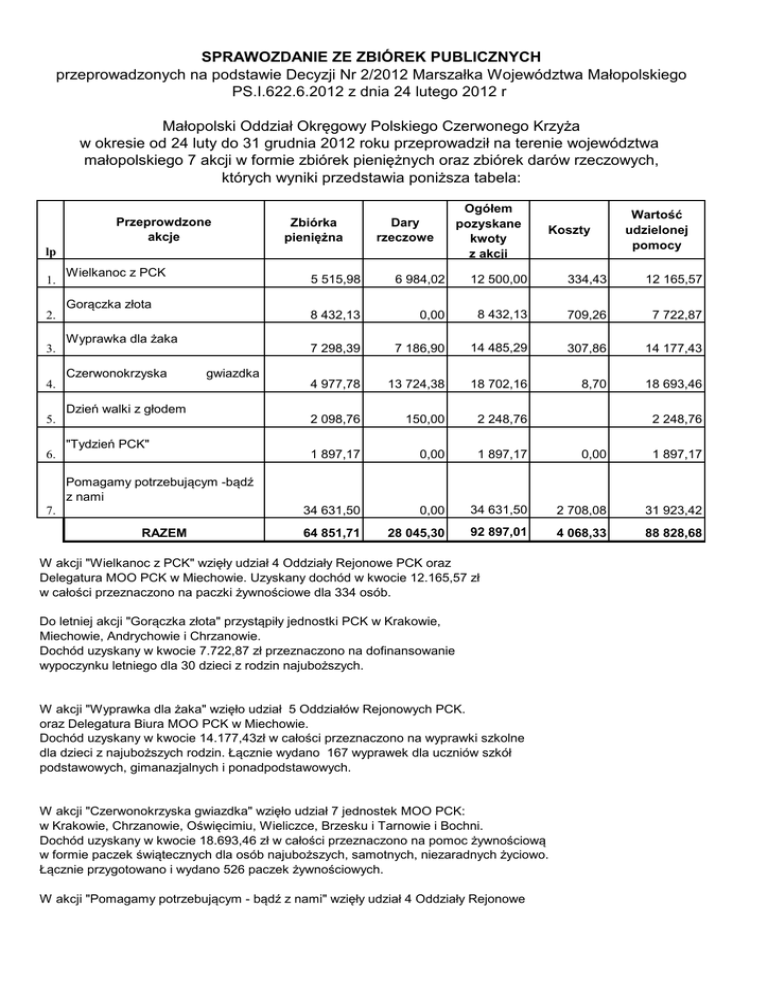 SPRAWOZDANIE ZE ZBIÓREK PUBLICZNYCH przeprowadzonych na podstawie Decyzji Nr 2/2012 Marszałka Województwa Małopolskiego PS.I.622.6.2012 z dnia 24 lutego 2012 r Małopolski Oddział Okręgowy Polskiego Czerwonego Krzyża w okresie od 24 luty do 31 grudnia 2012 roku przeprowadził na terenie województwa małopolskiego 7 akcji w formie zbiórek pieniężnych oraz zbiórek darów rzeczowych, których wyniki przedstawia poniższa tabela: Przeprowdzone akcje Zbiórka pieniężna Dary rzeczowe lp 1. Wielkanoc z PCK Gorączka złota 2. 3. Wyprawka dla żaka Czerwonokrzyska Dzień walki z głodem 5. "Tydzień PCK" 6. Koszty Wartość udzielonej pomocy 5 515,98 6 984,02 12 500,00 334,43 12 165,57 8 432,13 0,00 8 432,13 709,26 7 722,87 7 298,39 7 186,90 14 485,29 307,86 14 177,43 4 977,78 13 724,38 18 702,16 8,70 18 693,46 2 098,76 150,00 2 248,76 1 897,17 0,00 1 897,17 0,00 1 897,17 34 631,50 0,00 34 631,50 2 708,08 31 923,42 64 851,71 28 045,30 92 897,01 4 068,33 88 828,68 gwiazdka 4. Ogółem pozyskane kwoty z akcji 2 248,76 Pomagamy potrzebującym -bądź z nami 7. RAZEM W akcji "Wielkanoc z PCK" wzięły udział 4 Oddziały Rejonowe PCK oraz Delegatura MOO PCK w Miechowie. Uzyskany dochód w kwocie 12.165,57 zł w całości przeznaczono na paczki żywnościowe dla 334 osób. Do letniej akcji "Gorączka złota" przystąpiły jednostki PCK w Krakowie, Miechowie, Andrychowie i Chrzanowie. Dochód uzyskany w kwocie 7.722,87 zł przeznaczono na dofinansowanie wypoczynku letniego dla 30 dzieci z rodzin najuboższych. W akcji "Wyprawka dla żaka" wzięło udział 5 Oddziałów Rejonowych PCK. oraz Delegatura Biura MOO PCK w Miechowie. Dochód uzyskany w kwocie 14.177,43zł w całości przeznaczono na wyprawki szkolne dla dzieci z najuboższych rodzin. Łącznie wydano 167 wyprawek dla uczniów szkół podstawowych, gimanazjalnych i ponadpodstawowych. W akcji "Czerwonokrzyska gwiazdka" wzięło udział 7 jednostek MOO PCK: w Krakowie, Chrzanowie, Oświęcimiu, Wieliczce, Brzesku i Tarnowie i Bochni. Dochód uzyskany w kwocie 18.693,46 zł w całości przeznaczono na pomoc żywnościową w formie paczek świątecznych dla osób najuboższych, samotnych, niezaradnych życiowo. Łącznie przygotowano i wydano 526 paczek żywnościowych. W akcji "Pomagamy potrzebującym - bądź z nami" wzięły udział 4 Oddziały Rejonowe oraz Biuro MOO PCK w Krakowie. Uzyskany dochód o łącznej wartości 31.923,42 zł przeznaczono na paczki żywnościowe dla 392 rodzin, częściowe dofinansowanie do wypoczynku letniego dla 26 dzieci oraz udzielenie zapomóg finansowych dla 18 osób indywidulanych w tym 3 ciężko chorych dzieci. W akcji Dzień walki z głodem udział wzięły 2 Oddziały Rejonowe. Z uzyskanego dochodu w kwocie 2.248,76 zł przygotowano paczki żywnościowe dla 26 rodzin. W akcji "Tydzień PCK" uczestniczyło Biuro MOO w Krakowie oraz jego Delegatura w Miechowie. Uzyskany dochód w wysokości 1.897,17 pozwolił na zorganizowanie warsztatów edukacyjnych dla dzieci w majowym Tygodniu PCK oraz Okręgowy etap Olimpiady zdrowego stylu życia i Mistrzostw Pierwszej Pomocy. Wykaz kosztów rzeczowych jakie zostały poniesione przy organizowaniu poszczególnych akcji przedstawia poniższa tabela: lp Przeprowdzone akcje Druk materiałów informacyjnych Koszty biurowo administracyjne Transport Łącznie poniesione koszty Ogółem pozyskane kwoty z akcji Udział % kosztów w stosunku do zebranej kwoty 1. Gorączka złota 0,00 709,26 0,00 709,26 8 432,13 8,41 2. Wyprawka dla żaka 0,00 307,86 0,00 307,86 7 298,39 4,22 0,00 234,13 100,30 334,43 5 515,98 6,06 0,00 8,70 0,00 8,70 4 977,78 0,17 3. 4. Wielkanoc z PCK Czerwonokrzyska gwiazdka 5. Dzień walki z głodem 0,00 0,00 0,00 0,00 2 098,76 0,00 6. Pomagamy potrzebującym - bądź z nami 0,00 2 499,96 208,12 2 708,08 34 631,50 7,82 7. Tydzień PCK 0,00 0,00 0,00 0,00 1 897,17 0,00 RAZEM 0,00 3 759,91 308,42 4 068,33 64 851,71 6,27 Koszty biurowo - administracyjne: opłaty za rachunki telefoniczne, znaczki pocztowe, koperty, materiały biurowe - w kwocie 3.759,91 zł. Koszty transportu związanego ze zbiórkami wyniosły 308,42 Ogółem na przeprowadzenie akcji zostały poniesione koszty w wysokości 4.068,33 zł, co stanowi 6,27 % udziału kosztów w stosunku do zebranej kwoty zbiórek pieniężnych.