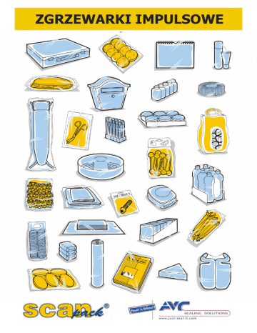 ZGRZEWARKI IMPULSOWE A AVC Sealing Solutions jest firmą z długoletnim doświadczeniem w konstruowaniu i produkcji różnego typu i wielkości zgrzewarek impulsowych do folii. Wyznaczyliśmy sobie prosty cel: chcemy być najlepsi w naszej branży. I możemy powiedzieć, że od dawna jesteśmy na najlepszej drodze do jego zrealizowania. Jest bowiem faktem, że produkujemy zgrzewarki o najwyższej jakości. Nasi technicy konstruują je opierając się nie tylko na olbrzymiej wiedzy, ale przede wszystkim na swoim długoletnim doświadczeniu. Nieustanne dopasowywanie się do indywidualnych potrzeb klientów sprzyja powstawaniu nowych rozwiązań. Zgrzewarki montowane są osobiście przez nasz fachowy personel, dzięki czemu możemy zagwarantować solidny produkt końcowy. Nie znajdą Państwo u nas typowej produkcji taśmowej. Wszystko robimy z zamiłowania do wykonywanej pracy. Dotyczy to nie tylko skomplikowanych maszyn przemysłowych, lecz również prostszych konstrukcji, znajdujących zastosowanie na przykład w kuchni małej restauracji lub sklepie. Nasze urządzenia są niezawodne. A rozumiejąc oczekiwania naszych klientów, produkujemy zgrzewarki zaskakująco łatwe w obsłudze. I co najistotniejsze: oferujemy je po bardzo korzystnych cenach. Jeżeli będą Państwo potrzebować dokładniejszych informacji o proponowanych przez nas rozwiązaniach, łącznie z kompletnymi liniami pakującymi - niezbędne materiały prześlemy pocztą lub e-mailem. Zapraszamy również na nasze strony internetowe: www.scanpack-poznan.pl | www.wiazarki.pl | www.worki-sztauerskie.pl | www.samoprzylepka.pl ZGRZEWARKI STOŁOWE – TS, TMS Impulsowe zgrzewarki stołowe AVC Sealing Solutions to proste w stosowaniu, przyjazne dla użytkownika urządzenia, idealnie nadające się do profesjonalnego opakowywania Państwa produktów w folię. Gwarantują zawsze niezawodny rezultat. Zgrzewarki stołowe można opcjonalnie wyposażyć w stolik roboczy oraz łożyskowane rolki odwijające, zwiększające funkcjonalność i komfort pracy. Wszystkie zgrzewarki stołowe AVC nadają się do zgrzewania folii PE/PP do 2x150 mikronów. Zobacz filmy (wymagany dostęp do internetu): Zgrzewarka EP(TS) | Zgrzewarka EMP | Zgrzewarka TMS TS-200/TS-300/TS-400/TS-500 Zgrzewarki stołowe wyposażone w element zgrzewający o szerokości 2mm, regulator czasu trwania impulsu zgrzewającego oraz diodę informującą o wykonywanym zgrzewie. Zgrzewarki nie posiadają noża odcinającego folię. Odpowiednie do zgrzewania gotowych woreczków foliowych. TS-200-C/TS-300-C/TS-400-C/TS-500 Zgrzewarki zamiast płaskiego elementu grzejnego posiadają drut teflonowany, który jednocześnie odcina i zamyka folię. TS-210/TS-310/TS-410/TS-510 Zgrzewarki stołowe wyposażone w element zgrzewający o szerokości 2mm, regulator czasu trwania impulsu zgrzewającego oraz diodę informującą o wykonywanym zgrzewie. Zgrzewarki zaopatrzone są w nóż odcinający folię – przydatny do produkcji woreczków foliowych. TMS-200/TMS-300/TMS-400/TMS-500 Zgrzewarki o podobnych parametrach jak TS. Dodatkowo wyposażone w docisk elektromagnetyczny, który samoczynnie przytrzymuje ramię podczas wykonywania zgrzewu i w czasie chłodzenia zgrzeiny. Ramię zostaje automatycznie podniesione po zakończeniu cyklu zgrzewania. TMS-x10 – dodatkowo wyposażone w nóż odcinający TMS-x00-C – teflonowany drut odcinający zamiast płaskiego elementu zgrzewającego. RVS-TS Wersje zgrzewarek stołowych w wykonaniu ze stali nierdzewnej. Przeznaczone do stosowania przy produkcji żywności (np. wyroby mięsne) oraz w handlu artykułami spożywczymi. Każdy typ zgrzewarki może zostać wykonany w wersji nierdzewnej. Akcesoria dodatkowe dostępne do wszystkich wersji zgrzewarek stołowych: - stoliki robocze - WT - rolki odwijające do folii - AR ZGRZEWARKI ELEKTROMAGNETYCZNE – SMS Te wysokiej jakości impulsowe zgrzewarki przemysłowe, wraz z różnorodnymi akcesoriami, mogą okazać się idealnym rozwiązaniem dla Państwa problemów związanych z pakowaniem produktów. Zgrzewarki magnetyczne są niezawodnymi i prostymi w obsłudze urządzeniami. Wyposażone są w niezależne regulatory czasu zgrzewania i chłodzenia. Równomierna siła docisku ramienia zgrzewarki realizowana jest przy pomocy elektromagnesów, zapewniając uzyskanie jednorodnych, powtarzalnej jakości zgrzewów o szerokości 4 (opcja 2mm lub 8mm). Radzą sobie z foliami grubości do 2x250µm (opcja - 2x400µm). Uruchomienie zgrzewarki może odbywać się ręcznie lub (dodatkowe opcje) za pomocą mechanicznego, elektrycznego lub pneumatycznego przycisku nożnego. Ramię zgrzewarki podnosi się samoczynnie po zakończeniu procesu zgrzewania. W wyposażeniu dodatkowym dostępne są obsługi nożne, stoliki robocze, rolki odwijające do folii, oraz podstawy wolnostojące, również takie, które umożliwiają ustawienie zgrzewarki pod różnymi kątami. SMS-350/500/700/1000/1200/1400 Na fot. zgrzewarka ze zgrzewem o długości 480 mm (SMS-500). Za urządzeniem widoczny zespół rolek do odwijania folii (AR). Z przodu zamocowany stolik roboczy (WT). Obydwie części dostępne jako akcesoria dodatkowe. WIELE RÓŻNYCH WERSJI WYKONANIA: SMS-RVS Wersje różniące się od standardowych zgrzewarek wykonaniem ze stali nierdzewnej. Znajdują zastosowanie m.in. w pakowaniu mięsa oraz innych produktów spożywczych. Zobacz filmy (wymagany dostęp do internetu): Zgrzewarka SMS-350 | Zgrzewarka SMS-500EM Zgrzewarka SMS-700 AC-PN | Zgrzewarka SMP-500 SMS-D (double) Wersje wyposażone w dodatkowy górny element grzejny (w ramieniu zgrzewarki). Stosowane do zgrzewania grubych folii (2x400µm), worków z zakładkami oraz trudniej zgrzewalnych materiałów. Możliwość wyłączenia górnego elementu grzejnego. SMS-PN1 lub PN2 Różniąca się od standardowej zgrzewarki pneumatycznym dociskiem ramienia, uruchamianym za pomocą elektrycznego przełącznika nożnego. Wymagane ciśnienie: 6 bar. SMS-EM Wersja wyposażona w e