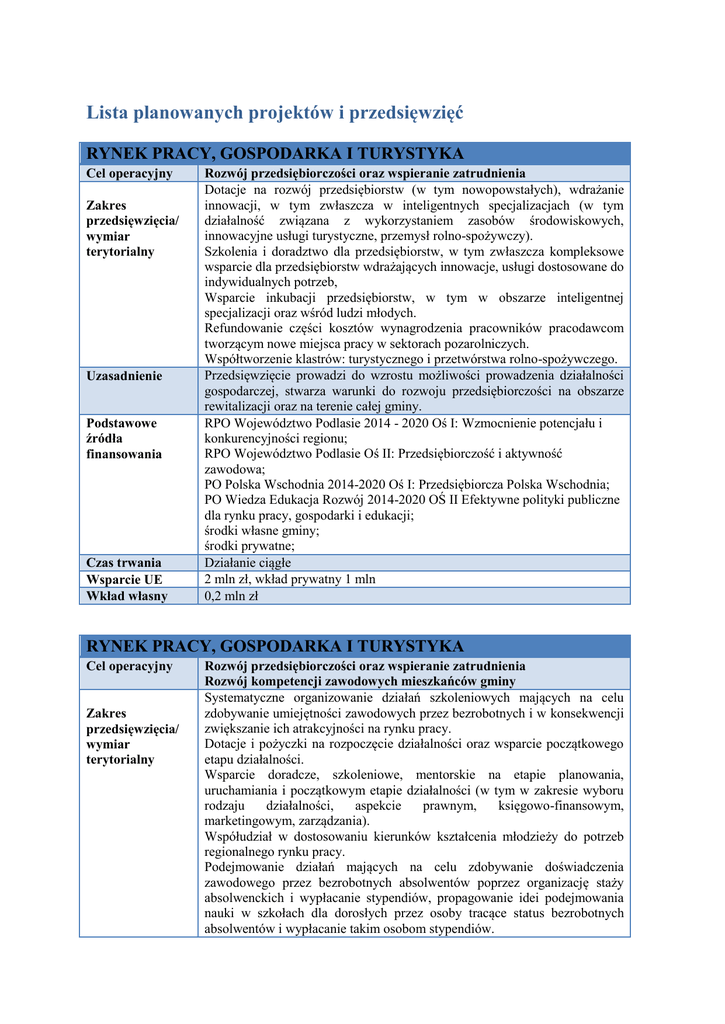 Lista planowanych projektów i przedsięwzięć RYNEK PRACY, GOSPODARKA I TURYSTYKA Cel operacyjny Zakres przedsięwzięcia/ wymiar terytorialny Uzasadnienie Podstawowe źródła finansowania Czas trwania Wsparcie UE Wkład własny Rozwój przedsiębiorczości oraz wspieranie zatrudnienia Dotacje na rozwój przedsiębiorstw (w tym nowopowstałych), wdrażanie innowacji, w tym zwłaszcza w inteligentnych specjalizacjach (w tym działalność związana z wykorzystaniem zasobów środowiskowych, innowacyjne usługi turystyczne, przemysł rolno-spożywczy). Szkolenia i doradztwo dla przedsiębiorstw, w tym zwłaszcza kompleksowe wsparcie dla przedsiębiorstw wdrażających innowacje, usługi dostosowane do indywidualnych potrzeb, Wsparcie inkubacji przedsiębiorstw, w tym w obszarze inteligentnej specjalizacji oraz wśród ludzi młodych. Refundowanie części kosztów wynagrodzenia pracowników pracodawcom tworzącym nowe miejsca pracy w sektorach pozarolniczych. Współtworzenie klastrów: turystycznego i przetwórstwa rolno-spożywczego. Przedsięwzięcie prowadzi do wzrostu możliwości prowadzenia działalności gospodarczej, stwarza warunki do rozwoju przedsiębiorczości na obszarze rewitalizacji oraz na terenie całej gminy. RPO Województwo Podlasie 2014 - 2020 Oś I: Wzmocnienie potencjału i konkurencyjności regionu; RPO Województwo Podlasie Oś II: Przedsiębiorczość i aktywność zawodowa; PO Polska Wschodnia 2014-2020 Oś I: Przedsiębiorcza Polska Wschodnia; PO Wiedza Edukacja Rozwój 2014-2020 OŚ II Efektywne polityki publiczne dla rynku pracy, gospodarki i edukacji; środki własne gminy; środki prywatne; Działanie ciągłe 2 mln zł, wkład prywatny 1 mln 0,2 mln zł RYNEK PRACY, GOSPODARKA I TURYSTYKA Cel operacyjny Zakres przedsięwzięcia/ wymiar terytorialny Rozwój przedsiębiorczości oraz wspieranie zatrudnienia Rozwój kompetencji zawodowych mieszkańców gminy Systematyczne organizowanie działań szkoleniowych mających na celu zdobywanie umiejętności zawodowych przez bezrobotnych i w konsekwencji zwiększanie ich atrakcyjności na rynku pracy. Dotacje i pożyczki na rozpoczęcie działalności oraz wsparcie początkowego etapu działalności. Wsparcie doradcze, szkoleniowe, mentorskie na etapie planowania, uruchamiania i początkowym etapie działalności (w tym w zakresie wyboru rodzaju działalności, aspekcie prawnym, księgowo-finansowym, marketingowym, zarządzania). Współudział w dostosowaniu kierunków kształcenia młodzieży do potrzeb regionalnego rynku pracy. Podejmowanie działań mających na celu zdobywanie doświadczenia zawodowego przez bezrobotnych absolwentów poprzez organizację staży absolwenckich i wypłacanie stypendiów, propagowanie idei podejmowania nauki w szkołach dla dorosłych przez osoby tracące status bezrobotnych absolwentów i wypłacanie takim osobom stypendiów. Uzasadnienie Podstawowe źródła finansowania Czas trwania Wsparcie UE Wkład własny Rozwój poradnictwa i doradztwa zawodowego. Przedsięwzięcie prowadzi do wzrostu możliwości uzyskania pracy, stwarza warunki do rozwoju przedsiębiorczości na obszarze rewitalizacji oraz na terenie całej gminy. RPO Województwo Podlasie 2014 - 2020 Oś I: Wzmocnienie potencjału i konkurencyjności regionu; RPO Województwo Podlasie 2014 - 2020 Oś II: Przedsiębiorczość i aktywność zawodowa; PO Wiedza Edukacja Rozwój 2014-2020 OŚ I: Osoby młode na rynku pracy; PO Wiedza Edukacja Rozwój 2014-2020 OŚ II Efektywne polityki publiczne dla rynku pracy, gospodarki i edukacji; środki własne gminy; środki prywatne; Działanie ciągłe 2 mln zł, wkład prywatny 1 mln zł 0,2 mln zł RYNEK PRACY, GOSPODARKA I TURYSTYKA Cel operacyjny Wzrost atrakcyjności inwestycyjnej gminy Zakres przedsięwzięcia, wymiar terytorialny Budowa i rozbudowa infrastruktury na terenach przeznaczonych pod inwestycje, modernizacja istniejącej zdegradowanej infrastruktury i przestrzeni na cele gospodarcze (sieć wod-kan., energia, drogi, inne). Wykup terenów inwestycyjnych od prywatnych właścicieli i kształtowanie polityki wykupu i dzierżawy terenów od prywatnych właścicieli. Rozwój systemu obsługi inwestycji. Przedsięwzięcie prowadzi do wzrostu możliwości prowadzenia działalności gospodarczej, stwarza warunki do rozwoju przedsiębiorczości, wzmocnią i ułatwia dostępu inwestorów do nowych terenów inwestycyjnych na obszarze rewitalizacji oraz na terenie całej gminy. Uzasadnienie Podstawowe źródła finansowania Czas trwania Wsparcie UE Wkład własny RPO Województwo Podlasie Oś I: Wzmocnienie potencjału i konkurencyjności regionu; środki własne gminy; środki prywatne; kapitał zagraniczny; Działanie ciągłe 10 mln zł 2 mln zł RYNEK PRACY, GOSPODARKA I TURYSTYKA Cel operacyjny Rozwój oferty turystycznej Zakres przedsięwzięcia, wymiar terytorialny Uporządkowanie istniejących, wyznaczenie i zbudowanie nowych szlaków turystycznych: rowerowych, pieszych, konnych, wraz z infrastrukturą towarzyszącą (punkty widokowe, zajazdy, miejsca na ogniska, ścieżki edukacyjne itp.). Wsparcie rozwoju stałej bazy gastronomicznej (ulgi podatkowe, pozyskanie inwestora, pomoc administracyjna) oraz mobilnych punktów gastronomicznych i usług cateringowych. Wspieranie rozwoju branży usługowej, działającej na rzecz odwiedzających i mieszkańców gminy. Rozwój i integracja wielosezonowych tras rekreacyjnych wewnątrz gminy, a także z terenami sąsiednimi. Współpraca z sąsiednimi jednostkami samorządu terytorialnego w zakresie kreowania oferty czasu wolnego, w tym m.in. tworzenie wspólnego kalendarza imprez, organizacja imprez o charakterze ponadlokalnym, bazujących na tradycji i specyfice gminy. Porządkowanie i zagospodarowywanie terenów zielonych. Zagospodarowanie rekreacyjne i turystyczne obszarów na terenie gminy. Promocja turystyczna w oparciu o walory przyrodniczo-kulturowe gminy. Wsparcie dla rozwoju gospodarstw agroturystycznych na terenie gmi