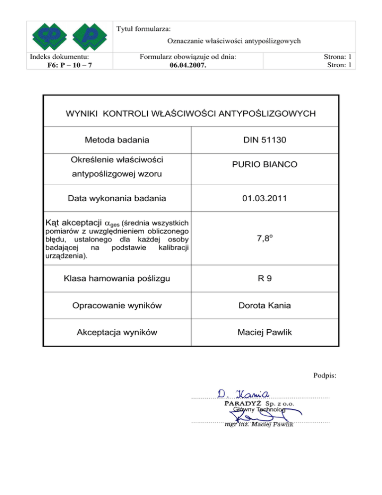 Tytuł formularza: Oznaczanie właściwości antypoślizgowych Indeks dokumentu: F6: P – 10 – 7 Formularz obowiązuje od dnia: 06.04.2007. Strona: 1 Stron: 1 WYNIKI KONTROLI WŁAŚCIWOŚCI ANTYPOŚLIZGOWYCH Metoda badania Określenie właściwości DIN 51130 PURIO BIANCO antypoślizgowej wzoru Data wykonania badania 01.03.2011 Kąt akceptacji αges (średnia wszystkich pomiarów z uwzględnieniem obliczonego błędu, ustalonego dla kaŜdej osoby badającej na podstawie kalibracji urządzenia). 7,8o Klasa hamowania poślizgu R9 Opracowanie wyników Dorota Kania Akceptacja wyników Maciej Pawlik Podpis: