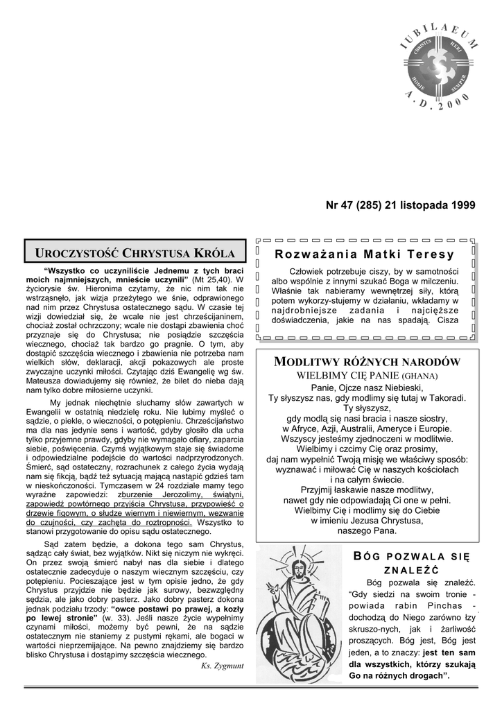 NR 47 (285)/1 21 listopada 1999 r. PO GÓRACH, DOLINACH... Nr 47 (285) 21 listopada 1999 UROCZYSTOŚĆ CHRYSTUSA KRÓLA RozwaŜania Matki Teresy “Wszystko co uczyniliście Jednemu z tych braci moich najmniejszych, mnieście uczynili” (Mt 25,40). W Ŝyciorysie św. Hieronima czytamy, Ŝe nic nim tak nie wstrząsnęło, jak wizja przeŜytego we śnie, odprawionego nad nim przez Chrystusa ostatecznego sądu. W czasie tej wizji dowiedział się, Ŝe wcale nie jest chrześcijaninem, chociaŜ został ochrzczony; wcale nie dostąpi zbawienia choć przyznaje się do Chrystusa; nie posiądzie szczęścia wiecznego, chociaŜ tak bardzo go pragnie. O tym, aby dostąpić szczęścia wiecznego i zbawienia nie potrzeba nam wielkich słów, deklaracji, akcji pokazowych ale proste zwyczajne uczynki miłości. Czytając dziś Ewangelię wg św. Mateusza dowiadujemy się równieŜ, Ŝe bilet do nieba dają nam tylko dobre miłosierne uczynki. Człowiek potrzebuje ciszy, by w samotności albo wspólnie z innymi szukać Boga w milczeniu. Właśnie tak nabieramy wewnętrzej siły, którą potem wykorzy-stujemy w działaniu, wkładamy w naj dr ob n iej s ze za d a ni a i n aj c i ę Ŝs ze doświadczenia, jakie na nas spadają. Cisza My jednak niechętnie słuchamy słów zawartych w Ewangelii w ostatnią niedzielę roku. Nie lubimy myśleć o sądzie, o piekle, o wieczności, o potępieniu. Chrześcijaństwo ma dla nas jedynie sens i wartość, gdyby głosiło dla ucha tylko przyjemne prawdy, gdyby nie wymagało ofiary, zaparcia siebie, poświęcenia. Czymś wyjątkowym staje się świadome i odpowiedzialne podejście do wartości nadprzyrodzonych. Śmierć, sąd ostateczny, rozrachunek z całego Ŝycia wydają nam się fikcją, bądź teŜ sytuacją mającą nastąpić gdzieś tam w nieskończoności. Tymczasem w 24 rozdziale mamy tego wyraźne zapowiedzi: zburzenie Jerozolimy, świątyni, zapowiedź powtórnego przyjścia Chrystusa, przypowieść o drzewie figowym, o słudze wiernym i niewiernym, wezwanie do czujności, czy zachęta do roztropności. Wszystko to stanowi przygotowanie do opisu sądu ostatecznego. Sąd zatem będzie, a dokona tego sam Chrystus, sądząc cały świat, bez wyjątków. Nikt się niczym nie wykręci. On przez swoją śmierć nabył nas dla siebie i dlatego ostatecznie zadecyduje o naszym wiecznym szczęściu, czy potępieniu. Pocieszające jest w tym opisie jedno, Ŝe gdy Chrystus przyjdzie nie będzie jak surowy, bezwzględny sędzia, ale jako dobry pasterz. Jako dobry pasterz dokona jednak podziału trzody: “owce postawi po prawej, a kozły po lewej stronie” (w. 33). Jeśli nasze Ŝycie wypełnimy czynami miłości, moŜemy być pewni, Ŝe na sądzie ostatecznym nie staniemy z pustymi rękami, ale bogaci w wartości nieprzemijające. Na pewno znajdziemy się bardzo blisko Chrystusa i dostąpimy szczęścia wiecznego. Ks. Zygmunt MODLITWY RÓśNYCH NARODÓW WIELBIMY CIĘ PANIE (GHANA) Panie, Ojcze nasz Niebieski, Ty słyszysz nas, gdy modlimy się tutaj w Takoradi. Ty słyszysz, gdy modlą się nasi bracia i nasze siostry, w Afryce, Azji, Australii, Ameryce i Europie. Wszyscy jesteśmy zjednoczeni w modlitwie. Wielbimy i czcimy Cię oraz prosimy, daj nam wypełnić Twoją misję we właściwy sposób: wyznawać i miłować Cię w naszych kościołach i na całym świecie. Przyjmij łaskawie nasze modlitwy, nawet gdy nie odpowiadają Ci one w pełni. Wielbimy Cię i modlimy się do Ciebie w imieniu Jezusa Chrystusa, naszego Pana. BÓG POZW AL A SIĘ ZN ALEŹĆ Bóg pozwala się znaleźć. “Gdy siedzi na swoim tronie powiada r abin Pinc has dochodzą do Niego zarówno łzy skruszo-nych, jak i Ŝarliwość proszących. Bóg jest, Bóg jest jeden, a to znaczy: jest ten sam dla wszystkich, którzy szukają Go na róŜnych drogach”. NR 47 (285)/2 21 listopada 1999 r. PO GÓRACH, DOLINACH... ROK 2000 - Przed rokiem w parafii “DO WSZYSTKICH, KTÓRZY PRZYGOTOWUJĄ SIĘ DO 14 listopada odbyło się Sympozjum Naukowe zatytułowane “Świadek prawdy i nauczyciel jedności. Aktualność dziedzictwa myśli św. Klemensa Rzymskiego w kontekście przemian współczesnej kultury”. Sympozjum to i uroczystość odpustowa stały się zwieńczeniem obchodów Roku ŚWIĘTOWANIA W WIERZE WIELKIEGO JUBILEUSZU CHRZEŚCIJAŃSTWA.” Rok Wielkiego Jubileuszu rozpocznie się w noc BoŜego Narodzenia 1999 roku. Ojciec Święty otworzy Drzwi Bazyliki św. Piotra. Gest ten symbolizuje otwarcie Kościoła na wszystkich, którzy pragną powrotu do jedności z Bogiem, Dawcą wszelkiego pokoju. Do stolicy chrześcijaństwa, a takŜe do Ziemi Świętej, przez cały Roku Jubileuszowy będą przybywać pielgrzymki róŜnych narodowości. Pielgrzymując do tych miejsc człowiek doświadcza potrójnej łaski. Najpierw daru szczególnego przebaczenia i poje-dnania z Bogiem. To pojednanie staje się fundamentem poje-dnania międzyludzkiego. Potem łaski uświęcenia. Wreszcie łaski szczególnego spotkania z Panem ludzkich losów. Dlatego Ojciec Święty zwraca się do wszystkich chrześcijan: “Nie pozostaje mi nic innego jak zaprosić serdecznie całą chrześcijańską wspólnotę, aby w duchu wyruszyła na szlak jubileuszowej pielgrzymki. Będzie ją moŜna odbyć w róznych formach /.../. Z pewnością jednak wielu przeŜyje ją wyruszając naprawdę w drogę do miejsc, które odegrały szczególnie doniosłą rolę w dziejach zbawienia”. Główne obchody rocznicowe w naszej Ojczyźnie przeŜywane będą w Gnieźnie - stolicy pierwszej metropolii, a następnie we wszystkich metropoliach i w wielu diecezjach. Rok Jubileuszowy będący szczególnym “rokiem łaski od Pana” stanowi okazję do doświadczenia nadprzyrodzonych darów Boga. Wymaga jednak podjęcia ze strony człowieka pewnego wysiłku. Co zatem powinniśmy uczynić? Ojciec Święty w liście apostolskim Tertio millennio adveniente przedstawia siedem sugestii. Mianowicie: pogłębienie naszej wiary we wspólnocie z Osobami Trójcy P