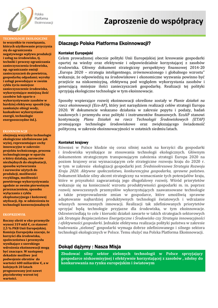 Zaproszenie do współpracy TECHNOLOGIE EKOLOGICZNE to wszystkie te rozwiązania, których użytkowanie przyczynia się do ograniczenia negatywnego wpływu produkcji i usług na środowisko, tj. techniki i procesy ograniczania zanieczyszczenia środowiska, np. ograniczanie emisji zanieczyszczeń do powietrza, gospodarkę odpadami; wyroby i usługi powodujące w swoim cyklu życia mniejsze zanieczyszczenie środowiska, wykorzystujące mniejszą ilość zasobów lub oparte o wykorzystywanie zasobów w bardziej efektywny sposób (np. zamknięte obiegi wody, kaskadowe wykorzystanie energii, technologie energooszczędne itd.). EKOINNOWACJE obejmują wszystkie technologie ekologiczne zdefiniowane jak wyżej, reprezentujące cechy innowacyjne w zakresie: projektu technicznego, procesu technologicznego w oparciu o który działają, surowców niezbędnych do eksploatacji, sposobu wytworzenia i surowców użytych do produkcji, możliwości recyklingu, możliwości powtórnego wykorzystywania zgodnie ze swoim pierwotnym przeznaczeniem, sposobu wyłączania z cyklu eksploatacyjnego i końcowej utylizacji, itp. w odniesieniu to technologii konwencjonalnych EKOPRZEMYSŁ Roczny obrót w eko-przemyśle wynosi 319 mld €, co stanowi 2,5 % PKB Unii Europejskiej. Komisja Europejska szacuje, że korzyści dla środowiska, społeczeństwa i przemysłu wynikające z szerokiego wdrożenia ekoinnowacji mogą być znaczące. W następnej dekadzie możliwe jest podwojenie obrotów do wartości 600 miliardów €, a w kolejnych 20 latach prognozowany jest nawet pięciokrotny wzrost tej wartości. Dlaczego Polska Platforma Ekoinnowacji? Kontekst Europejski Celem prowadzonej obecnie polityki Unii Europejskiej jest kreowanie gospodarki opartej na wiedzy oraz efektywnie i odpowiedzialnie korzystającej z zasobów środowiska. Główny dokument strategiczny perspektywy finansowej 2014-20 „Europa 2020 – strategia inteligentnego, zrównoważonego i globalnego wzrostu” wskazuje, że odpowiedzią na środowiskowe i ekonomiczne wyzwania powinno być przejście na niskoemisyjną, efektywną pod względem wykorzystania zasobów i generującą mniejsze ilości zanieczyszczeń gospodarkę. Realizacji tej polityki sprzyjają ekologiczne technologie w tym ekoinnowacje. Sposoby wspierające rozwój ekoinnowacji określone zostały w Planie działań na rzecz ekoinnowacji (Eco-AP), który jest narzędziem realizacji celów strategii Europa 2020. W dokumencie wskazano działania w zakresie popytu i podaży, badań naukowych i przemysłu oraz polityki i instrumentów finansowych. EcoAP stanowi kontynuację Planu Działań na rzecz Technologii Środowiskowych (ETAP) promującego technologie środowiskowe oraz zwiększającego świadomość polityczną w zakresie ekoinnowacyjności w ostatnich siedmiu latach. Kontekst krajowy Również w Polsce kładzie się coraz silniej nacisk na korzyści dla gospodarki i środowiska wynikające ze stosowania technologii ekologicznych. Głównym dokumentem strategicznym transponującym założenia strategii Europa 2020 na poziom krajowy oraz wyznaczającym cele strategiczne rozwoju kraju do 2020 r. w tym w zakresie ekologizacji gospodarki jest: Średniookresowa Strategia Rozwoju Kraju 2020. Aktywne społeczeństwo, konkurencyjna gospodarka, sprawne państwo. Dokument kładzie silny akcent strategiczny na wzmacnianie tych potencjałów kraju, które w przyszłości zagwarantują jego długofalowy rozwój. Wśród priorytetów wskazuje się na konieczność wzrostu produktywności gospodarki m. in. poprzez rozwój nowoczesnych przemysłów wykorzystujących zaawansowane technologie a także przeprowadzenie zmian w gospodarce, które umożliwią sprawne adaptowanie najbardziej produktywnych technologii światowych i wdrażanie własnych nowoczesnych innowacji. Realizacji tak zdefiniowanych priorytetów sprzyjać będą technologie przyjazne dla środowiska, w tym ekoinnowacje. Odzwierciedlają to cele i kierunki działań zawarte w takich strategiach sektorowych jak Strategia Bezpieczeństwo Energetyczne i Środowisko czy Strategia innowacyjności i efektywności gospodarki. Jednakże efektywna realizacja polityki państwa w zakresie budowania „zielonej” gospodarki wymaga dobrze zdefiniowanego i silnego sektora technologii ekologicznych w Polsce. Temu służyć ma Polska Platforma Ekoinnowacji. Dokąd dążymy : Nasza Misja Zbudować silny sektor zielonych technologii w Polsce sprzyjający gospodarce niskoemisyjnej i efektywnie korzystającej z zasobów , zdolny do konkurowania na rynku europejskim i światowym Co chcemy osiągnąć: Zebrać i skonsolidować wszystkich uczestników procesu innowacji w obszarze ekologicznych technologii (baza danych firm, jednostek naukowych, otoczenie biznesu , jednostki finansujące itp.); Opracować mapę potencjału technologii ekologicznych w Polsce; Zbudować sieć współpracy w oparciu o bezpłatne narzędzia online;, Ułatwić polskim podmiotom dostęp do środków finansowych krajowych , UE i prywatnych w nowej perspektywie finansowej, w tym podejmować działania na rzecz zwiększenia ich udziału w konsorcjach projektów międzynarodowych w ramach Programu UE Horyzont 2020 ; Umożliwić twórcom, dostawcom i odbiorcom technologii nawiązywanie współpracy w postaci łańcucha dostaw zgodnie z ich zapotrzebowaniem i oferowanym potencjałem; Zapewnić przestrzeń dla inicjowania współpracy podmiotów na poziomie: o Mikro: firma-firma, firma-nauka, firma-finanse, itp. (poziom projektu), o Mezo : grupa tematyczna /klaster (poziom inicjatywy technologicznej dedykowanej określonej potrzebie technologicznej), o Makro: platforma – jednostki administracji publicznej ich agendy (poziom strategicznej agendy badań i innowacji), Umożliwić udział i lobbowanie wszystkim zainteresowanym w procesach kreowania polityki ekologicznej i ekoinnowacyjnej w kraju poprzez stworzenie forum konsultacyjnego; Budować świadomość ekoinnowacyjną wśród przedsię