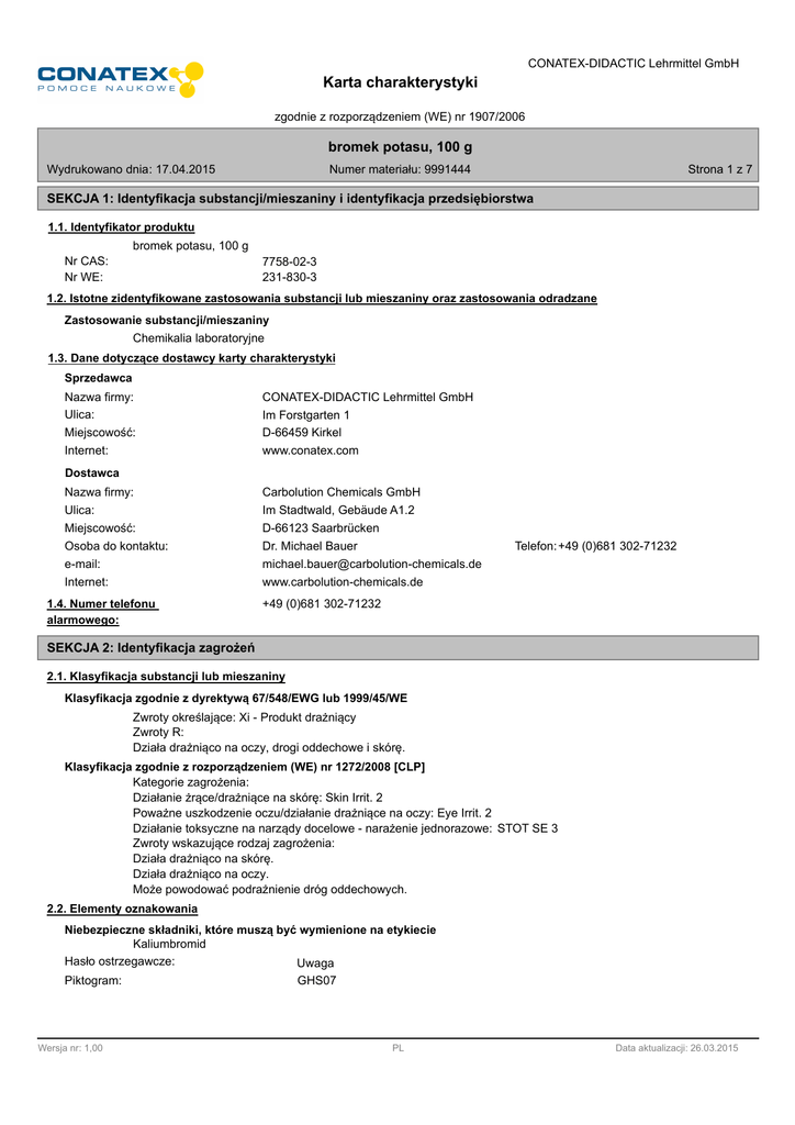 CONATEX-DIDACTIC Lehrmittel GmbH Karta charakterystyki zgodnie z rozporządzeniem (WE) nr 1907/2006 bromek potasu, 100 g Wydrukowano dnia: 17.04.2015 Strona 1 z 7 Numer materiału: 9991444 SEKCJA 1: Identyfikacja substancji/mieszaniny i identyfikacja przedsiębiorstwa 1.1. Identyfikator produktu bromek potasu, 100 g Nr CAS: Nr WE: 7758-02-3 231-830-3 1.2. Istotne zidentyfikowane zastosowania substancji lub mieszaniny oraz zastosowania odradzane Zastosowanie substancji/mieszaniny Chemikalia laboratoryjne 1.3. Dane dotyczące dostawcy karty charakterystyki Sprzedawca Nazwa firmy: Ulica: Miejscowość: Internet: CONATEX-DIDACTIC Lehrmittel GmbH Im Forstgarten 1 D-66459 Kirkel www.conatex.com Dostawca Nazwa firmy: Ulica: Carbolution Chemicals GmbH Im Stadtwald, Gebäude A1.2 Miejscowość: D-66123 Saarbrücken Osoba do kontaktu: Dr. Michael Bauer e-mail: [email protected] Internet: www.carbolution-chemicals.de 1.4. Numer telefonu alarmowego: Telefon: +49 (0)681 302-71232 +49 (0)681 302-71232 SEKCJA 2: Identyfikacja zagrożeń 2.1. Klasyfikacja substancji lub mieszaniny Klasyfikacja zgodnie z dyrektywą 67/548/EWG lub 1999/45/WE Zwroty określające: Xi - Produkt drażniący Zwroty R: Działa drażniąco na oczy, drogi oddechowe i skórę. Klasyfikacja zgodnie z rozporządzeniem (WE) nr 1272/2008 [CLP] Kategorie zagrożenia: Działanie żrące/drażniące na skórę: Skin Irrit. 2 Poważne uszkodzenie oczu/działanie drażniące na oczy: Eye Irrit. 2 Działanie toksyczne na narządy docelowe - narażenie jednorazowe: STOT SE 3 Zwroty wskazujące rodzaj zagrożenia: Działa drażniąco na skórę. Działa drażniąco na oczy. Może powodować podrażnienie dróg oddechowych. 2.2. Elementy oznakowania Niebezpieczne składniki, które muszą być wymienione na etykiecie Kaliumbromid Hasło ostrzegawcze: Piktogram: Wersja nr: 1,00 Uwaga GHS07 PL Data aktualizacji: 26.03.2015 CONATEX-DIDACTIC Lehrmittel GmbH Karta charakterystyki zgodnie z rozporządzeniem (WE) nr 1907/2006 bromek potasu, 100 g Wydrukowano dnia: 17.04.2015 Strona 2 z 7 Numer materiału: 9991444 Zwroty wskazujące rodzaj zagrożenia H315 Działa drażniąco na skórę. H319 Działa drażniąco na oczy. H335 Może powodować podrażnienie dróg oddechowych. Zwroty wskazujące środki ostrożności P280 Stosować rękawice ochronne/odzież ochronną/ochronę oczu/ochronę twarzy. P305+P351+P338 W PRZYPADKU DOSTANIA SIĘ DO OCZU: Ostrożnie płukać wodą przez kilka minut. Wyjąć soczewki kontaktowe, jeżeli są i można je łatwo usunąć. Nadal płukać. SEKCJA 3: Skład/informacja o składnikach 3.1. Substancje Wzór chemiczny: BrK Masa cząsteczkowa: 119,00 Składniki niebezpieczne Nr WE Nr CAS Nazwa chemiczna Ilość Nr Index Klasyfikacja zgodnie z 67/548/EWG Klasyfikacja zgodnie z rozporządzeniem (WE) nr 1272/2008 [CLP] 231-830-3 Kaliumbromid 7758-02-3 Xi - Produkt drażniący R36/37/38 100 % Skin Irrit. 2, Eye Irrit. 2, STOT SE 3; H315 H319 H335 Wydźwięk zdań R-, H- i EUH: patrz sekcja 16. SEKCJA 4: Środki pierwszej pomocy 4.1. Opis środków pierwszej pomocy Wskazówki ogólne W przypadku awarii lub jezeli zle sie poczujesz, niezwlocznie zasiegnij porady lekarza - jezeli to mozliwe, pokaz etykiete. W przypadku wdychania Należy zadbać o należytą wentylację. Konieczna opieka lekarska. W przypadku kontaktu ze skórą W PRZYPADKU KONTATKU ZE SKÓRĄ (lub z włosami): Natychmiast zdjąć całą zanieczyszczoną odzież. Spłukać skórę pod strumieniem wody/prysznicem. W przypadku wystąpienia podrażnienia skóry: Zasięgnąć porady/zgłosić się pod opiekę lekarza. W przypadku kontaktu z oczami Jeśli produkt dostanie się do oczu, należy natychmiast wypłukiwać go z pod powiek obficie wodą przez około 5. minut. Następnie skonsultować się z okulistą. W przypadku połknięcia Natychmiast przepłukać jamę ustną i obficie popić wodą. 4.3. Wskazania dotyczące wszelkiej natychmiastowej pomocy lekarskiej i szczególnego postępowania z poszkodowanym Brak danych Wersja nr: 1,00 PL Data aktualizacji: 26.03.2015 CONATEX-DIDACTIC Lehrmittel GmbH Karta charakterystyki zgodnie z rozporządzeniem (WE) nr 1907/2006 bromek potasu, 100 g Wydrukowano dnia: 17.04.2015 Strona 3 z 7 Numer materiału: 9991444 SEKCJA 5: Postępowanie w przypadku pożaru 5.1. Środki gaśnicze Odpowiednie środki gaśnicze Środki gaśnicze należy dostosować do otoczenia. 5.2. Szczególne zagrożenia związane z substancją lub mieszaniną Produkt nie jest palny. 5.3. Informacje dla straży pożarnej Nosić przenośny aparat oddechowy i odzież odporną na chemikalia. Ubranie ochrony zupełnej. Informacja uzupełniająca Gaz/opary/mgłę usunąć tryskającym strumieniem wody. Zanieczyszczoną wodę zbierać osobno. Nie powinna się ona dostać do kanalizacji lub zbiorników wodnych. SEKCJA 6: Postępowanie w przypadku niezamierzonego uwolnienia do środowiska 6.1. Indywidualne środki ostrożności, wyposażenie ochronne i procedury w sytuacjach awaryjnych Należy zadbać o należyte wietrzenie pomieszczeń i wentylację. Unikać rozprzestrzeniania się kurzu. Nie wdychać pyłu. Unikać kontaktu ze skórą, oczami i odzieżą. używać osobistego wyposażenia ochronnego. 6.2. Środki ostrożności w zakresie ochrony środowiska Nie odprowadzać do kanalizacji i zbiorników wodnych. 6.3. Metody i materiały zapobiegające rozprzestrzenianiu się skażenia i służące do usuwania skażenia Zebrać mechanicznie. Zebrany materiał traktować zgodnie z ustępem usunięcie. SEKCJA 7: Postępowanie z substancjami i mieszaninami oraz ich magazynowanie 7.1. Środki ostrożności dotyczące bezpiecznego postępowania Wskazówki odnośnie bezpiecznego obchodzenia się z substancją Przy obchodzeniu się nie pod zamknięciem należy używać urządzeń z lokalnym odsysaniem. Nie wdychać pyłu. Wskazówki na wypadek pożaru i wybuchu Materiał należy stosować tylko w miejscach, chronionych przed dostępem światła, ognia i z dala od innych, gr
