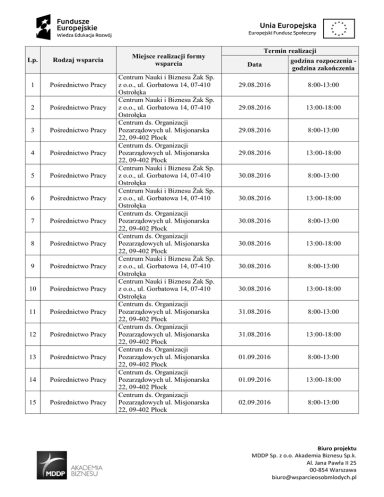Lp. Rodzaj wsparcia 1 Pośrednictwo Pracy 2 Pośrednictwo Pracy 3 Pośrednictwo Pracy 4 Pośrednictwo Pracy 5 Pośrednictwo Pracy 6 Pośrednictwo Pracy 7 Pośrednictwo Pracy 8 Pośrednictwo Pracy 9 Pośrednictwo Pracy 10 Pośrednictwo Pracy 11 Pośrednictwo Pracy 12 Pośrednictwo Pracy 13 Pośrednictwo Pracy 14 Pośrednictwo Pracy 15 Pośrednictwo Pracy Miejsce realizacji formy wsparcia Centrum Nauki i Biznesu Żak Sp. z o.o., ul. Gorbatowa 14, 07-410 07 Ostrołęka Centrum Nauki i Biznesu Żak Sp. z o.o., ul. Gorbatowa 14, 07-410 07 Ostrołęka Centrum ds. Organizacji Pozarzą Pozarządowych ul. Misjonarska 22, 09-402 402 Płock Centrum ds. Organizacji Pozarzą Pozarządowych ul. Misjonarska 22, 09-402 402 Płock Centrum Nauki i Biznesu Żak Sp. z o.o., ul. Gorbatowa 14, 07-410 07 Ostrołęka Centrum Nauki i Biznesu Żak Sp. z o.o., ul. Gorbatowa 14, 07-410 07 Ostrołęka Centrum ds. Organizacji Pozarzą Pozarządowych ul. Misjonarska 22, 09-402 402 Płock Centrum ds. Organizacji Pozarzą Pozarządowych ul. Misjonarska 22, 09-402 402 Płock Centrum Nauki i Biznesu Żak Sp. z o.o., ul. Gorbatowa 14, 07-410 07 Ostrołęka Centrum Nauki i Biznesu Żak Sp. z o.o., ul. Gorbatowa 14, 07-410 07 Ostrołęka Centrum ds. Organizacji Pozarzą Pozarządowych ul. Misjonarska 22, 09-402 402 Płock Centrum ds. Organizacji Pozarzą Pozarządowych ul. Misjonarska 22, 09-402 402 Płock Centrum ds. Organizacji Pozarzą Pozarządowych ul. Misjonarska 22, 09-402 402 Płock Centrum ds. Organizacji Pozarzą Pozarządowych ul. Misjonarska 22, 09-402 402 Płock Centrum ds. Organizacji Pozarzą Pozarządowych ul. Misjonarska 22, 09-402 402 Płock Termin realizacji Data godzina rozpoczenia godzina zakończenia 29.08.2016 8:00-13:00 29.08.2016 13:00-18:00 29.08.2016 8:00-13:00 29.08.2016 13:00-18:00 30.08.2016 8:00-13:00 30.08.2016 13:00-18:00 30.08.2016 8:00-13:00 30.08.2016 13:00-18:00 30.08.2016 8:00-13:00 30.08.2016 13:00-18:00 31.08.2016 8:00-13:00 31.08.2016 13:00-18:00 01.09.2016 8:00-13:00 01.09.2016 13:00-18:00 02.09.2016 8:00-13:00 Biuro projektu MDDP Sp. z o.o. Akademia Biznesu Sp.k. Sp.k Al. Jana Pawła II 25 00-854 Warszawa [email protected] 16 Pośrednictwo Pracy 17 Pośrednictwo Pracy 18 Pośrednictwo Pracy 19 Pośrednictwo Pracy 20 Pośrednictwo Pracy 21 Pośrednictwo Pracy 22 Pośrednictwo Pracy 23 Pośrednictwo Pracy 24 Pośrednictwo Pracy 25 Pośrednictwo Pracy 26 Pośrednictwo Pracy 27 Pośrednictwo Pracy 28 Pośrednictwo Pracy 29 Pośrednictwo Pracy 30 Pośrednictwo Pracy 31 Pośrednictwo Pracy 32 Pośrednictwo Pracy 33 Pośrednictwo Pracy 34 Pośrednictwo Pracy 35 Pośrednictwo Pracy 36 Pośrednictwo Pracy 37 Pośrednictwo Pracy Centrum ds. Organizacji Pozarzą Pozarządowych ul. Misjonarska 22, 09-402 402 Płock Młodzież Młodzieżowe Centrum Kariery, ul.Kościuszki ściuszki 39 , 26-700 26 Zwoleń Młodzież Młodzieżowe Centrum Kariery, ul.Kościuszki ściuszki 39 , 26-700 26 Zwoleń Młodzież Młodzieżowe Centrum Kariery, ul.Kościuszki ściuszki 39 , 26-700 26 Zwoleń Młodzież Młodzieżowe Centrum Kariery, ul.Kościuszki ściuszki 39 , 26-700 26 Zwoleń Młodzież Młodzieżowe Centrum Kariery, ul.Kościuszki ściuszki 39 , 26-700 26 Zwoleń Młodzież Młodzieżowe Centrum Kariery, ul.Kościuszki ściuszki 39 , 26-700 26 Zwoleń Młodzież Młodzieżowe Centrum Kariery, ul.Kościuszki ściuszki 39 , 26-700 26 Zwoleń Młodzież Młodzieżowe Centrum Kariery, ul.Kościuszki ściuszki 39 , 26-700 26 Zwoleń Młodzież Młodzieżowe Centrum Kariery, ul.Kościuszki ściuszki 39 , 26-700 26 Zwoleń Młodzież Młodzieżowe Centrum Kariery, ul.Kościuszki ściuszki 39 , 26-700 26 Zwoleń Młodzież Młodzieżowe Centrum Kariery, ul.Kościuszki ściuszki 39 , 26-700 26 Zwoleń Młodzież Młodzieżowe Centrum Kariery, ul.Kościuszki ściuszki 39 , 26-700 26 Zwoleń Młodzież Młodzieżowe Centrum Kariery, ul.Kościuszki ściuszki 39 , 26-700 26 Zwoleń Młodzież Młodzieżowe Centrum Kariery, ul.Kościuszki ściuszki 39 , 26-700 26 Zwoleń ul. Jana Kazimierza 21/31, 01-248 01 Warszawa ul. Jana Kazimierza 21/31, 01-248 01 Warszawa Ul. Nowolipki 9B, 00-151 00 Warszawa ul. Jana Kazimierza 21/31, 01-248 01 Warszawa ul. Jana Kazimierza 21/31, 01-248 01 Warszawa ul. Jana Kazimierza 21/31, 01-248 01 Warszawa ul. Jana Kazimierza 21/31, 01-248 01 Warszawa 02.09.2016 13:00-18:00 29.08.2016 8:00-13:00 29.08.2016 13:00-18:00 30.08.2016 8:00-13:00 30.08.2016 13:00-18:00 31.08.2016 8:00-13:00 31.08.2016 13:00-18:00 01.09.2016 8:00-13:00 01.09.2016 8:00-13:00 01.09.2016 13:00-18:00 02.09.2016 8:00-13:00 02.09.2016 13:00-18:00 05.09.2016 8:00-13:00 05.09.2016 13:00-18:00 06.09.2016 8:00-13:00 30.08.2016 8:00-13:00 30.08.2016 13:00-18:00 31.08.2016 8:00-13:00 01.09.2016 8:00-13:00 01.09.2016 13:00-18:00 02.09.2016 8:00-13:00 02.09.2016 13:00-18:00 Biuro projektu MDDP Sp. z o.o. Akademia Biznesu Sp.k. Sp.k Al. Jana Pawła II 25 00-854 Warszawa [email protected] 38 Pośrednictwo Pracy 39 Pośrednictwo Pracy 40 Pośrednictwo Pracy 41 Pośrednictwo Pracy 42 Pośrednictwo Pracy 43 Pośrednictwo Pracy 44 Pośrednictwo Pracy 45 Pośrednictwo Pracy 46 Pośrednictwo Pracy 47 Pośrednictwo Pracy 48 Pośrednictwo Pracy ul. Jana Kazimierza 21/31, 01-248 01 Warszawa ul. Jana Kazimierza 21/31, 01-248 01 Warszawa ul. Jana Kazimierza 21/31, 01-248 Warszawa ul. Jana Kazimierza 21/31, 01-248 01 Warszawa Młodzież Młodzieżowe Centrum Kariery, ul.Kościuszki ściuszki 39 , 26-700 26 Zwoleń Młodzież Młodzieżowe Centrum Kariery, ul.Kościuszki ściuszki 39 , 26-700 26 Zwoleń Młodzież Młodzieżowe Centrum Kariery, ul.Kościuszki ściuszki 39 , 26-700 26 Zwoleń ul. Jana Kazimierza 21/31, 01-248 01 Warszawa ul. Jana Kazimierza 21/31, 01-248 01 Warszawa Centrum Nauki i Biznesu Żak Sp. z o.o., ul. Gorbatowa 14, 07-410 07 Ostrołęka Centrum Nauki i Biznesu Żak Sp. z o.o., ul. Gorbatowa 14, 07-410 07 Ostrołęka 05.09.2016 8:00-13:00 05.09.2016 13:00-18:00 06.09.2016 8:00-13:00 06.09.2016 13:00-18:00 06.09.2016 1