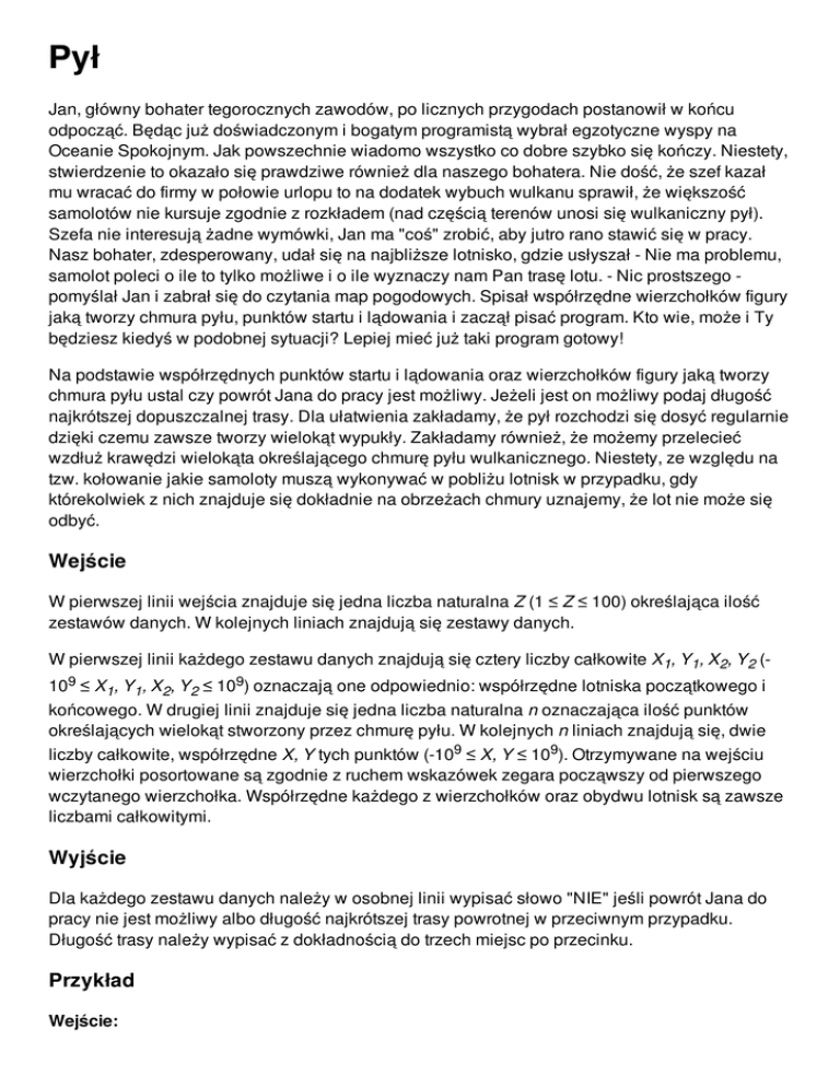 Pył Jan, główny bohater tegorocznych zawodów, po licznych przygodach postanowił w końcu odpocząć. Będąc już doświadczonym i bogatym programistą wybrał egzotyczne wyspy na Oceanie Spokojnym. Jak powszechnie wiadomo wszystko co dobre szybko się kończy. Niestety, stwierdzenie to okazało się prawdziwe również dla naszego bohatera. Nie dość, że szef kazał mu wracać do firmy w połowie urlopu to na dodatek wybuch wulkanu sprawił, że większość samolotów nie kursuje zgodnie z rozkładem (nad częścią terenów unosi się wulkaniczny pył). Szefa nie interesują żadne wymówki, Jan ma "coś" zrobić, aby jutro rano stawić się w pracy. Nasz bohater, zdesperowany, udał się na najbliższe lotnisko, gdzie usłyszał - Nie ma problemu, samolot poleci o ile to tylko możliwe i o ile wyznaczy nam Pan trasę lotu. - Nic prostszego pomyślał Jan i zabrał się do czytania map pogodowych. Spisał współrzędne wierzchołków figury jaką tworzy chmura pyłu, punktów startu i lądowania i zaczął pisać program. Kto wie, może i Ty będziesz kiedyś w podobnej sytuacji? Lepiej mieć już taki program gotowy! Na podstawie współrzędnych punktów startu i lądowania oraz wierzchołków figury jaką tworzy chmura pyłu ustal czy powrót Jana do pracy jest możliwy. Jeżeli jest on możliwy podaj długość najkrótszej dopuszczalnej trasy. Dla ułatwienia zakładamy, że pył rozchodzi się dosyć regularnie dzięki czemu zawsze tworzy wielokąt wypukły. Zakładamy również, że możemy przelecieć wzdłuż krawędzi wielokąta określającego chmurę pyłu wulkanicznego. Niestety, ze względu na tzw. kołowanie jakie samoloty muszą wykonywać w pobliżu lotnisk w przypadku, gdy którekolwiek z nich znajduje się dokładnie na obrzeżach chmury uznajemy, że lot nie może się odbyć. Wejście W pierwszej linii wejścia znajduje się jedna liczba naturalna Z (1 ≤ Z ≤ 100) określająca ilość zestawów danych. W kolejnych liniach znajdują się zestawy danych. W pierwszej linii każdego zestawu danych znajdują się cztery liczby całkowite X1, Y1, X2, Y2 (109 ≤ X1, Y1, X2, Y2 ≤ 109) oznaczają one odpowiednio: współrzędne lotniska początkowego i końcowego. W drugiej linii znajduje się jedna liczba naturalna n oznaczająca ilość punktów określających wielokąt stworzony przez chmurę pyłu. W kolejnych n liniach znajdują się, dwie liczby całkowite, współrzędne X, Y tych punktów (-109 ≤ X, Y ≤ 109). Otrzymywane na wejściu wierzchołki posortowane są zgodnie z ruchem wskazówek zegara począwszy od pierwszego wczytanego wierzchołka. Współrzędne każdego z wierzchołków oraz obydwu lotnisk są zawsze liczbami całkowitymi. Wyjście Dla każdego zestawu danych należy w osobnej linii wypisać słowo "NIE" jeśli powrót Jana do pracy nie jest możliwy albo długość najkrótszej trasy powrotnej w przeciwnym przypadku. Długość trasy należy wypisać z dokładnością do trzech miejsc po przecinku. Przykład Wejście: 3 13 4 7 4 5 54 67 10 6 92 62 13 4 4 2 5 54 67 10 6 92 62 13 4 4 1 5 54 67 10 6 92 62 Wyjście: NIE 9.472 9.571