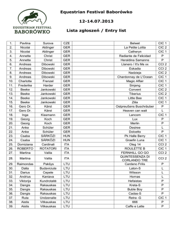 Equestrian Festival Baborówko 12-14.07.2013 Lista zgłoszeń / Entry list 1. 2. 3. 4. 5. 6. 7. 8. 9. 10. 11. 12. 13. 14. 15. 16. 17. 18. 19. 20. 21. 22. 23. 24. 25. 26. 27. Pavlina Nicolai Nicolai Annette Annette Andreas Andreas Andreas Andreas Charlotte Frederike Beeke Beeke Beeke Beeke Gero Dr. Gero Dr. Inga Georg Georg Anke Anke Csaba Csaba Domiziana ROBERTO Martina Surova Aldinger Aldinger Christ Christ Dibowski Dibowski Dibowski Dibowski Frenzel Harder Jankowski Jankowski Jankowski Jankowski Kärst Kärst Kissmann Koch Koch Schüler Schüler SÁRKÖZI SÁRKÖZI Cardinali ROTATORI Valila CZE GER GER GER GER GER GER GER GER GER GER GER GER GER GER GER GER GER GER GER GER GER HUN HUN ITA ITA ITA 28. Martina Valila ITA 29. 30. 31. 32. 33. 34. 35. 36. 37. 38. 39. Raimondas Dalia Darius Andrius Viktorija Dangis Dangis Dangis Ruta Aistis Aistis Pakšys Budaviciute Cepele Kaniava Kundrotaitė Rakauskas Rakauskas Rakauskas Undzenaite Vitkauskas Vitkauskas LTU LTU LTU LTU LTU LTU LTU LTU LTU LTU LTU Belwet La Petite Lolita Catheryn Radiante de Felicidad Heraldina Samanns Llanero / It's Me xx Eskadia Nadzieja Chardonnay de L'Ocean Magic Affair Sinjang Convent Tiberius Little Bee Zilia Ostpreußens Buschräuber Heaven can wait Lancom Lux Merlin Desiree Dolcetto Pk Halle Berry Graefin Luna Oleg 14 ROULETTE B FERNHILL GO GO QUINTESSENZA DI CORLANDO TRE Cardeno Frilis Laton-S Wilsson Hornas Hefaistas Kreta-S Buble Boy Cadas-S Retra -G 666 Caffe e Latte CIC 1 CIC 2 CIC 1 P P CCI 2 CCI 2 CIC 2 CIC 1 CIC 1 CIC 1 CIC 2 CIC 2 CIC 1 CIC 1 P L CIC 1 P P L P CIC 1 CIC 1 CCI 2 CIC 1 CCI 2 CCI 2 P L L L P P P P CIC 1 P P 40. 41. 42. 43. 44. 45. 46. 47. 48. 49. 50. 51. 52. 53. 54. 55. 56. 57. 58. 59. 60. 61. 62. 63. 64. 65. 66. 67. 68. 69. 70. 71. 72. 73. 74. 75. 76. Sanne Sanne Sanne Jeroen Marta Ewa Aleksandra Aleksandra Patrycja Zuzanna Karolina Dorota Dorota Małgorzata Daria Paulina Jan Jan Jan Jacek Joanna Joanna Paweł Paweł Małgorzata Agnieszka Lesław Paweł Paweł Paweł Sara Agata Sylwia Karolina Sandra Łukasz Łukasz 77. Jaoann 78. Jaoann 79. 80. Katarzyna Jagoda de Jong de Jong de Jong Bronnenberg Gajewska Kurnik Lauk Lauk Zubko Burkert Maszkowska Olkiewicz Olkiewicz Świderek Baran Wachnowska Zapała Mossakowski Mossakowski Mossakowski Jędrzejak Piechna Piechna Rutkowski Rutkowski Goetel Pokusa Gerlaczyński Spisak Spisak Spisak Śnioch Gil Kupczyk Kalinowska Christensen Sikorski Sikorski MandeckaTurczyńska MandeckaTurczyńska Skrzypczak Turczyńska NED NED NED POL POL POL POL POL POL POL POL POL POL POL POL POL POL POL POL POL POL POL POL POL POL POL POL POL POL POL POL POL POL POL POL POL POL BKS Kłos BKS Kłos BKS Kłos BKS Kłos BKS Kłos BKS Kłos bpk bpk bpk bpk bpk bpk bpk CWJ POZNAŃ CWJ POZNAŃ CWJ POZNAŃ ECO-MILK Kamionki ECO-MILK Kamionki ECO-MILK Kamionki ECO-MILK Kamionki ECO-MILK Kamionki GTH GTH JKS Dako Galant Skibno JKS Dako Galant Skibno JKS Dako Galant Skibno JKS Dako Galant Skibno JKS Dako Galant Skibno JKS Gostchorze JKS Jaroszówka JKS Karolina JKS Tornado Szczecin KJ Dworek KJ Dworek Ucatan O’Prospect Bon Jovi Akt Kasztelan Dukat Springstar Sid Cyklon Łowca Etiuda Etos Ozon Epikur Zilndra Son of Light Nigara Nawis Bad Boy Westa Bastion Golf Arco -W Wenecja Helios 155 Santi Haman Pasja Dolar Banderas Tamburynek Tamerlan Rozmaryn Romina No Name Benefis Dekadencja CCI 2 CCI 2 CIC 1 L L L CIC 2 P L P L L L CIC 2 L L CCI 2 CCI 2 L P L L L P P L CIC 1 CIC 2 L CIC 1 P L P P L P L POL KJ Facimiech Awa P POL KJ Facimiech Dunka L POL POL KJ Facimiech KJ Facimiech Horus Jedwabny Pył L L 81. Aleksa 82. Aleksa 83. Artur 84. Artur 85. Artur 86. Artur 87. Zuzanna 88. Gabriela 89. Jerzy 90. Jerzy 91. Ewa 92. Jagienka 93. Aleksander 94. Aleksander 95. Michał 96. Gabriela 97. Magdalena 98. Natalia 99. Maciej 100. Maciej 101. Magdalena 102. Marcin 103. Marcin 104. Monika 105. Paweł 106. Zbigniew 107. Małgorzata 108. Franziska 109. Mariusz 110. Oliwia 111. Klaudia 112. Hanna 113. Natalia 114. Tomasz 115. Tomasz 116. Jakub 117. Jakub 118. Zbigniew 119. Zbigniew 120. Włodzimierz 121. Włodzimierz 122. Wiesław Karlińska Karlińska Społowicz Społowicz Społowicz Społowicz Rogińska Tomczuk Krukowski Krukowski Lewandowska Łukomska Kadłubowski Kadłubowski Hycki Klimkowicz Sobuś Wrona Piasecki Piasecki Sobczyńska Wołejszo Michałek Michałek Rajska Warszawski Witczak Borysiuk Gillmaier Kleniuk Sałyga Solga Wołoszyn Wójcik Stachowiak Stachowiak Kreft Kreft Talarczyk Talarczyk Rudasz Rudasz Nowak POL POL POL POL POL POL POL POL POL POL POL POL POL POL POL POL POL POL POL POL KJ Jaroszówka KJ Jaroszówka KJ Jaroszówka KJ Jaroszówka KJ Jaroszówka KJ Jaroszówka KJ Młyńska Struga KJ Młyńska Struga KJ Rakowiec Kwidzyn KJ Rakowiec Kwidzyn KJ Rakowiec Kwidzyn KJ Rancho Poznań KJ Strzała KJ Strzała KJ Szarza KJ Szarza KJ Szarza KS Raszyn LKJ Abaria Iwno LKJ Abaria Iwno Mika Remiks Grubianin Haszysz Baryt Harbuz Czakin Charyzma Apokalipsa Elstera Sheridan Robi Devin du Maury Eminor Cyran Major Unisono Sportsfield Ptibaby Kordial II Edytor CIC 1 P CIC 2 CIC 2 CIC 1 CIC 1 L P CIC 2 CIC 1 L P CCI 2 L L L L CIC 1 L L POL LKJ Aga Ingana P POL POL POL POL POL POL POL POL POL POL POL POL POL POL POL POL POL POL POL POL POL LKJ Gabon Walewice LKJ Gabon Walewice LKJ Gabon Walewice LKJ Gabon Walewice LKJ Gabon Walewice LKJ Hipologia Strzegom LKJ Hipologia Strzegom LKJ Hipologia Strzegom LKJ Hipologia Strzegom LKJ Hipologia Strzegom LKJ Hipologia Strzegom LKJ Hipologia Strzegom LKJ Moszna LKJ Moszna LKS Dragon Nowielice LKS Dragon Nowielice LKS Nadwiślanin Kwidzyn LKS Nadwiślanin Kwidzyn LKS Nadwiślanin Kwidzyn LKS Nadwiślanin Kwidzyn LKS Stragona Strzegom Stilios Eldona Garos Gondolier Jubilatka Promyk Dornice Winona S-Gwiazdka Łotwa Missisipi-P Dzieża Hamburg Erez "M" Husiatyn Cornerro Norbi Orio Grandial Carvinjo HBC Selina CIC 1 P L CIC 2 P CCI 2 P CIC 1 L L L L L L CIC 1 L L P L L L 123. Wiesław 124. Jan 125. Marianna 126. Krzysztof 127. Krzysztof 128. Jacek 129. Jac