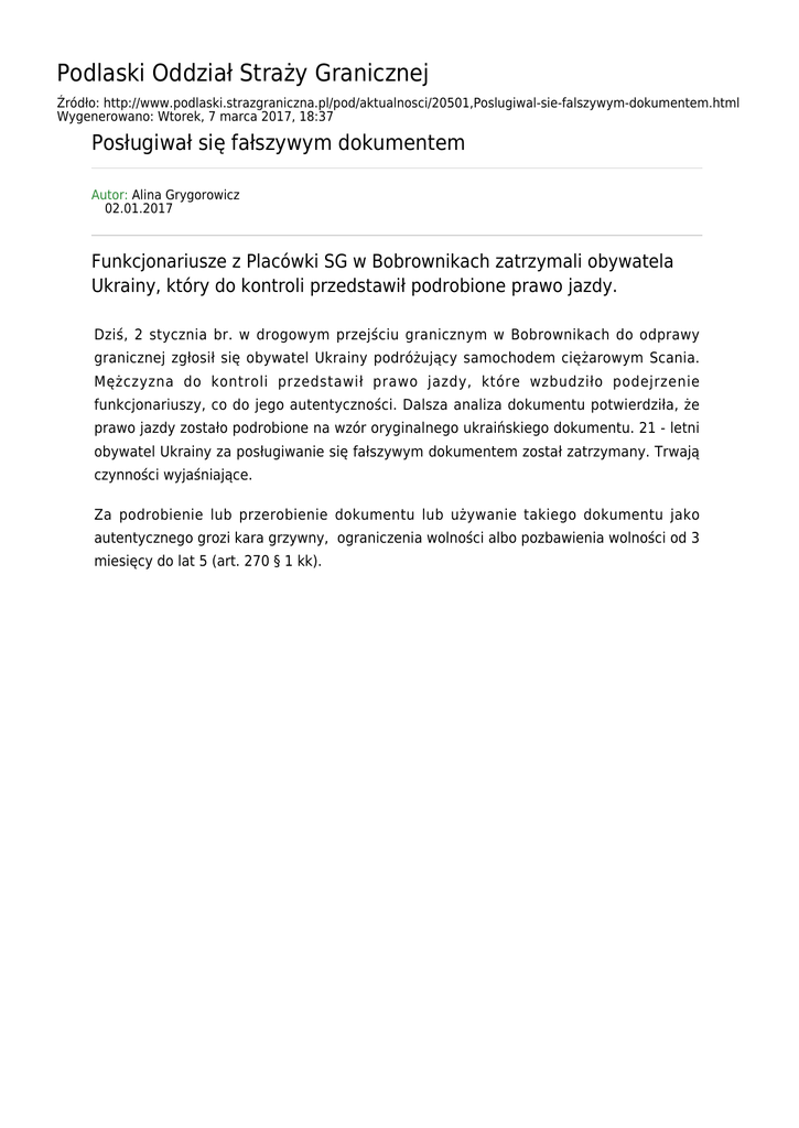 Podlaski Oddział Straży Granicznej Źródło: http://www.podlaski.strazgraniczna.pl/pod/aktualnosci/20501,Poslugiwal-sie-falszywym-dokumentem.html Wygenerowano: Wtorek, 7 marca 2017, 18:37 Posługiwał się fałszywym dokumentem Autor: Alina Grygorowicz 02.01.2017 Funkcjonariusze z Placówki SG w Bobrownikach zatrzymali obywatela Ukrainy, który do kontroli przedstawił podrobione prawo jazdy. Dziś, 2 stycznia br. w drogowym przejściu granicznym w Bobrownikach do odprawy granicznej zgłosił się obywatel Ukrainy podróżujący samochodem ciężarowym Scania. Mężczyzna do kontroli przedstawił prawo jazdy, które wzbudziło podejrzenie funkcjonariuszy, co do jego autentyczności. Dalsza analiza dokumentu potwierdziła, że prawo jazdy zostało podrobione na wzór oryginalnego ukraińskiego dokumentu. 21 - letni obywatel Ukrainy za posługiwanie się fałszywym dokumentem został zatrzymany. Trwają czynności wyjaśniające. Za podrobienie lub przerobienie dokumentu lub używanie takiego dokumentu jako autentycznego grozi kara grzywny, ograniczenia wolności albo pozbawienia wolności od 3 miesięcy do lat 5 (art. 270 § 1 kk).