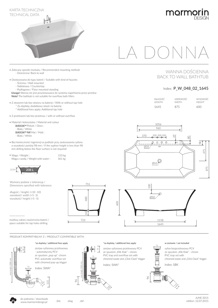 KARTA TECHNICZNA TECHNICAL DATA la donna_bathtub_md LA DONNA • Zalecany sposób montażu / Recommended mounting method: - Dościenna/ Back to wall WANNA DOŚCIENNA BACK TO WALL BATHTUB • Dostosowana do typu baterii / Suitable with kind of faucets: - Ścienna / Wall mounted - Nablatowa / Countertop - Podłogowa / Floor mounted standing Uwaga! Wanna nie jest przystosowana do systemu napełniania przez przelew Note! The bathtub is not suitable for overflow bath fillers Index: • Z otworem lub bez otworu na baterię / With or without tap hole * Za dopłatą: dodatkowy otwór na baterię * Additional fees apply: Additional tap hole P_W_048_02_1645 DŁUGOŚĆ LENGTH SZEROKOŚĆ WIDTH WYSOKOŚĆ HEIGHT 1645 875 600 • Z przelewem lub bez przelewu / with or without overflow • Materiał i kolorystyka / Material and colour Połysk / Gloss : - Biały / White Mat / Matt : - Biały / White 1056 80 98 • Bez konieczności ingerencji w podłoże przy zastosowaniu syfonu o wysokości poniżej 98 mm / If the syphon height is less than 98 mm drilling below the floor surface is not required Ø35 475 • Waga / Weight : Waga z wodą / Weight with water : 100 100 100 370 49 960 153 kg 361 kg 875 Ø53 2/3 h la donna Wymiary podane z tolerancją / Dimensions specified with tolerance: Ø50 102 600 480 długość / lenght: (+10 -10) szerokość/ width (+5 -5) wysokość/ height (+5 -5) 100 751 możliwy zakres nawiercenia baterii / space suitable for tap holes drilling 723 1158 1645 zestaw syfonowy przelewowy - automatyczny PCV ze spustem „pop up” -chrom PVC automatic overflow set with chromed pop-up trigger zestaw syfonowo przelewowy PCV ze spustem „Klik Klak” - chrom PVC trap and overflow set with chromed waste and „Click Clack” trigger 73 *za dopłatą / additional fees apply Index: SWK* .dwg .dxf syfon bezprzelewowy PCV ze spustem „Klik Klak” - chrom PVC trap set with chromed waste and „Click Clack” trigger Index: SBK o/ d5 0 0 o/ d5 .3ds 72 w zestawie / set included 70 96 115 d5 do pobrania / downloads www.marmorindesign.pl 72 96 max lenght 1000 mm 72 Index: SWA* 0 72 *za dopłatą / additional fees apply o/ max lenght 1000 mm 90 PRODUKT KOMPATYBILNY Z / PRODUCT COMPATIBLE WITH: JUNE 2015 edition: 12.07.2015