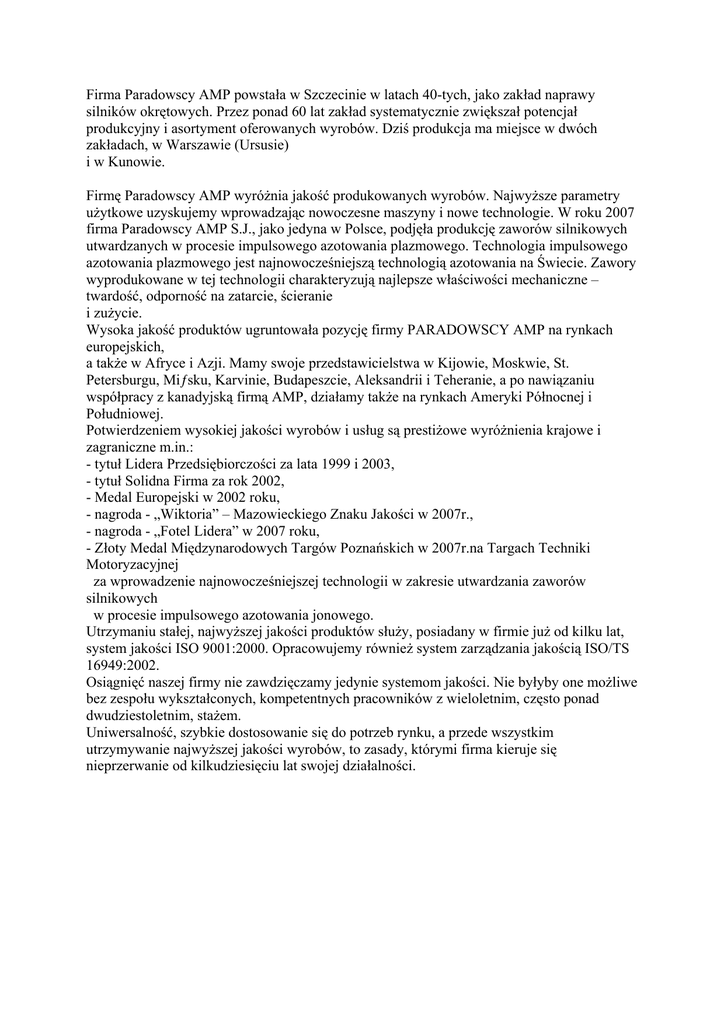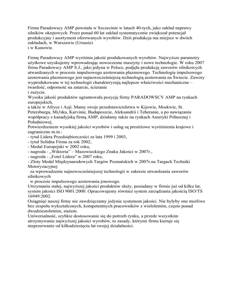 Firma Paradowscy AMP powstała w Szczecinie w latach 40-tych, jako zakład naprawy silników okrętowych. Przez ponad 60 lat zakład systematycznie zwiększał potencjał produkcyjny i asortyment oferowanych wyrobów. Dziś produkcja ma miejsce w dwóch zakładach, w Warszawie (Ursusie) i w Kunowie. Firmę Paradowscy AMP wyróżnia jakość produkowanych wyrobów. Najwyższe parametry użytkowe uzyskujemy wprowadzając nowoczesne maszyny i nowe technologie. W roku 2007 firma Paradowscy AMP S.J., jako jedyna w Polsce, podjęła produkcję zaworów silnikowych utwardzanych w procesie impulsowego azotowania plazmowego. Technologia impulsowego azotowania plazmowego jest najnowocześniejszą technologią azotowania na Świecie. Zawory wyprodukowane w tej technologii charakteryzują najlepsze właściwości mechaniczne – twardość, odporność na zatarcie, ścieranie i zużycie. Wysoka jakość produktów ugruntowała pozycję firmy PARADOWSCY AMP na rynkach europejskich, a także w Afryce i Azji. Mamy swoje przedstawicielstwa w Kijowie, Moskwie, St. Petersburgu, Miƒsku, Karvinie, Budapeszcie, Aleksandrii i Teheranie, a po nawiązaniu współpracy z kanadyjską firmą AMP, działamy także na rynkach Ameryki Północnej i Południowej. Potwierdzeniem wysokiej jakości wyrobów i usług są prestiżowe wyróżnienia krajowe i zagraniczne m.in.: - tytuł Lidera Przedsiębiorczości za lata 1999 i 2003, - tytuł Solidna Firma za rok 2002, - Medal Europejski w 2002 roku, - nagroda - „Wiktoria” – Mazowieckiego Znaku Jakości w 2007r., - nagroda - „Fotel Lidera” w 2007 roku, - Złoty Medal Międzynarodowych Targów Poznańskich w 2007r.na Targach Techniki Motoryzacyjnej za wprowadzenie najnowocześniejszej technologii w zakresie utwardzania zaworów silnikowych w procesie impulsowego azotowania jonowego. Utrzymaniu stałej, najwyższej jakości produktów służy, posiadany w firmie już od kilku lat, system jakości ISO 9001:2000. Opracowujemy również system zarządzania jakością ISO/TS 16949:2002. Osiągnięć naszej firmy nie zawdzięczamy jedynie systemom jakości. Nie byłyby one możliwe bez zespołu wykształconych, kompetentnych pracowników z wieloletnim, często ponad dwudziestoletnim, stażem. Uniwersalność, szybkie dostosowanie się do potrzeb rynku, a przede wszystkim utrzymywanie najwyższej jakości wyrobów, to zasady, którymi firma kieruje się nieprzerwanie od kilkudziesięciu lat swojej działalności.