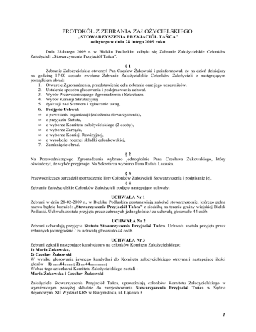 PROTOKÓŁ Z ZEBRANIA ZAŁOŻYCIELSKIEGO „STOWARZYSZENIA PRZYJACIÓŁ TAŃCA” odbytego w dniu 28 lutego 2009 roku Dnia 28-lutego 2009 r. w Bielsku Podlaskim odbyło się Zebranie Założycielskie Członków Założycieli „Stowarzyszenia Przyjaciół Tańca”. §1 Zebranie Założycielskie otworzył Pan Czesław Żukowski i poinformował, że na dzień dzisiejszy na godzinę 17:00 zostało zwołane Zebranie Założycielskie Członków Założycieli z następującym porządkiem obrad: 1. Otwarcie Zgromadzenia, przedstawienie celu zebrania oraz jego uczestników. 2. Ustalenie sposobu głosowania i podejmowania uchwał. 3. Wybór Przewodniczącego Zgromadzenia i Sekretarza. 4. Wybór Komisji Skrutacyjnej 5. dyskusji nad Statutem i zgłaszanie uwag, 6. Podjęcie Uchwał: • o powołaniu organizacji (założeniu stowarzyszenia), • o przyjęciu Statutu, • o wyborze Komitetu założycielskiego (2 osoby), • o wyborze Zarządu, • o wyborze Komisji Rewizyjnej, • o wysokości rocznej składki członkowskiej, 7. Zamknięcie obrad. §2 Na Przewodniczącego Zgromadzenia wybrano jednogłośnie Pana Czesława Żukowskiego, który oświadczył, że wybór przyjmuje. Na Sekretarza wybrano Pana Rafała Laszuka. §3 Przewodniczący zarządził sporządzenie listy Członków Założycieli Stowarzyszenia i podpisanie jej. §4 Zebranie Założycielskie Członków Założycieli podjęło następujące uchwały: UCHWAŁA Nr 1 Zebrani w dniu 28-02-2009 r., w Bielsku Podlaskim postanawiają założyć stowarzyszenie, którego pełna nazwa będzie brzmieć: „Stowarzyszenie Przyjaciół Tańca” z siedzibą na terenie gminy wiejskiej Bielsk Podlaski. Uchwała została przyjęta przez zebranych jednogłośnie / za uchwałą głosowało 44 osób. UCHWAŁA Nr 2 Zebrani uchwalają przyjęcie Statutu Stowarzyszenia Przyjaciół Tańca. Uchwała została przyjęta przez zebranych jednogłośnie / za uchwałą głosowało 44 osób. UCHWAŁA Nr 3 Zebrani zgłosili następujące kandydatury na członków Komitetu Założycielskiego: 1) Maria Żukowska, 2) Czesław Żukowski W wyniku głosowania jawnego kandydaci do Komitetu założycielskiego otrzymali następujące ilości głosów 1) ......44........; 2) ....44..............; Wobec tego członkami Komitetu Założycielskiego zostali : Maria Żukowska i Czesław Żukowski Założyciele Stowarzyszenia Przyjaciół Tańca, upoważniają członków Komitetu Założycielskiego w wymienionym powyżej składzie do zarejestrowania Stowarzyszenia Przyjaciół Tańca w Sądzie Rejonowym, XII Wydział KRS w Białymstoku, ul. Łąkowa 3 1 UCHWAŁA Nr 4 Zebrani zgłosili następujące kandydatury na członków Zarządu: 1. Maria Żukowska – Prezes Zarządu Stowarzyszenia, 2. Rafał Laszuk, 3. Katarzyna Walerian, W wyniku głosowania jawnego kandydaci do Zarządu otrzymali następujące ilości głosów: 1) ......44........; 2) ..........44......; 3) .......44.......; Wobec tego członkami Zarządu zostali 1. Prezes Zarządu - Maria Żukowska 2. Skarbnik -Vice Prezes - Rafał Laszuk, 3. Sekretarz -Vice Prezes - Katarzyna Walerian, UCHWAŁA Nr 5 Zebrani zgłosili następujące kandydatury na członków Komisji Rewizyjnej: 1) Krzysztof Stanisław Linka 2) Małgorzata Wiercińska 3) Ewa Oksiuta W wyniku głosowania jawnego kandydaci do Komisji Rewizyjnej otrzymali następujące ilości głosów: 1) .......44......; 2) .......44.......; 3) .........44........ Wobec tego członkami Komisji Rewizyjnej zostali : 1. Przewodniczący Komisji Rewizyjnej - Krzysztof Stanisław Linka. 2. Zastępca - Ewa Oksiuta 3. Sekretarz - Małgorzata Wiercińska UCHWAŁA Nr 6 Zebrani uchwalają przyjęcie na rok 2009 składki członkowskiej w wysokości 50 zł za rok. Uchwała została przyjęta przez zebranych jednogłośnie / za uchwałą głosowało 44 osób. §5 Wobec wyczerpania porządku obrad Przewodniczący zamknął Zebranie Założycielskie. Do protokołu niniejszego załączono listę obecności Członków Założycieli Stowarzyszenia. Przewodniczący: Czesław Żukowski Sekretarz: Rafał Laszuk 2