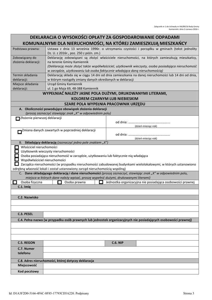 Załącznik nr 1 do Uchwały nr XIX/89/16 Rady Gminy Kamiennik z dnia 2 czerwca 2016 r. DEKLARACJA O WYSOKOŚCI OPŁATY ZA GOSPODAROWANIE ODPADAMI KOMUNALNYMI DLA NIERUCHOMOŚCI, NA KTÓREJ ZAMIESZKUJĄ MIESZKAŃCY Podstawa prawna: Zobowiązany do złożenia deklaracji: Termin składania deklaracji: Miejsce składania deklaracji: Ustawa z dnia 13 września 1996r. o utrzymaniu czystości i porządku w gminach (tekst jednolity Dz. U. z 2016r., poz. 250 z późn. zm.) Deklarację zobowiązani są złożyć właściciele nieruchomości, na których zamieszkują mieszkańcy, na terenie Gminy Kamiennik (Deklarację może złożyć także współwłaściciel, użytkownik wieczysty, osoba posiadająca nieruchomość w zarządzie, użytkowaniu lub osoba faktycznie władająca daną nieruchomością) Deklarację składa się w ciągu 14 dni od dnia zamieszkania na danej nieruchomości lub 14 dni od dnia, w którym nastąpiły zmiany danych określonych w deklaracji Urząd Gminy Kamiennik ul. 1 go Maja 69, 48-388 Kamiennik WYPEŁNIAĆ NALEŻY JASNE POLA DUŻYMI, DRUKOWANYMI LITERAMI, KOLOREM CZARNYM LUB NIEBIESKIM SZARE POLA WYPEŁNIA PRACOWNIK URZĘDU A. Okoliczności powodujące obowiązek złożenia deklaracji (proszę zaznaczyć stawiając znak „X” w odpowiednim polu) Złożenie pierwszej deklaracji od dnia: …………………………………………... (dzień-miesiąc-rok) Zmiana danych zawartych w poprzedniej deklaracji od dnia: …………………………………………… (dzień-miesiąc-rok) B. Składający deklarację (zaznaczyć jedno pole znakiem „X”) Właściciel nieruchomości Użytkownik wieczysty nieruchomości Osoba posiadająca nieruchomość w zarządzie, użytkowaniu lub faktycznie nią władająca Współwłaściciel nieruchomości Zarządca nieruchomości (w przypadku nieruchomości zabudowanej budynkami wielolokalowymi, w których ustanowiono odrębną własność lokali i został ustanowiony zarząd nieruchomością wspólną) C. Dane składającego deklarację i dane nieruchomości (proszę zaznaczyć, stawiając znak „X” w odpowiednim polu, miejsca w których dane należy wpisać, proszę wypełnić dużymi, drukowanymi literami) Osoba fizyczna Osoba prawna Jednostka organizacyjna nie posiadająca osobowości prawnej C.1. Imię C.2. Nazwisko C.3. PESEL C.4. Pełna nazwa (w przypadku osób prawnych lub jednostek organizacyjnych nie posiadających osobowości prawnej) C.5. REGON C.6. NIP C.7. Numer telefonu C.8. Adres nieruchomości, której dotyczy deklaracja Miejscowość Kod pocztowy Id: D1A3F2D0-5166-4F6C-8F85-17793CD5A220. Podpisany Strona 3 Poczta Ulica Nr domu Nr lokalu C.9. Adres zamieszkania (lub adres siedziby składającego deklarację) Adres zamieszkania składającego deklarację (lub adres siedziby składającego deklarację) jest taki sam jak adres nieruchomości, której dotyczy deklaracja (proszę zaznaczyć znak „X” i pominąć pozostałą część punktu C.9.) Gmina Miejscowość Kod pocztowy Poczta Ulica Nr domu Nr lokalu D. Dane na temat sposobu zbierania i magazynowania odpadów D.1. Sposób zbierania odpadów Odpady komunalne będą zbierane w sposób Odpady komunalne nie będą zbierane selektywny zgodnie z regulaminem w sposób selektywny utrzymania czystości i porządku na terenie Gminy Kamiennik E. Opłata za gospodarowanie odpadami komunalnymi (zaznaczyć znakiem „X” lub w przypadku większej ilości osób niż 5, wpisać cyframi w kratkach) E.1. Deklaruję następującą 1 jedna dwie trzy cztery pięć ilość osób zamieszkujących nieruchomość, której Więcej niż 5 osób, tj. dotyczy deklaracja E.2. Prowadzenie kompostownika na nieruchomości proszę zaznaczyć, stawiając znak „X” jeśli nieruchomość jest wyposażona w kompostownik) Deklaruję, że na terenie nieruchomości, której dotyczy deklaracja, prowadzić będę kompostownik. 2 E.3. Wysokość opłaty od jednego mieszkańca (proszę zaznaczyć, stawiając znak „X” w odpowiednim polu) Dla odpadów komunalnych zbieranych w sposób Dla odpadów komunalnych nie zbieranych w sposób selektywny, stawka opłaty od 1 mieszkańca za 1 miesiąc selektywny, stawka opłaty od 1 mieszkańca za 1 miesiąc określona jest w uchwale Rady Gminy Kamiennik w określona jest w uchwale Rady Gminy Kamiennik w sprawie sprawie wyboru metody ustalania opłaty za wyboru metody ustalania opłaty za gospodarowanie gospodarowanie odpadami komunalnymi oraz ustalenia odpadami komunalnymi oraz ustalenia wysokości tej opłaty wysokości tej opłaty i wynosi: i wynosi: ………. zł ………. zł E.4. Obliczenie stawki opłaty miesięcznej dla nieruchomości, na której zamieszkują mieszkańcy (kwotę należy podać w złotych polskich z dokładnością do dwóch miejsc po przecinku) Stawka opłaty z pkt. E.3. x Ilość osób zamieszkujących = nieruchomość z pkt. E.1. F. Deklaracja zapotrzebowania na pojemniki i worki dla poszczególnych rodzajów odpadów: minimalną pojemność pojemnika określić należy według Regulaminu utrzymania czystości i porządku na terenie Gminy Kamiennik F.1. Zabudowa jednorodzinna Deklaruję zapotrzebowanie na następującą ilość 120l pojemników przeznaczonych do zbierania ZMIESZANYCH ODPADÓW KOMUNALNYCH 240l 1100 l 3 2,5 m Deklaruję zapotrzebowanie na następującą ilość pojemników 110 l przeznaczonych do zbierania POPIOŁU Id: D1A3F2D0-5166-4F6C-8F85-17793CD5A220. Podpisany Strona 4 Deklaruję zapotrzebowanie na następującą ilość worków 120 l przeznaczonych do zbierania odpadów surowcowych (suchych) Deklaruję zapotrzebowanie na następującą ilość worków 120 l przeznaczonych do zbierania SZKŁA F.2. Zabudowa wielorodzinna Deklaruję zapotrzebowanie na następującą ilość pojemników przeznaczonych do zbierania zmieszanych odpadów komunalnych 120l 240l 1100l 3 Deklaruję zapotrzebowanie na następującą ilość pojemników przeznaczonych do zbierania odpadów surowcowych (suchych) 2,5 m 120l 240l 1100l 