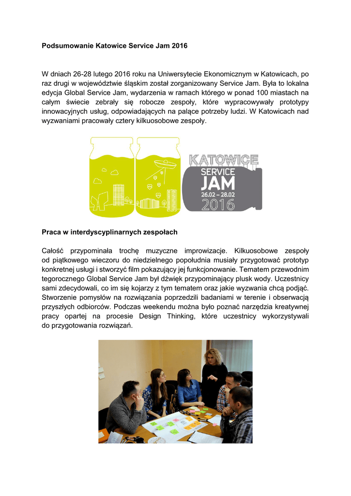Podsumowanie Katowice Service Jam 2016 W dniach 26-28 lutego 2016 roku na Uniwersytecie Ekonomicznym w Katowicach, po raz drugi w województwie śląskim został zorganizowany Service Jam. Była to lokalna edycja Global Service Jam, wydarzenia w ramach którego w ponad 100 miastach na całym świecie zebrały się robocze zespoły, które wypracowywały prototypy innowacyjnych usług, odpowiadających na palące potrzeby ludzi. W Katowicach nad wyzwaniami pracowały cztery kilkuosobowe zespoły. Praca w interdyscyplinarnych zespołach Całość przypominała trochę muzyczne improwizacje. Kilkuosobowe zespoły od piątkowego wieczoru do niedzielnego popołudnia musiały przygotować prototyp konkretnej usługi i stworzyć film pokazujący jej funkcjonowanie. Tematem przewodnim tegorocznego Global Service Jam był dźwięk przypominający plusk wody. Uczestnicy sami zdecydowali, co im się kojarzy z tym tematem oraz jakie wyzwania chcą podjąć. Stworzenie pomysłów na rozwiązania poprzedzili badaniami w terenie i obserwacją przyszłych odbiorców. Podczas weekendu można było poznać narzędzia kreatywnej pracy opartej na procesie Design Thinking, które uczestnicy wykorzystywali do przygotowania rozwiązań. Cztery rozwiązania w Katowicach W efekcie pracy zespołowej powstały bardzo ciekawe rozwiązania: Jazzy Audio Mobile Application – usługa wraz z aplikacją dla osób niewidomych, która ma pomóc w poruszaniu po terenie Uniwersytetu Ekonomicznego w Katowicach; Waterhole – dystrybutor z wodą, który pozwoli ludziom przebywającym w przestrzeniach publicznych utrzymywać odpowiedni poziom nawodnienia; Shit happens – kampania oraz program motywujący do sprzątania po psich kupach w miastach; Water Saver – aplikacja uświadamiająca ile kosztują poszczególne czynności związane z korzystaniem z wody, jak kąpiel, prysznic czy mycie naczyń. Głosami wszystkich uczestników warsztatów ostatni pomysł – Water Saver – zyskał najwięcej punktów, a członkowie zespołu przygotowującego to rozwiązanie otrzymali zestaw dżemów od „A to dobre!”. Filmy nakręcone przez zespoły oraz szczegóły prototypów usług wypracowanych podczas Katowice Service Jam 2016 można znaleźć pod adresem http://planet.globalservicejam.org/gsj16/jamsite/15788/projects Nowi innowatorzy W całym wydarzeniu chodzi jednak nie tyle o stworzenie innowacyjnych usług, co o wykreowanie innowatorów. Dzięki moderowanemu procesowi, uczestnicy mieli okazję wykorzystać swoją wiedzę i doświadczenie we wspólnym tworzeniu. Były to osoby z różnych branż, m.in. projektanci, przedsiębiorcy, społecznicy, studenci, naukowcy, pracownicy wielkich korporacji, jak i mniejszych firm. Taka mieszanka utalentowanych ludzi, którzy chcą podjąć wspólne wyzwanie pozwoliła spojrzeć z różnych perspektyw na przekazany temat przewodni. Osoby, które kreatywnie pracowały przez cały weekend będą mogły podobnie działać w swojej codziennej pracy. Katowice Service Jam 2016 zostało zorganizowane przez Fundację na rzecz Inteligentnego Rozwoju, we współpracy z Uniwersytetem Ekonomicznym w Katowicach, Centrum Innowacji i Transferu Technologii Politechniki Śląskiej spółką celową Uniwersytetu Śląskiego w Katowicach SPIN-US Sp. z o. o. Global Service Jam Global Service Jam to spotkanie osób zainteresowanych tworzeniem usług zgodnie z podejściem opartym na myśleniu projektowym (Design Thinking). W trakcie spotkania zachęca się uczestników do eksperymentowania i innowacyjnego myślenia. Uczestnicy spotykają się bez własnego zespołu, bez pomysłu na rozwiązanie i poznają temat, który jest motywem przewodnim w projektowaniu nowego świata. Zgłębiają wybraną kwestię problemową, dla której przygotowują propozycje rozwiązań. Kwintesencją całego spotkania jest tworzenie prototypów, które w prosty sposób pokazują, jak wymyślona usługa ma funkcjonować. Jest to także okazja poznania nowych ludzi i nawiązania kontaktów, które mogą owocować po samym wydarzeniu. Wydarzenia w ramach Global Service Jam organizowane są na arenie międzynarodowej w ten sam weekend. Wszystkie mają ten sam wyjściowy temat i lokalne wyniki prac są publikowane na centralnej platformie.