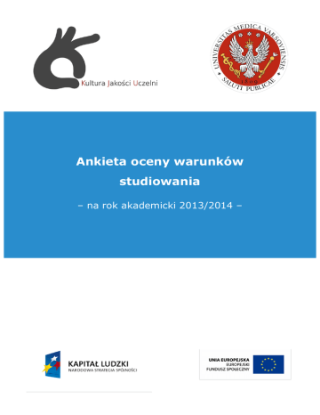 Ankieta oceny warunków studiowania – na rok akademicki 2013/2014 – 1 PREAMBUŁA Zapraszamy do udziału w dobrowolnej ankiecie mającej na celu zebranie opinii na temat jakości wsparcia oferowanego studentom przez Warszawski Uniwersytet Medyczny. Prosimy o ocenę bloków tematycznych, które Pana/nią interesują. Jedynym obowiązkowym elementem ankiety jest metryczka; zawarte w niej informacje pozwolą na analizę zebranych opinii oraz podjęcie odpowiednich działań doskonalących. Po wysłaniu ankiety nie będzie możliwe uzupełnienie, ani poprawa wprowadzonych odpowiedzi. Ankieta jest anonimowa. Pana/i dane identyfikacyjne zostaną automatycznie odcięte od udzielonych odpowiedzi. 2 ZAJĘCIA ADAPTACYJNE Czy brał/a Pan/i udział w zajęciach adaptacyjnych? 1. tak 2. nie Jak ocenia Pan/i zajęcia adaptacyjne pod względem ich: formy? organizacji? bardzo źle 1 – 2 – 3 – 4 – 5 bardzo zawartości merytorycznej? dobrze integracyjnego charakteru? Prosimy ocenić, czy zajęcia adaptacyjne trwały: Czy po zajęciach adaptacyjnych lepiej zna Pan/i zasady funkcjonowania studenta na WUM? 1. zbyt krótko 2. tyle czasu ile powinny 3. zbyt długo zdecydowanie nie 1 – 2 – 3 – 4 – 5 zdecydowanie tak + trudno powiedzieć Prosimy ocenić przydatność przysposobienia bibliotecznego, w którym bardzo niska 1 – 2 – 3 – 4 – 5 brał/a Pan/i udział: bardzo wysoka Dodatkowe uwagi dot. zajęć adaptacyjnych: 2 3 DZIEKANAT W jakim stopniu zgadza się Pan/i z poniższymi stwierdzeniami w odniesieniu do dziekanatu swojego wydziału? godziny pracy dziekanatu są dopasowane do mojego grafiku zajęć pracownicy są zawsze dostępni w godzinach przyjęć studentów w dziekanacie sprawy załatwiane są sprawnie pracownicy potrafią udzielić wyczerpujących informacji Jak ogólnie ocenia Pan/i funkcjonowanie swojego dziekanatu? Prosimy krótko uzasadnić swoją opinię: Jakie problemy, z którymi zwracają się studenci, sprawiają - wg. Pana/i - najwięcej kłopotów pracownikom dziekanatu? Jak ocenia Pan/i swój plan zajęć? zdecydowanie nie 1 – 2 – 3 – 4 – 5 zdecydowanie tak + trudno powiedzieć bardzo źle 1 – 2 – 3 – 4 – 5 bardzo dobrze + trudno powiedzieć [pytanie otwarte] [pytanie otwarte] bardzo zły 1 – 2 – 3 – 4 – 5 bardzo dobry Prosimy uzasadnić swoją ocenę dotyczącą planu zajęć: Czy wie Pan/i, który z nauczycieli akademickich jest opiekunem Pana/i roku? [pytanie otwarte] 1. tak 2. nie Dodatkowe uwagi dot. dziekanatu, opiekuna roku, planu zajęć: 3 4 SEKRETARIAT ZAKŁADU, KLINIKI, KATEDRY W jakim stopniu zgadza się Pan/i z poniższymi stwierdzeniami w odniesieniu do sekretariatu zakładu, kliniki, katedry swojego wydziału, w którym OSTATNIO załatwiał/a Pan/i jakąś sprawę? Prosimy o wybranie konkretnego sekretariatu z załączonej listy i dokonanie jego oceny. (HIERACHICZNE MENU ROZWIJALNE Z LISTĄ WYDZIAŁÓW I DALEJ SEKRETARIATÓW ZAKŁADÓW, KLINIK, KATEDR) godziny pracy sekretariatu są dopasowane do mojego grafiku zajęć pracownicy byli dostępni w godzinach przyjęć studentów w sekretariacie sprawy załatwiane są sprawnie pracownicy potrafili udzielić wyczerpujących informacji Jak ogólnie ocenia Pan/i funkcjonowanie sekretariatu? Prosimy krótko uzasadnić swoją opinię: Jakie problemy, z którymi zwracają się studenci, sprawiają - wg. Pana/i - najwięcej kłopotów pracownikom sekretariatu? zdecydowanie nie 1 – 2 – 3 – 4 – 5 zdecydowanie tak + trudno powiedzieć bardzo źle 1 – 2 – 3 – 4 – 5 bardzo dobrze + trudno powiedzieć [pytanie otwarte] [pytanie otwarte] Dodatkowe uwagi dot. ocenianego sekretariatu: 5 INFRASTRUKTURA Prosimy o wybranie konkretnego kampusu i budynku z załączonej listy oraz dokonanie jego oceny. Jak ocenia Pan/i budynek (lista budynków WUM) ? warunki lokalowe (sale wykładowe, seminaryjne, ćwiczeniowe) dostęp do Internetu (WiFi) zapewnienie studentom miejsca do nauki zapewnienie miejsca do odpoczynku (np. w przerwie między zajęciami) zaplecze socjalne (stołówka, bufet) warunki sanitarne możliwość przebrania się rozwiązania dot. kwestii palenia papierosów stopień przystosowania infrastruktury do potrzeb osób niepełnosprawnych system centralnego wydruku o bardzo źle 1 – 2 – 3 – 4 – 5 bardzo dobrze + nie dotyczy Czy pali Pan/i papierosy? tak/nie Dodatkowe uwagi dot. infrastruktury: 6 DZIAŁ OBSŁUGI STUDENTÓW Jak ogólnie ocenia Pan/i Dział Obsługi Studentów (DOS) pod względem: dostępności dla studentów? terminowości załatwiania spraw? bardzo źle 1 – 2 – 3 – 4 – 5 bardzo stosunku pracowników DOS do studentów? dobrze + trudno powiedzieć zrozumiałości informacji zamieszczanych na stronie DOS i w gablotach? Czy miał/a Pan/i jakieś problemy przy załatwianiu spraw w DOS? 1. tak 2. nie Czego dotyczyły te problemy? (jeśli w poprzednim pytaniu - tak) [pytanie otwarte, tekstowe] Dodatkowe uwagi dot. Działu Obsługi Studentów: 4 7 PRAWA STUDENTA Czy w czasie Pana/i dotychczasowych studiów któryś z pracowników administracji uczelni: dyskryminował Pana/Panią ze względu na płeć? naruszył Pana/Pani prywatność? naruszył Pana/Pani godność osobistą? dyskryminował Pana/Panią ze względu na poglądy, przekonania? dyskryminował Pana/Panią ze względu na narodowość, rasę? 1. nigdy, 2. tylko jeden raz, 3. rzadko, 4. często Czy w czasie Pana/i dotychczasowych studiów któryś z nauczycieli akademickich: dyskryminował Pana/Panią ze względu na płeć? naruszył Pana/Pani prywatność? naruszył Pana/Pani godność osobistą? dyskryminował Pana/Panią ze względu na poglądy, przekonania? dyskryminował Pana/Panią ze względu na narodowość, rasę? 1. nigdy, 2. tylko jeden raz, 3. rzadko, 4. często Z jakimi konkretnymi przypadkami nieprzestrzegania praw studenta miał/a Pan/i do czynienia? (w przypadku zaznaczenia odpowiedzi [pytanie otwarte] pozytywnej) 8 BIBLIOTEKA GŁÓWNA WUM Jak Pan/i ocenia Centrum Biblioteczno-