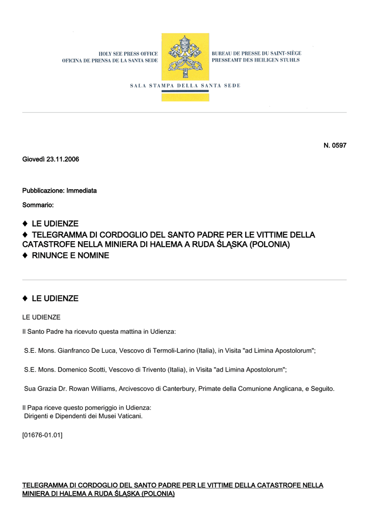 N. 0597 Giovedì 23.11.2006 Pubblicazione: Immediata Sommario: ♦ LE UDIENZE ♦ TELEGRAMMA DI CORDOGLIO DEL SANTO PADRE PER LE VITTIME DELLA CATASTROFE NELLA MINIERA DI HALEMA A RUDA ŚLĄSKA (POLONIA) ♦ RINUNCE E NOMINE ♦ LE UDIENZE LE UDIENZE Il Santo Padre ha ricevuto questa mattina in Udienza: S.E. Mons. Gianfranco De Luca, Vescovo di Termoli-Larino (Italia), in Visita "ad Limina Apostolorum"; S.E. Mons. Domenico Scotti, Vescovo di Trivento (Italia), in Visita "ad Limina Apostolorum"; Sua Grazia Dr. Rowan Williams, Arcivescovo di Canterbury, Primate della Comunione Anglicana, e Seguito. Il Papa riceve questo pomeriggio in Udienza: Dirigenti e Dipendenti dei Musei Vaticani. [01676-01.01] TELEGRAMMA DI CORDOGLIO DEL SANTO PADRE PER LE VITTIME DELLA CATASTROFE NELLA MINIERA DI HALEMA A RUDA ŚLĄSKA (POLONIA) Bollettino N. 0597 - 23.11.2006 2 Pubblichiamo di seguito il telegramma di cordoglio che il Santo Padre Benedetto XVI ha inviato - tramite il Segretario di Stato, l’Em.mo Card. Tarcisio Bertone - al Metropolita di Katowice, S.E. Mons. Damian Zimoń, per le vittime della catastrofe, avvenuta ieri pomeriggio, nella miniera di Halema a Ruda Śląska (Polonia): ● TELEGRAMMA DEL SANTO PADRE JEGO EKSCELENCJA KS. ABP DAMIAN ZIMOŃ METROPOLITA KATOWICKI KATOWICE JEGO ŚWIĄTOBLIWOŚĆ BENEDYKT XVI Z BÓLEM PRZYJĄŁ WIADOMOŚĆ O KATASTROFIE, JAKA W DNIU WCZORAJSZYM WYDARZYŁA SIĘ W KOPALNI WĘGLA KAMIENNEGO HALEMBA, W KTÓREJ PONIOSŁO ŚMIERĆ OŚMIU GÓRNIKÓW, A O PIĘTNASTU NIE MA NADAL WIEŚCI. OJCIEC ŚWIĘTY ZAWIERZA DUSZE ZMARŁYCH MIŁOSIERNEMU BOGU, PROSZĄC, ABY PRZYJĄŁ OFIARĘ ICH TRUDU I ŻYCIA, I BY WPROWADZIŁ ICH DO SWEJ CHWAŁY. POLECA OPIECE BOŻEJ TYCH, KTÓRZY – JAK MAMY NADZIEJĘ – ZOSTALI OCALENI. SERDECZNĄ MODLITWĄ OTACZA RODZINY ZMARŁYCH I WSZYSTKICH, KTÓRZY OPŁAKUJĄ ICH NAGŁE ODEJŚCIE. Z SERCA UDZIELA IM SWEGO APOSTOLSKIEGO BŁOGOSŁAWIEŃSTWA, KTÓRYM OBEJMUJE CAŁĄ ARCHIDIECEZJĘ KATOWICKĄ. WATYKAN, 22 LISTOPADA 2006 R. KARD. TARCISIO BERTONE SEKRETARZ STANU [A SUA ECCELLENZA MONS. DAMIAN ZIMOŃ METROPOLITA DI KATOWICE KATOWICESUA SANTITÀ BENEDETTO XVI CON DOLORE HA COLTO L’INFORMAZIONE SULLA CATASTROFE, CHE È SUCCESSA IERI NELLA MINIERA DI CARBONE HALEMBA, E NELLA QUALE OTTO MINATORI SONO MORTI E DI ALTRI QUINDICI FINORA NON CI SONO NOTIZIE1.IL SANTO PADRE AFFIDA LE ANIME DEI MORTI ALLA MISERICORDIA DI DIO, CHIEDENDO DI ACCOGLIERE L’OFFERTA DELLA LORO FATICA E DELLA VITA, E DI INTRODURLI NELLA SUA GLORIA. ALLA PROTEZIONE DIVINA RACCOMANDA COLORO CHE – COME SPERIAMO – SONO SALVI. CON UNA CORDIALE PREGHIERA ABBRACCIA LE FAMIGLIE DEI MORTI E TUTTI COLORO CHE PIANGONO LA LORO IMPROVVISA SCOMPARSA. IMPARTE LORO LA BENEDIZIONE APOSTOLICA, CHE ESTENDE A TUTTA L’ARCIDIOCESI DI KATOWICE.VATICANO, 22 NOVEMBRE 2006CARD. TARCISIO BERTONE SEGRETARIO DI STATO] _________________ 1 Successivamente si è appreso che quanti erano stati dati per dispersi sono risultati poi anche essi purtroppo periti nella catastrofe.[01681-09.01] [Testo originale: Polacco] RINUNCE E NOMINE● NOMINA DI CONSIGLIERE DELLA PONTIFICIA COMMISSIONE PER L’AMERICA LATINAIl Santo Padre ha nominato Consigliere della Pontificia Commissione per l’America Latina l’Em.mo Card. Ivan Dias, Prefetto della Congregazione per l’Evangelizzazione dei Popoli.[01677-01.01][B0597-XX.02]