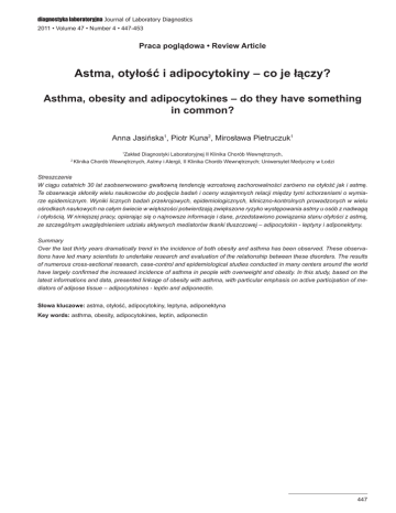 diagnostyka laboratoryjna Journal of Laboratory Diagnostics 2011 • Volume 47 • Number 4 • 447-453 Praca poglądowa • Review Article Astma, otyłość i adipocytokiny – co je łączy? Asthma, obesity and adipocytokines – do they have something in common? Anna Jasińska1, Piotr Kuna2, Mirosława Pietruczuk1 Zakład Diagnostyki Laboratoryjnej II Klinika Chorób Wewnętrznych, Klinika Chorób Wewnętrznych, Astmy i Alergii, II Klinika Chorób Wewnętrznych; Uniwersytet Medyczny w Łodzi 1 2 Streszczenie W ciągu ostatnich 30 lat zaobserwowano gwałtowną tendencję wzrostową zachorowalności zarówno na otyłość jak i astmę. Te obserwacje skłoniły wielu naukowców do podjęcia badań i oceny wzajemnych relacji między tymi schorzeniami o wymiarze epidemicznym. Wyniki licznych badań przekrojowych, epidemiologicznych, kliniczno-kontrolnych prowadzonych w wielu ośrodkach naukowych na całym świecie w większości potwierdzają zwiększone ryzyko występowania astmy u osób z nadwagą i otyłością. W niniejszej pracy, opierając się o najnowsze informacje i dane, przedstawiono powiązania stanu otyłości z astmą, ze szczególnym uwzględnieniem udziału aktywnych mediatorów tkanki tłuszczowej – adipocytokin - leptyny i adiponektyny. Summary Over the last thirty years dramatically trend in the incidence of both obesity and asthma has been observed. These observations have led many scientists to undertake research and evaluation of the relationship between these disorders. The results of numerous cross-sectional research, case-control and epidemiological studies conducted in many centers around the world have largely confirmed the increased incidence of asthma in people with overweight and obesity. In this study, based on the latest informations and data, presented linkage of obesity with asthma, with particular emphasis on active participation of mediators of adipose tissue – adipocytokines - leptin and adiponectin. Słowa kluczowe:astma, otyłość, adipocytokiny, leptyna, adiponektyna Key words:asthma, obesity, adipocytokines, leptin, adiponectin 447