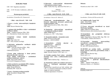 8. Zdravotná a ošetrovateľská dokumentácia v informačnom systéme Cygnus Autor: Kubín Peter Ing., Spoločnosť IRe Soft s.r.o. 28.06.2013 Piatok 8:00 - 9.00 Registrácia účastníkov 9:00 - 12:30 Otvorenie konferencie, príhovory hostí Harmonogram prednášok Diskusia Prestávka na obed 13.00 - 14.00 Diskusia Prestávka 11.00 - 11.20 3. Blok- aula J.Pavla II 14.00- 16.00 2. Blok - Aula J.Pavla II. 11.20 - 13-00 ---------------------------------------------------------------------------------------------------------------------------------------------------------------------------------------------------------------------------------------------------------------------------------------------------- koordinátori: Kosturíková M., Kamanová,I. koordinátori: Ibosová H.- Bokros E.. koordinátori: Divišová,M-Šavrnochová,M. 1. Proces a tvorba ošetrovateľských štandardov v ZSS. Autor: Ibosová Henrieta Mgr 9. Budovanie interdisciplinárneho tímu v hlavných (odborných) procesoch poskytovania sociálnych služieb v ZSS. Autor: Mária Kovaľová, PhDr., PhD., MHA UKF, Nitra 16. Validácia podľa Naomi Feil Autor: Mária Wirth , MUDr. Pozvaná prednáška 2. Ageizmus jeho špecifiká a výskyt v zariadeniach sociálnych služieb. Autor: Zrubáková Katarína, PhDr., PhD., KU v Ružomberku, Fakulta zdravotníctva 10. Monitoring ošetrovateľskej v zariadeniach sociálnych služieb Autor: Erika Bokros Ad usum, n.o., CSS – Veľký Meder 3. Empirický výskum hodnôt náboženstva Autor: Mgr. Ľubor Gál UKF v Nitre, Katedra sociológie 11. Komunitné jednotky – komunitné centrá Autor: Kočanová Ľubica Mgr. Bratislava - ADOS HARRIS 1 Blok - Aula J.Pavla II. 9.00 - 11.00 katolíckeho 4. Aktivizácia prijímateľov sociálnych z aspektu kvality Autor: Tokovská, Miroslava,PhDr., PhD., Jana Šolcová, Mgr., PhD. UMB Banská Bystrica služieb 5. Formy usług realizowane w domu pomocy społecznej dla osób starszych Formy služieb realizovaných v zariadeniach sociálnych služieb pre seniorov Autor: mgr Ewelina Zdebska, Uniwersytet Pedagogiczny Kraków 6. Dobre praktyki na przykładzie DPS w Kaliszu Príklady dobrej praxe v DPD Kalisz Autor: Renata Kobierska Riaditeľka DPS - Kalisz PL 7. Sestra v Zariadení sociálnych služieb Autor: Kosturíková Margita PhDr. SK SaPA 12. Komunikácia s ľuďmi Alzheimerovou demenciu Autor: Eva Toldiová Bc. ZSS „Vek nádeje“ Nové Zámky starostlivosti chorými 17. Úrovne zdravotnej starostlivosti na území Maďarskej republiky. Autor: Hüttnerné Szabados Mária Maďarská komora zdravotníckych pracovníkov 18. Komunikácia ako predpoklad efektívnej edukácie seniora. Autor: Magerčiaková Mariana PhDr. Mgr. PhD. KU v Ružomberku, Fakulta zdravotníctva na 13. Využití moderní techniky v ošetřovatelství. Autor: Miroslav Bouška LINET spol. s.r.o. 14. Výsledky projektu Nutri Action – národného skríningu stavu výživy u inštitucionalizovaných seniorov. Autor: Odrlová Barbora Mgr. – Nutrícia s.r.o. 15. Organizacja opieki nad osobami starszymi w Polsce w wybranych instytucjach pomocy społecznej. Organizovanie starostlivosti pre ľudí vyššieho veku v PL ( vo vybraných inštitúciách sociálnych služieb) Autor: dr Andrzej Grudziński Akademia Ignatianum w Krakowie 19. Procesuálne štandardy ošetrovateľskej starostlivosti v zariadení SUBSIDIUM Autor: Lengyelová Tímea Bc. ŠZ, ZpS, DSS Subsidium Rožňava 20. HUMISS pre sociálne služby, germicidné žiariče, matrace, odsávačky, gastronómia, trendy a technológia Autor: Huličiak Miroslav Mgr., Humiss spol. s.r.o. 21. Pohoda pre klienta, pomoc pre personál (Nové trendy v používaní inkontinenčných podložiek) Autor: Melanie Vargha dipl.z.s., Salesianer Miettex s.r.o., Bratislava Diskusia Prestávka 16.00-16.15 4. Blok - sekcia A- Aula J.Pavla II. 16.15 - 18.00 4. Blok - sekcia B - UPC ___________________________________________ koordinátori: Kamanová,I.- Domoterová,M. koordinátori:Sárová,A.- Kostúriková,M 22. Mám Alzheimerovu chorobu, ako ďalej? Autor: Helena Vavrúšová PhDr. Vysoká škola zdravotníctva a sociálnej práce Bratislava 23. Poskytovanie sociálnej starostlivosti Maďarsku Autor: Gyöngyösiné Hoffer Szilvia Maďarská komora zdravotníckych pracovníkov v 24. Rola pracownika socjalnego w działaniach prozdrowotnych u osób starszych w Domu Pomocy Społecznej Úloha sociálneho pracovníka v oblasti zdravia u osôb vyššieho veku v zariadeniach sociálnych služieb. Autor: dr hab. Norbert Pikuła UP, Kraków 25. Edukácia seniorov Autor: Helena Kuberová, Doc., PhD., PhD. Břetislav Vozník Mgr KU v Ružomberku, Fakulta zdravotníctva 26. Čo robí komora pre sestry Autor: Bc. Daniela Baníková- Baštigálová UVN - Ružomberok 27. Starostlivosť o inkontinentných z praktického, ekonomického a ekologického hľadiska Autor: Šebesta Otto ABENA – zastúpenie pre SR 28. Rola i zadania pracownika socjalnego w aktywizacji seniorów. Postavenie a úlohy sociálneho pracovníka v aktivizácii seniorov. Autor: Ewa Kucharska VADIMET - Kraków 29. Formy uczestnictwa i aktywności artystycznej osób starszych Formy aktivizácia u starších osôb Autor: dr Marek Banach Uniwersytet Pedagogiczny Kraków 30. Pomoc społeczna względem osób starszych na przykładzie działalności Sociálna pomoc pre seniorov na príklade podnikania Autor: dr Józefa Matejek Uniwersytet Pedagogiczny Kraków 31. Aktywizacja społeczna seniorów w Polsce Aktivizácia seniorov v Poľsku Autor: dr Katarzyna Jagielska Współpraca z Uniwersytetem Pedagogicznym w Krakowie 32. Pojęcie ubóstwa i biedy w nauczaniu społecznym biskupa Jana Chrapka Koncept chudoby a deprivácie v sociálnom učení biskupa Jána Chrapeka Autor: mgr Małgorzata Janiec Uniwersytet Papieski Jana Pawła II w Krakowie w Radomiu mieszka. 33. Regulacje prawne funkcjonowania Domów Pomocy Społecznej w Polsce Autor: dr Bodusław Ulejasz, KUL, Lublin 34. Rola, zadania i obow