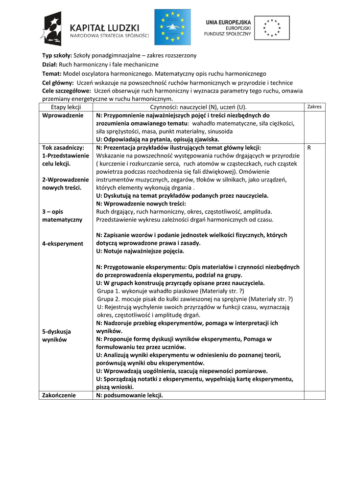 [Wpisz tekst] Typ szkoły: Szkoły ponadgimnazjalne – zakres rozszerzony Dział: Ruch harmoniczny i fale mechaniczne Temat: Model oscylatora harmonicznego. Matematyczny opis ruchu harmonicznego Cel główny: Uczeń wskazuje na powszechność ruchów harmonicznych w przyrodzie i technice Cele szczegółowe: Uczeń obserwuje ruch harmoniczny i wyznacza parametry tego ruchu, omawia przemiany energetyczne w ruchu harmonicznym. Zakres Etapy lekcji Czynności: nauczyciel (N), uczeń (U). Wprowadzenie N: Przypomnienie najważniejszych pojęć i treści niezbędnych do zrozumienia omawianego tematu: wahadło matematyczne, siła ciężkości, siła sprężystości, masa, punkt materialny, sinusoida U: Odpowiadają na pytania, opisują zjawiska. Tok zasadniczy: N: Prezentacja przykładów ilustrujących temat główny lekcji: R 1-Przedstawienie Wskazanie na powszechność występowania ruchów drgających w przyrodzie celu lekcji. ( kurczenie i rozkurczanie serca, ruch atomów w cząsteczkach, ruch cząstek powietrza podczas rozchodzenia się fali dźwiękowej). Omówienie 2-Wprowadzenie instrumentów muzycznych, zegarów, tłoków w silnikach, jako urządzeń, nowych treści. których elementy wykonują drgania . U: Dyskutują na temat przykładów podanych przez nauczyciela. N: Wprowadzenie nowych treści: 3 – opis Ruch drgający, ruch harmoniczny, okres, częstotliwość, amplituda. matematyczny Przedstawienie wykresu zależności drgań harmonicznych od czasu. 4-eksperyment 5-dyskusja wyników Zakończenie N: Zapisanie wzorów i podanie jednostek wielkości fizycznych, których dotyczą wprowadzone prawa i zasady. U: Notuje najważniejsze pojęcia. N: Przygotowanie eksperymentu: Opis materiałów i czynności niezbędnych do przeprowadzenia eksperymentu, podział na grupy. U: W grupach konstruują przyrządy opisane przez nauczyciela. Grupa 1. wykonuje wahadło piaskowe (Materiały str. ?) Grupa 2. mocuje pisak do kulki zawieszonej na sprężynie (Materiały str. ?) U: Rejestrują wychylenie swoich przyrządów w funkcji czasu, wyznaczają okres, częstotliwość i amplitudę drgań. N: Nadzoruje przebieg eksperymentów, pomaga w interpretacji ich wyników. N: Proponuje formę dyskusji wyników eksperymentu, Pomaga w formułowaniu tez przez uczniów. U: Analizują wyniki eksperymentu w odniesieniu do poznanej teorii, porównują wyniki obu eksperymentów. U: Wprowadzają uogólnienia, szacują niepewności pomiarowe. U: Sporządzają notatki z eksperymentu, wypełniają kartę eksperymentu, piszą wnioski. N: podsumowanie lekcji. [Wpisz tekst] Karta eksperymentu Temat eksperymentu Instrukcja wykonania Obserwacje (opisujemy w punktach przebieg eksperymentu: przyczyna skutek) Szacujemy błędy i niepewności pomiaru Wnioski (odniesienie do teorii) Rejestracja drgań wahadła matematycznego Z lejka i sznurka wykonujemy wahadło takie, jak pokazane na zdjęciu w Materiałach str. ?. Zawieszamy wahadło nisko nad ciemnym pasem gumy, wsypujemy do lejka piasek i wprawiamy wahadło w drgania w kierunku prostopadłym do dłuższego boku pasa . Przesuwamy równomiernie pas gumy i obserwujemy, jaki ślad zostawia piasek na pasie. Na podstawie uzyskanego wykresu wyznaczamy amplitudę, okres oraz częstotliwość drań wahadła. Określamy, jak zmieniała się prędkość wahadła w miarę upływu czasu. [Wpisz tekst] Karta eksperymentu Temat eksperymentu Instrukcja wykonania Rejestracja drgań ciężarka zawieszonego na sprężynie Mocujemy pisak do ciężarka za pomocą plasteliny, tak aby był prostopadły do sprężyny. Umieszczamy pionowo tekturkę, tak aby koniec pisaka dosięgał do niej. Wprawiamy sprężynę w drgania, o amplitudzie nie przekraczającej szerokości tektury. Przesuwamy równomiernie tekturę w bok i obserwujemy ślad zostawiony przez pisak. Na podstawie uzyskanych wykresów wyznaczamy okres drgań, częstotliwość i amplitudę drgań ciężarka na sprężynie. Oceniamy jaki wpływ na wyniki ma opór jaki stawia pisak dotykający do tektury. Obserwacje (opisujemy w punktach przebieg eksperymentu: przyczyna skutek) Szacujemy błędy i niepewności pomiaru Wnioski (odniesienie do teorii)