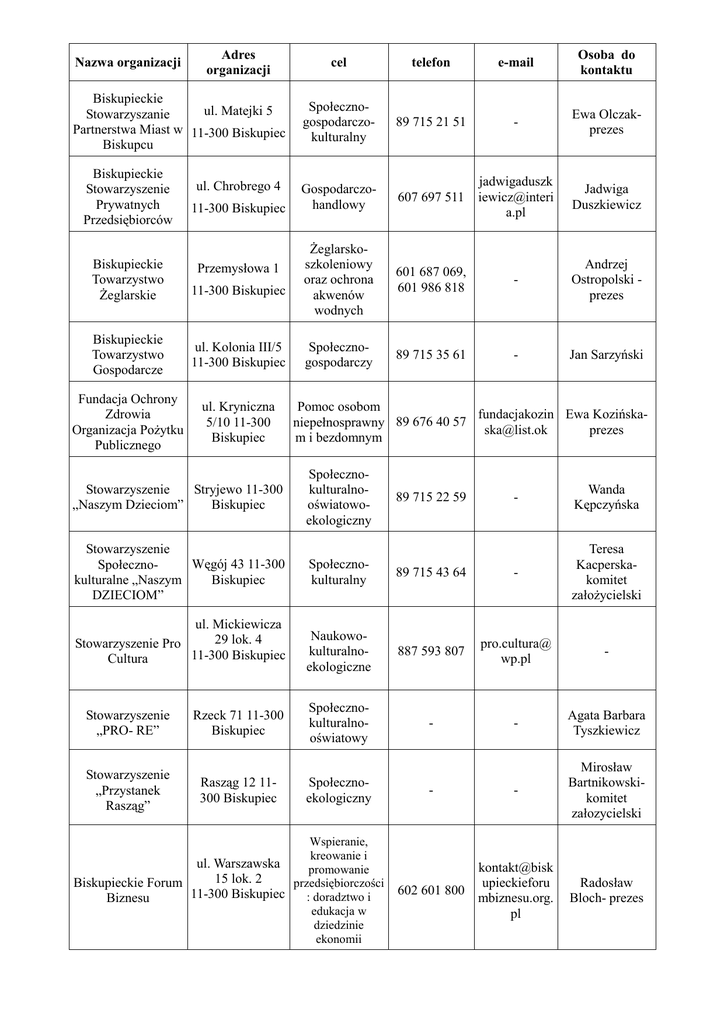 Nazwa organizacji Adres organizacji Biskupieckie ul. Matejki 5 Stowarzyszanie Partnerstwa Miast w 11-300 Biskupiec Biskupcu Biskupieckie Stowarzyszenie Prywatnych Przedsiębiorców Biskupieckie Towarzystwo Żeglarskie ul. Chrobrego 4 11-300 Biskupiec Przemysłowa 1 11-300 Biskupiec Biskupieckie Towarzystwo Gospodarcze ul. Kolonia III/5 11-300 Biskupiec Fundacja Ochrony Zdrowia Organizacja Pożytku Publicznego ul. Kryniczna 5/10 11-300 Biskupiec cel telefon e-mail Osoba do kontaktu Społecznogospodarczokulturalny 89 715 21 51 - Ewa Olczakprezes Gospodarczohandlowy 607 697 511 jadwigaduszk iewicz@interi a.pl Jadwiga Duszkiewicz Żeglarskoszkoleniowy oraz ochrona akwenów wodnych 601 687 069, 601 986 818 - Andrzej Ostropolski prezes Społecznogospodarczy 89 715 35 61 - Jan Sarzyński Pomoc osobom fundacjakozin Ewa Kozińskaniepełnosprawny 89 676 40 57 [email protected] prezes m i bezdomnym Stowarzyszenie Stryjewo 11-300 „Naszym Dzieciom” Biskupiec Społecznokulturalnooświatowoekologiczny Stowarzyszenie Węgój 43 11-300 Społecznokulturalne „Naszym Biskupiec DZIECIOM” Społecznokulturalny ul. Mickiewicza 29 lok. 4 Stowarzyszenie Pro 11-300 Biskupiec Cultura - Wanda Kępczyńska 89 715 43 64 - Teresa Kacperskakomitet założycielski Naukowokulturalnoekologiczne 887 593 807 pro.cultura@ wp.pl - - - Agata Barbara Tyszkiewicz - - Mirosław Bartnikowskikomitet załozycielski 602 601 800 kontakt@bisk upieckieforu mbiznesu.org. pl Radosław Bloch- prezes Stowarzyszenie „PRO- RE” Rzeck 71 11-300 Biskupiec Społecznokulturalnooświatowy Stowarzyszenie „Przystanek Rasząg” Rasząg 12 11300 Biskupiec Społecznoekologiczny Wspieranie, kreowanie i ul. Warszawska promowanie 15 lok. 2 Biskupieckie Forum przedsiębiorczości 11-300 Biskupiec : doradztwo i Biznesu edukacja w dziedzinie ekonomii 89 715 22 59 Stowarzyszenie Kobiet „Barwy Warmii” Polskie Stowarzyszenie na rzecz Osób z Upośledzeniem Umysłowym Koło w Biskupcu ul. Parkowa 10 11-300 Biskupiec Społecznokulturalnoekologiczny Działania na rzecz otyłości Stowarzyszenie na rzecz Wspierania i Rozwoju Oświaty „Żak” w Biskupcu Oświatowoedukacyjnoszkolny ul. Armii Krajowej 2 11-300 Biskupiec al. Niepodległości 4 11-300 Biskupiec Stowarzyszenie Pomocy ul. Kościuszki 4 Humanitarnej „Św. 11-300 Biskupiec Łazarza” w Biskupcu Stowarzyszenie Przyjaciół Szkoły „Dwójeczka” ul. Mickiewicza 8 11-300 Biskupiec Stowarzyszenie Rozwoju Wsi Borki Borki Wielkie 35 Wielkie, Kamionka, 11-300 Biskupiec Sadowo i Parleza Wielka Stowarzyszenie Rozwoju Wsi Bredynki i Stanclewo Stowarzyszenie Rozwoju Wszechstronnego „Pasja” [email protected] Anna Giżewskaprezes Działania na rzecz Jadwiga Teresa ul. Gdańska1 psouu_biskup wyrównywania 89 715 42 01 [email protected] szans osób 11-300 Biskupiec przewodnicząca niepełnosprawny ch Stowarzyszenie na rzecz ul. Przeciwdziałania Niepodległości 4 Otyłości „Żyj Zdrowo i Schudnij” 11-300 Biskupiec Smukli w Biskupcu Stowarzyszenie Pomocy Dziecku i Rodzinie „Barka” - Bredynki 24 11-300 Biskupiec Stryjewo 61 11-300 Biskupiec - [email protected] 89 715 50 50 l Zdzisław Kopczyńskiprezes Kazimierz Łastowski prezes Danuta Plucińska Społecznokulturalnoopiekuńczy 89 715 21 69 Humanitarnoopiekuńczosocjalny 89 715 31 90 lazarus04@w p.pl ks. Wiesław Badura Społecznokulturalnooświatowy 89 715 25 49 spsdwojeczka @wp.pl Marzena Wieczorekprezes - Bogumiła Pstrągowskaprezes wandaganko @wp.pl Wanda Gańko Społecznokulturalnogospodarczoturystyczny 89 716 16 64 Społecznokulturalnogospodarczy 89 715 39 74 spbredynki@ Piotr Aleksander wp.pl Twardowski - 502 201 630 aniawat@inte ria.pl Mieczysław Watros- prezes 89 715 27 16 joannakiejno @interia.pl Ireneusz Giglewiczprezes - - Antoni Szkolnoedukacyjny Towarzystwo „Przyjaciele Szkoły” 11-300 Biskupiec org. Pożytku publicznego Towarzystwo ul. Armii Społeczno- ul. Chrobrego 15 - Przyjaciół Ziemi Biskupieckiej Krajowej 11 11-300 Biskupiec kulturalnogospodarczy Parafinowicz Towarzystwo Rozwój oświaty, SpołecznoKulturalnie kultury i sztuki ul. Chrobrego 10 niemieckiej oraz Mniejszości 89 715 41 11 Niemieckiej na tradycji 11-300 Biskupiec Warmii i Mazurach warmińskich i mazurskich z siedzibą w Biskupcu Węgojskie Stowarzyszenie Edukacji Lokalnej CEL Węgój 19 11-300 Biskupiec Społecznokulturalnogospodarczy - podstawowka 89 715 24 18 _wegoj@inter ia.pl Przezwyciężanie trudnych Aleja Róż 3 Zakład Aktywności sytuacji 89 715 15 46 życiowych, Zawodowej 11-300 Biskupiec działalność wspierająca Jan Gutt Teresa Kacperska Czesław Kacperski kontakt@zaz biskupiec.pl Piotr Kubarewiczkierownik 601 986 818 [email protected] - ul. Armii Stowarzyszenie Stowarzyszenie Krajowej 7/1 11rodziców i „Nasza Przyszłość” 300 Biskupiec nauczycieli - - Katarzyna Kurdziel- prezes Wspieranie i Al. Biskupiecki rozpowszechnia Młodzieżowy Klub Niepodległości 2 nie kultury Sportowy „Korki” 11-300 Biskupiec fizycznej i sportu 601 094 718 - - - - - - - 89 715 06 66 - - 89 715 28 30 - - - Andrzej Zbigniew Ostropolskiprezes warminskomazurskie@p Elżbieta Żakprezes Stowarzyszenie „Nasz Dadaj” Al. Niepodległości 4A lok. 42 11-300 Biskupiec Klub Motocyklowy „Dark Order' ul. Mickiewicza 22a ul. Sadowa 6 Ochotnicza Straż Pożarna w Biskupcu 11-300 Biskupiec Rozwój wspólnot i społeczności lokalnych Ludowy Klub Kolarski „Warmia” Biskupiec Wspieranie i upowszechniani e kultury fizycznej i 11-300 Biskupiec sportu Komitet Budowy Sieci Wodnej i Kanalizacyjnej w Obrębie Rukławki Gmina Biskupiec działalność na ul. Szpitalna 16B rzecz budowy i lok. 5 11-300 eksploatacji sieci Biskupiec wodnej i kanalizacyjnej WarmińskoMazurski Odział al. Niepodległości 4a al. Niepodległości - Ekologia i 667 017 597 ochrona zwierząt Polskiej Federacji Kynologicznej 31 11-300 Biskupiec oraz ochrona dziedzictwa przyrodniczego fk.org.pl WarmńskoPomoc Mazurska Federacja bezrobotnym, ul. Chrobrego 26 Intergracji niepełnosprawny 