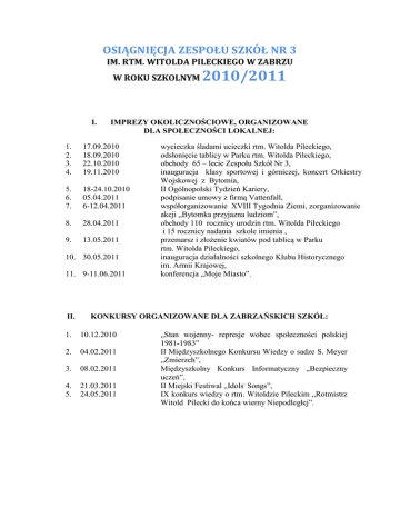 OSIĄGNIĘCJA ZESPOŁU SZKÓŁ NR 3 IM. RTM. WITOLDA PILECKIEGO W ZABRZU W ROKU SZKOLNYM I. IMPREZY OKOLICZNOŚCIOWE, ORGANIZOWANE DLA SPOŁECZNOŚCI LOKALNEJ: 1. 2. 3. 4. 17.09.2010 18.09.2010 22.10.2010 19.11.2010 5. 6. 7. 18-24.10.2010 05.04.2011 6-12.04.2011 8. 28.04.2011 9. 13.05.2011 10. 30.05.2011 11. 9-11.06.2011 II. 2010/2011 wycieczka śladami ucieczki rtm. Witolda Pileckiego, odsłonięcie tablicy w Parku rtm. Witolda Pileckiego, obchody 65 – lecie Zespołu Szkół Nr 3, inauguracja klasy sportowej i górniczej, koncert Orkiestry Wojskowej z Bytomia, II Ogólnopolski Tydzień Kariery, podpisanie umowy z firmą Vattenfall, współorganizowanie XVIII Tygodnia Ziemi, zorganizowanie akcji „Bytomka przyjazna ludziom”, obchody 110 rocznicy urodzin rtm. Witolda Pileckiego i 15 rocznicy nadania szkole imienia , przemarsz i złożenie kwiatów pod tablicą w Parku rtm. Witolda Pileckiego, inauguracja działalności szkolnego Klubu Historycznego im. Armii Krajowej, konferencja „Moje Miasto”. KONKURSY ORGANIZOWANE DLA ZABRZAŃSKICH SZKÓŁ: 1. 10.12.2010 2. 04.02.2011 3. 08.02.2011 4. 5. 21.03.2011 24.05.2011 „Stan wojenny- represje wobec społeczności polskiej 1981-1983” II Międzyszkolnego Konkursu Wiedzy o sadze S. Meyer „Zmierzch”, Międzyszkolny Konkurs Informatyczny „Bezpieczny uczeń”, II Miejski Festiwal „Idols, Songs”, IX konkurs wiedzy o rtm. Witoldzie Pileckim „Rotmistrz Witold Pilecki do końca wierny Niepodległej”. III. OSIĄGNIĘCIA UCZNIÓW: 1. DYDAKTYCZNE: finalista konkursu przedmiotowego z geografii dla szkół gimnazjalnych, finalista konkursu „Wygraj Brukselę”, III miejsce w województwie w Konkursie Elektronicznym pt:„ 60 lat Tranzystora…”, organizowany przez Zespół Szkół Technicznych i ogólnokształcących w Tarnowskich Górach, zakwalifikowanie się do 2 stopnia XXVI Olimpiady Wiedzy Technicznej (znajduje się ona na listach MEN), I miejsce w międzyszkolny konkurs „Ekologia w moim mieście”- na najlepszą prezentację multimedialną w kategorii gimnazjum, I miejsce w międzyszkolnym konkursie „Ekologia w moim mieście”na najlepszą prezentację multimedialną w kategorii szkół ponadgimnazjalnych, I i III miejsce w międzyszkolny zabrzański konkurs informatyczny „Bezpieczny uczeń”, wyróżnienie w ogólnopolskim konkursie zorganizowanym przez Centrum Edukacji Obywatelskiej oraz Instytut Dziedzictwa Narodowego „Dorzucić swoje. Atlas zabytków przemysłowych, uzyskanie przez uczniów tytułu „Strażnika Dziedzictwa” opublikowanie fotoreportażu „Atlas zabytków przemysłowych” przez Instytut Dziedzictwa Narodowego . 2. SPORTOWE: I miejsce w klasyfikacji indywidualnej Mistrzostwa Zabrza w pływaniu szkół gimnazjalnych stylem dowolnym, I miejsce w klasyfikacji indywidualnej Mistrzostwa Zabrza w pływaniu szkół gimnazjalnych stylem motylkowym, I miejsce w klasyfikacji indywidualnej Mistrzostwa Zabrza w pływaniu szkół gimnazjalnych stylem klasycznym, II miejsce w klasyfikacji indywidualnej Mistrzostwa Zabrza w pływaniu szkół gimnazjalnych stylem grzbietowym, II miejsce w klasyfikacji indywidualnej Mistrzostwa Zabrza w pływaniu szkół gimnazjalnych stylem motylkowym, II miejsce w Mistrzostwach Zabrza Szkół Ponadgimnazjalnych w piłce koszykowejdziewcząt, II miejsce w Mistrzostwach Zabrza Szkół Ponadgimnazjalnych w pływaniu dziewcząt, II miejsce w Mistrzostwach Zabrza Szkół Ponadgimnazjalnych w biegach na orientację dziewcząt, II miejsce w Mistrzostwach Zabrza Szkół Ponadgimnazjalnych w biegach na orientację chłopców, II miejsce w Mistrzostwach Zabrza Szkół Gimnazjalnych w zawodach pływackich Dziewcząt, III miejsce w Mistrzostwach Zabrza Szkół Ponadgimnazjalnych w piłce ręcznej Chłopców, III miejsce w Mistrzostwach Zabrza Szkół Ponadgimnazjalnych w piłce ręcznej siatkowej chłopców, III miejsce w Mistrzostwach Zabrza Szkół Ponadgimnazjalnych w piłce plażowej chłopców, III miejsce w Mistrzostwach Zabrza Szkół Ponadgimnazjalnych w zawodach pływackich chłopców, III miejsce w Mistrzostwach Zabrza Szkół Gimnazjalnych w dwuboju nowoczesnym chłopców, 3. ARTYSTYCZNE: II miejsce „Edukacja Regionalna w szkole”- konkurs wojewódzki, I miejsce w konkursie fotograficznym w ramach obchodów XVIII „Tydzień Ziemi”, I miejsce w konkursie leśny design w ramach obchodów XVIII „Tydzień Ziemi”, I miejsce na plakat w Międzyszkolnym konkursie „Ekologia w moim mieście”, I miejsce w konkursie fotograficznym „Wiosna w Zabrzu”, IV. WDROŻENIE NOWYCH KIERUNKÓW: klasa dziennikarska: spotkanie z aktorem Teatru Śląskiego, wizyta w Studio TVN24 w Warszawie, spotkanie z dziennikarzem TV Zabrze i operatorem kamery, zwiedzanie studia Telewizji Silesia w Katowicach, poznanie pracy dziennikarskiej, zwiedzanie studia Telewizji Zabrzańskiej z okazji urodzin stacji, zwiedzanie redakcji "Głosu Zabrza i Rudy Śl.", rozmowa z redaktorem naczelnym, przeglądanie roczników gazety, warsztaty dziennikarskie „Radio to nie tylko dźwięki” w WSB w Chorzowie, warsztaty dziennikarskie na temat wywiadu oraz etyki dziennikarskiej prowadzone przez studentów UŚ, klasa sportowa uczniowie zdali egzamin teoretyczny z szkolenia lotniczego, obóz sportowy – loty z instruktorem, klasa górnicza: wdrażanie specjalizacji, wyposażenie uczniów w pomoce dydaktyczne, V. INNE: współpraca z Wyższą Szkołą Bankową w Poznaniu oddział w Chorzowie, udział w ogólnopolskich obchodach Dnia Bezpiecznego Internetu.