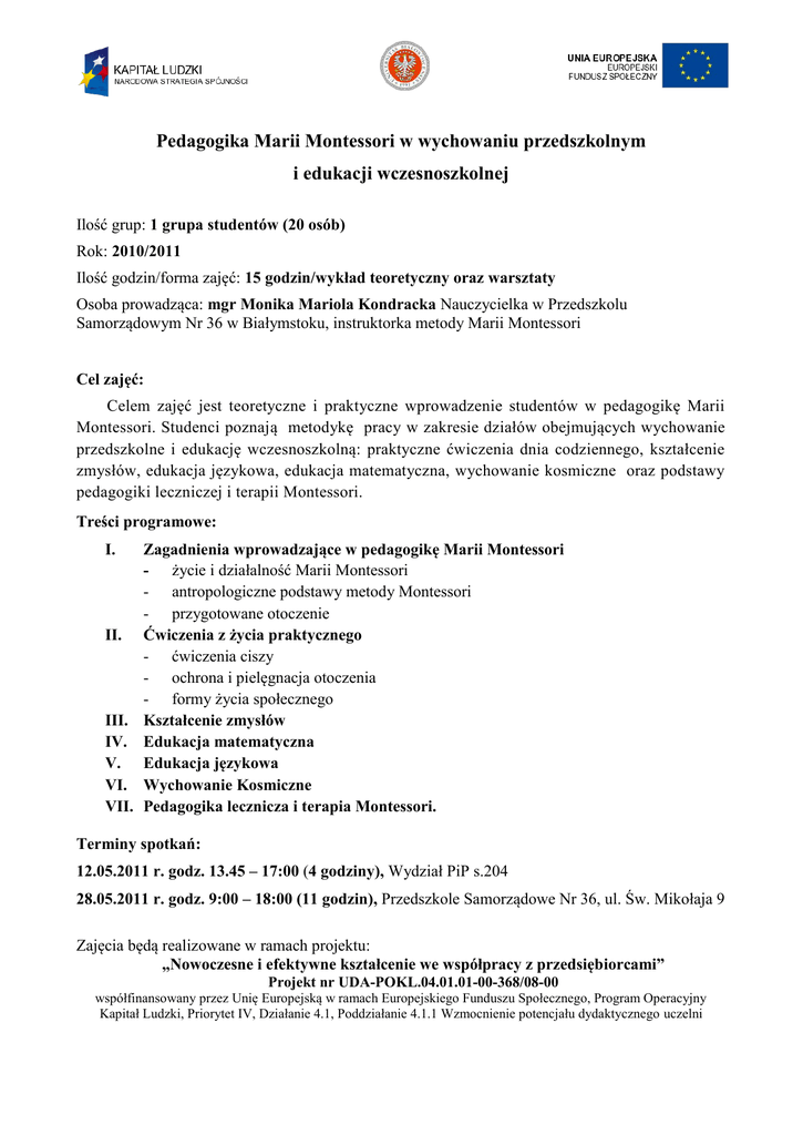 Pedagogika Marii Montessori w wychowaniu przedszkolnym i edukacji wczesnoszkolnej Ilość grup: 1 grupa studentów (20 osób) Rok: 2010/2011 Ilość godzin/forma zajęć: 15 godzin/wykład teoretyczny oraz warsztaty Osoba prowadząca: mgr Monika Mariola Kondracka Nauczycielka w Przedszkolu Samorządowym Nr 36 w Białymstoku, instruktorka metody Marii Montessori Cel zajęć: Celem zajęć jest teoretyczne i praktyczne wprowadzenie studentów w pedagogikę Marii Montessori. Studenci poznają metodykę pracy w zakresie działów obejmujących wychowanie przedszkolne i edukację wczesnoszkolną: praktyczne ćwiczenia dnia codziennego, kształcenie zmysłów, edukacja językowa, edukacja matematyczna, wychowanie kosmiczne oraz podstawy pedagogiki leczniczej i terapii Montessori. Treści programowe: I. II. III. IV. V. VI. VII. Zagadnienia wprowadzające w pedagogikę Marii Montessori - życie i działalność Marii Montessori - antropologiczne podstawy metody Montessori - przygotowane otoczenie Ćwiczenia z życia praktycznego - ćwiczenia ciszy - ochrona i pielęgnacja otoczenia - formy życia społecznego Kształcenie zmysłów Edukacja matematyczna Edukacja językowa Wychowanie Kosmiczne Pedagogika lecznicza i terapia Montessori. Terminy spotkań: 12.05.2011 r. godz. 13.45 – 17:00 (4 godziny), Wydział PiP s.204 28.05.2011 r. godz. 9:00 – 18:00 (11 godzin), Przedszkole Samorządowe Nr 36, ul. Św. Mikołaja 9 Zajęcia będą realizowane w ramach projektu: „Nowoczesne i efektywne kształcenie we współpracy z przedsiębiorcami” Projekt nr UDA-POKL.04.01.01-00-368/08-00 współfinansowany przez Unię Europejską w ramach Europejskiego Funduszu Społecznego, Program Operacyjny Kapitał Ludzki, Priorytet IV, Działanie 4.1, Poddziałanie 4.1.1 Wzmocnienie potencjału dydaktycznego uczelni